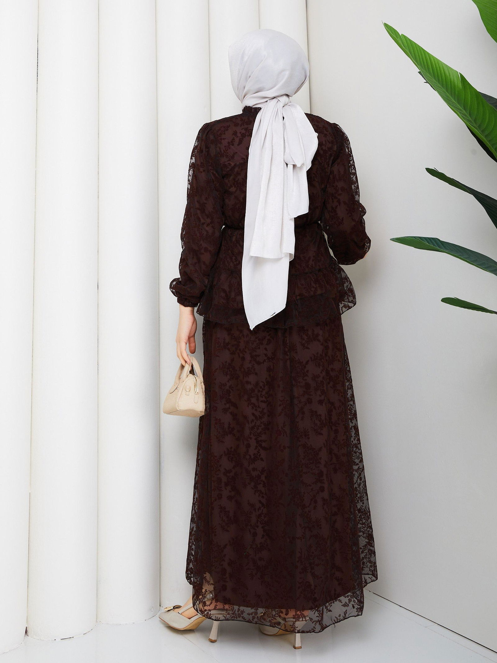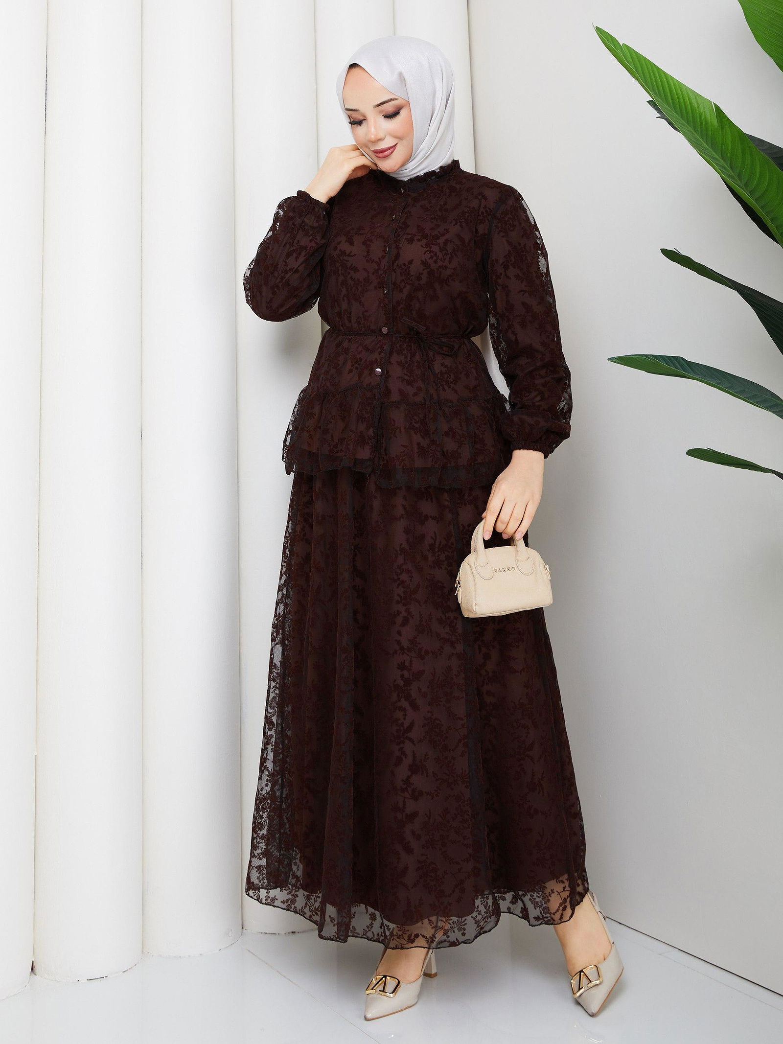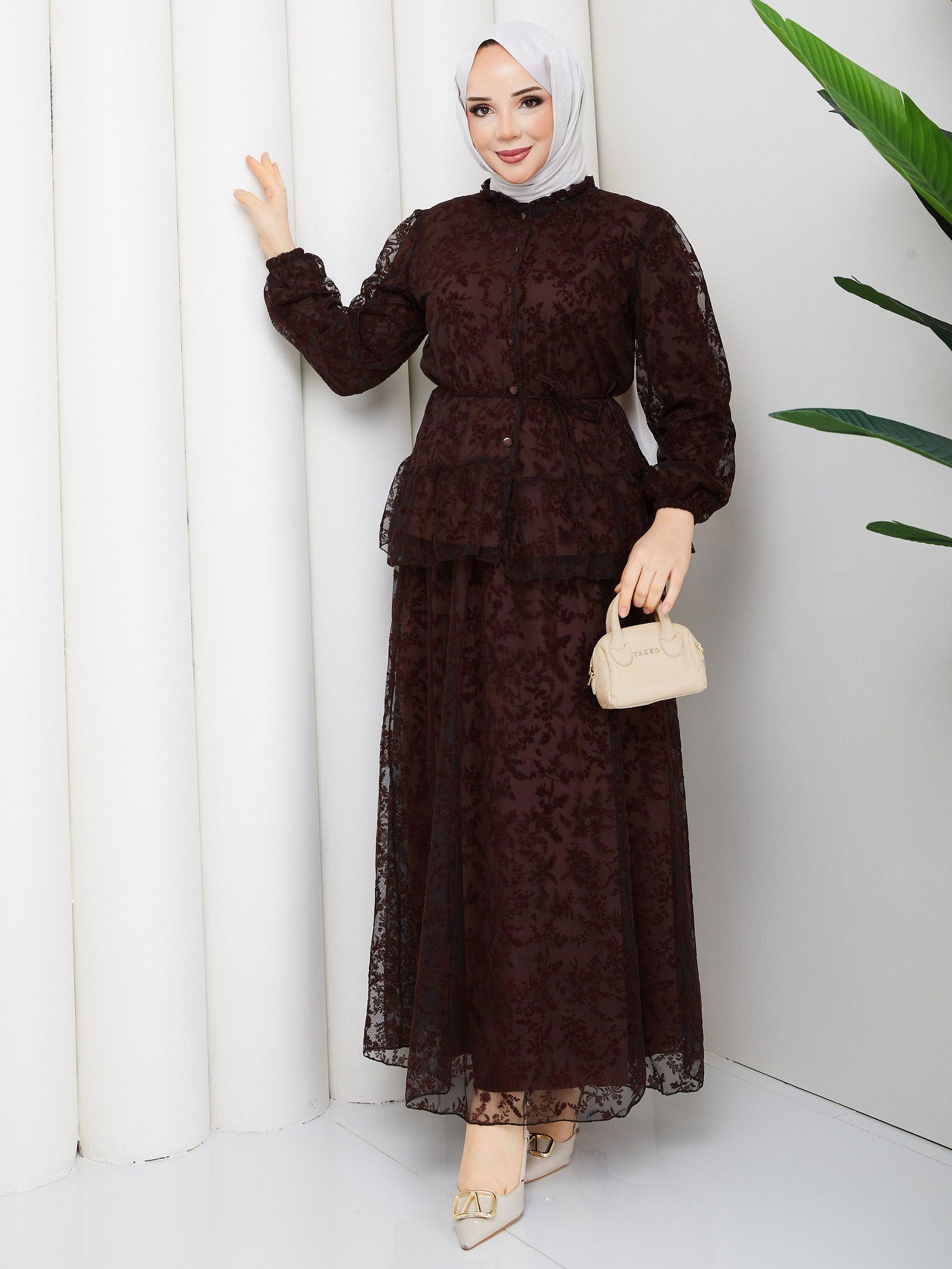 Baskı Detaylı Etekli İkili Takım-5100 Kahverengi