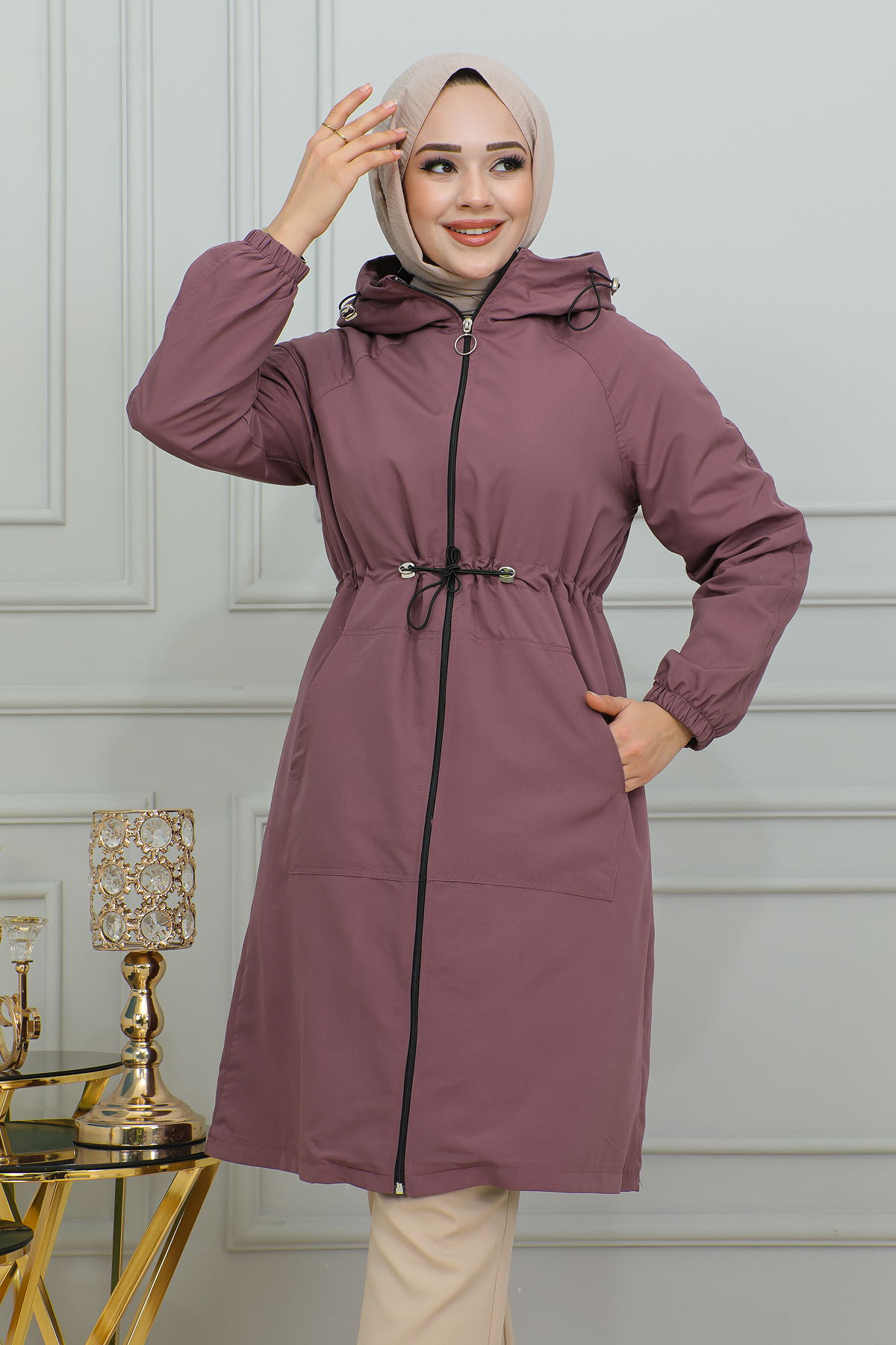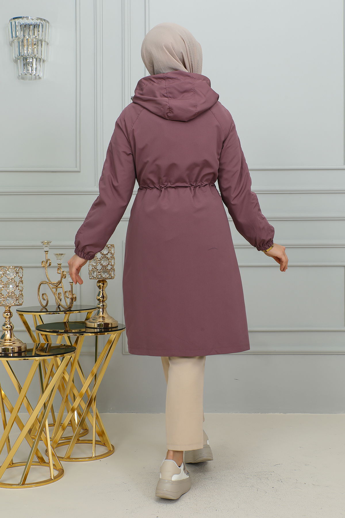 Belden Bağlamalı Kapşonlu Trençkot-1905 Gül kurusu