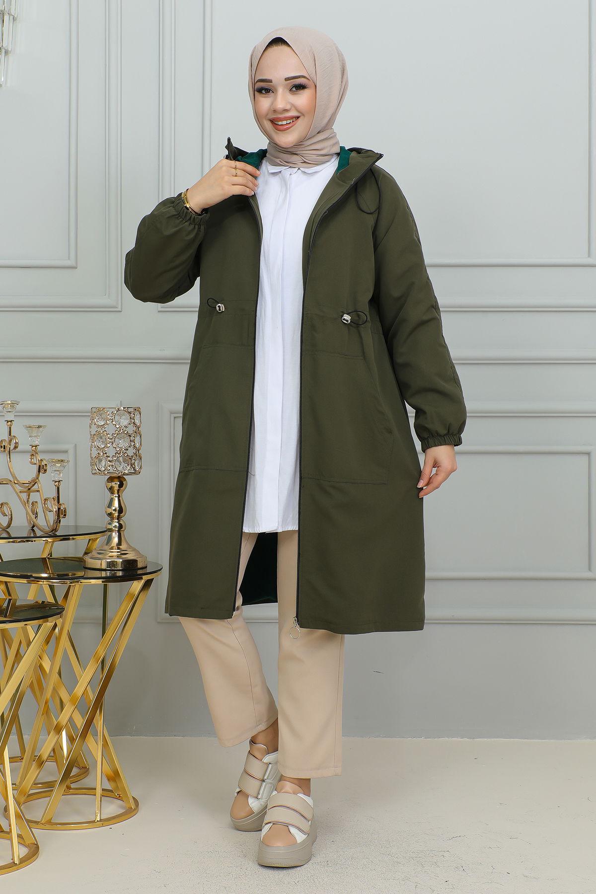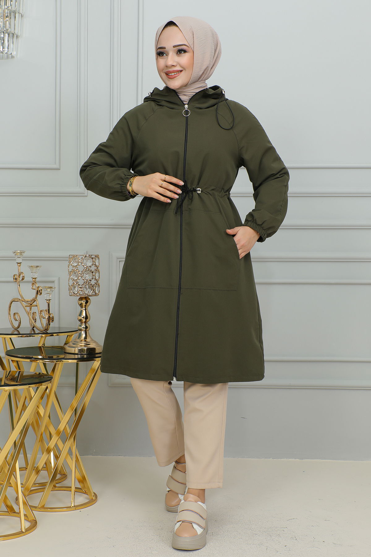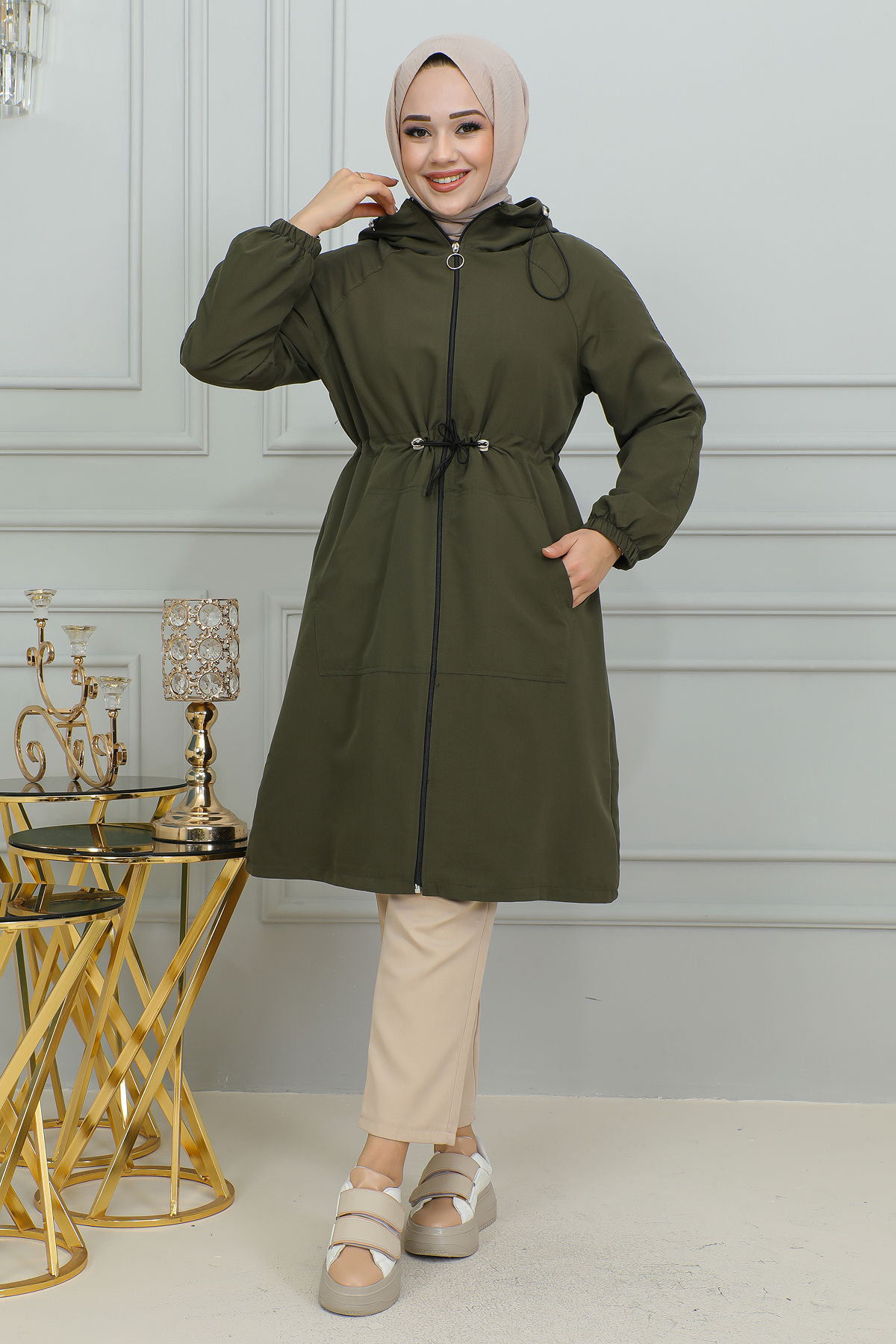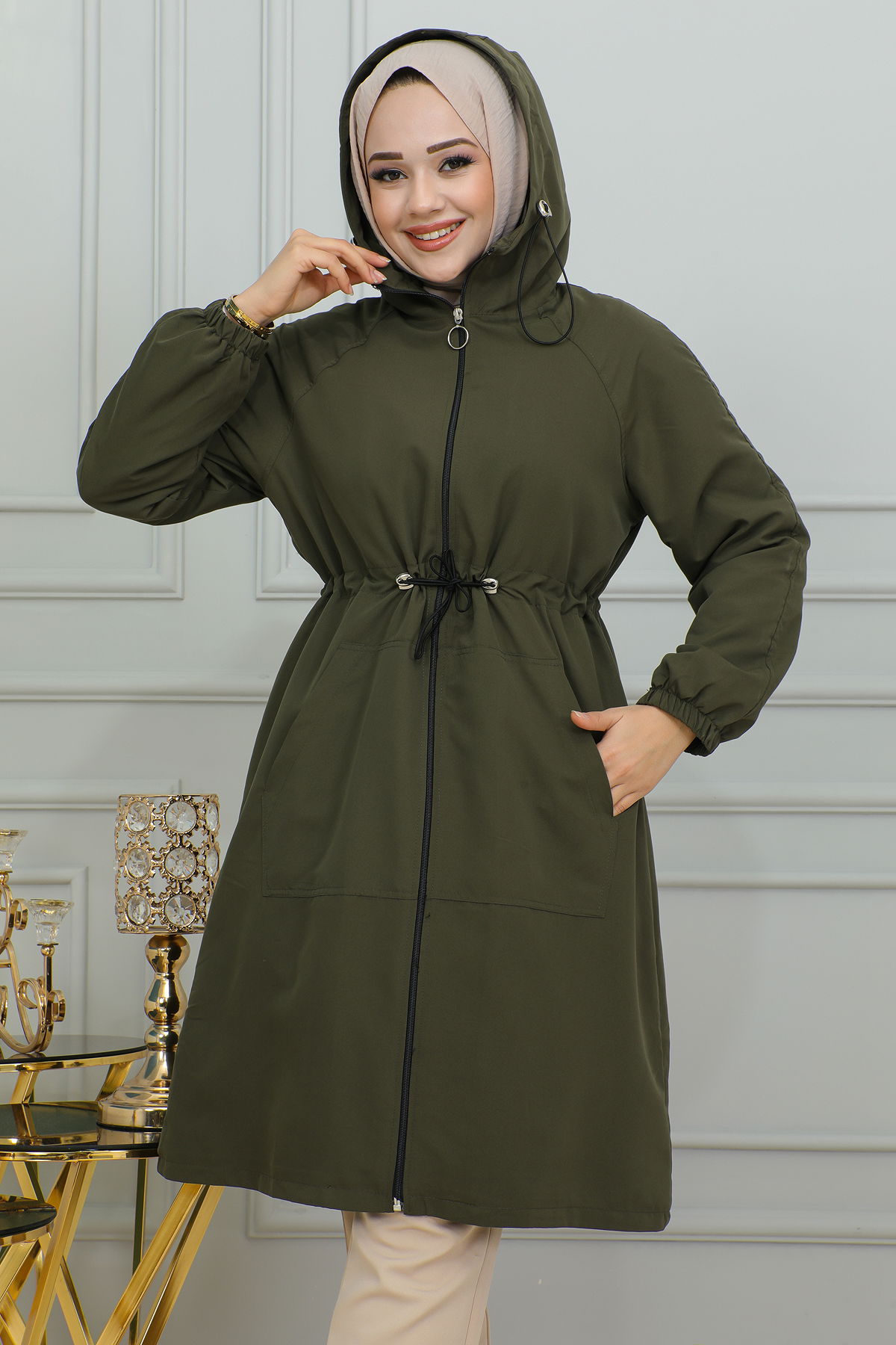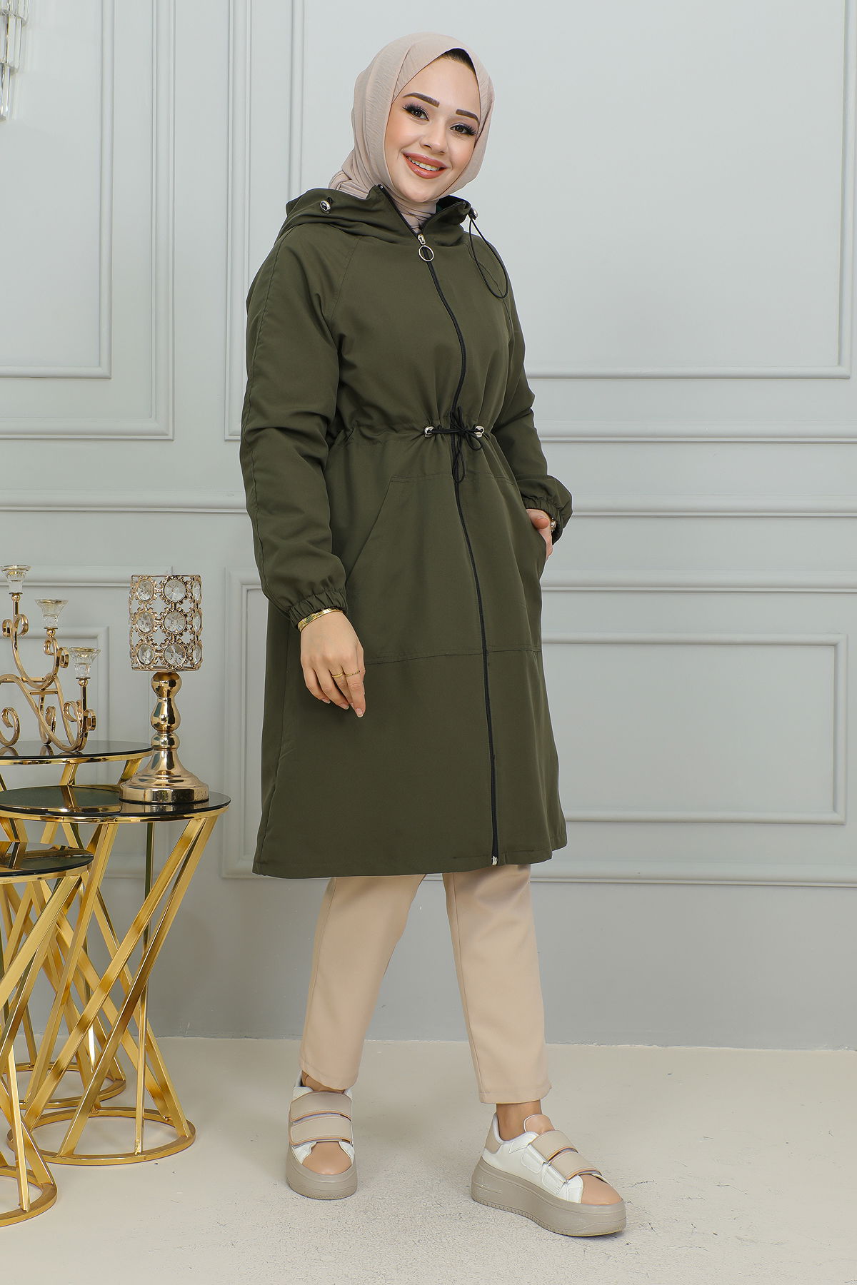 Belden Bağlamalı Kapşonlu Trençkot-1905 Haki yeşili