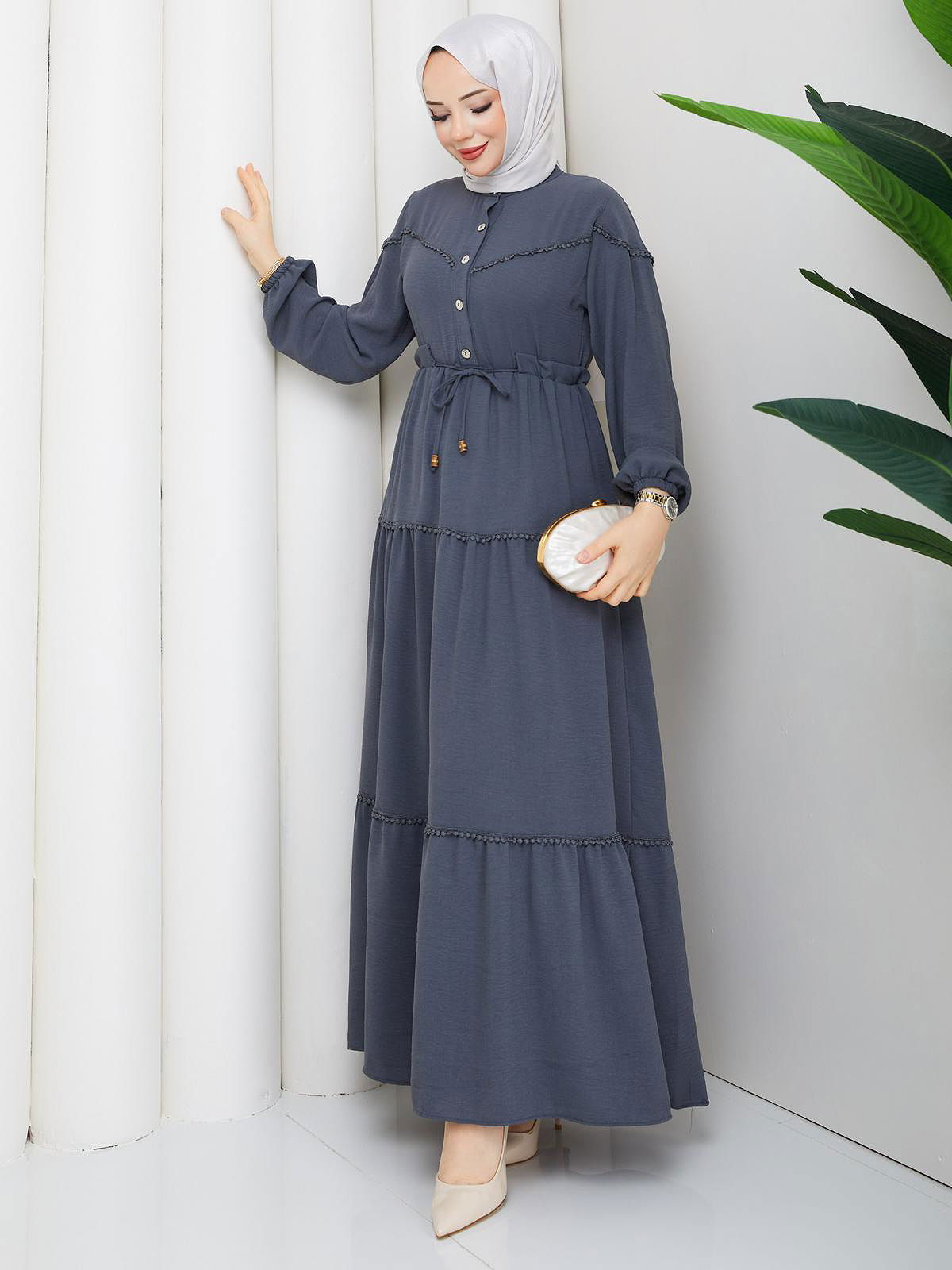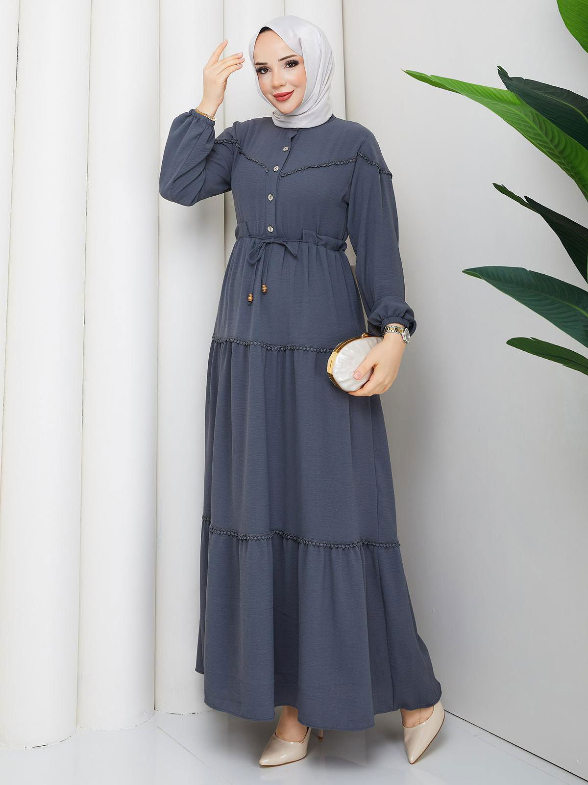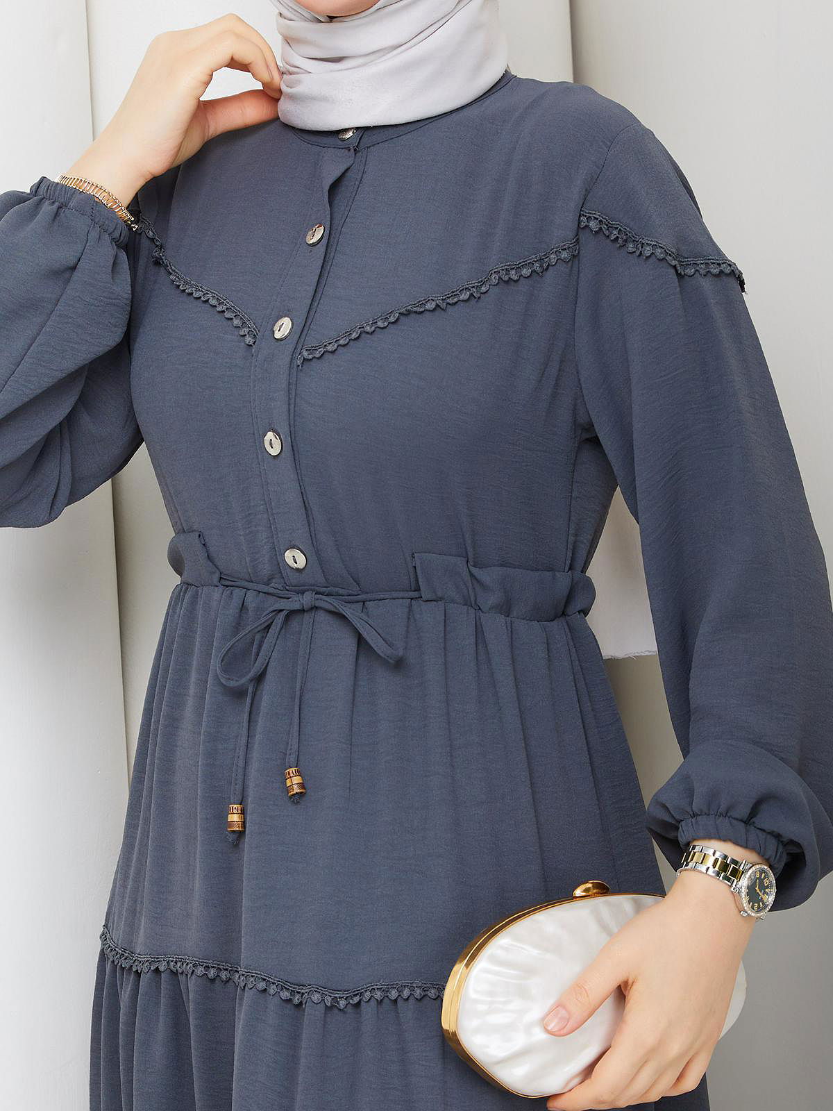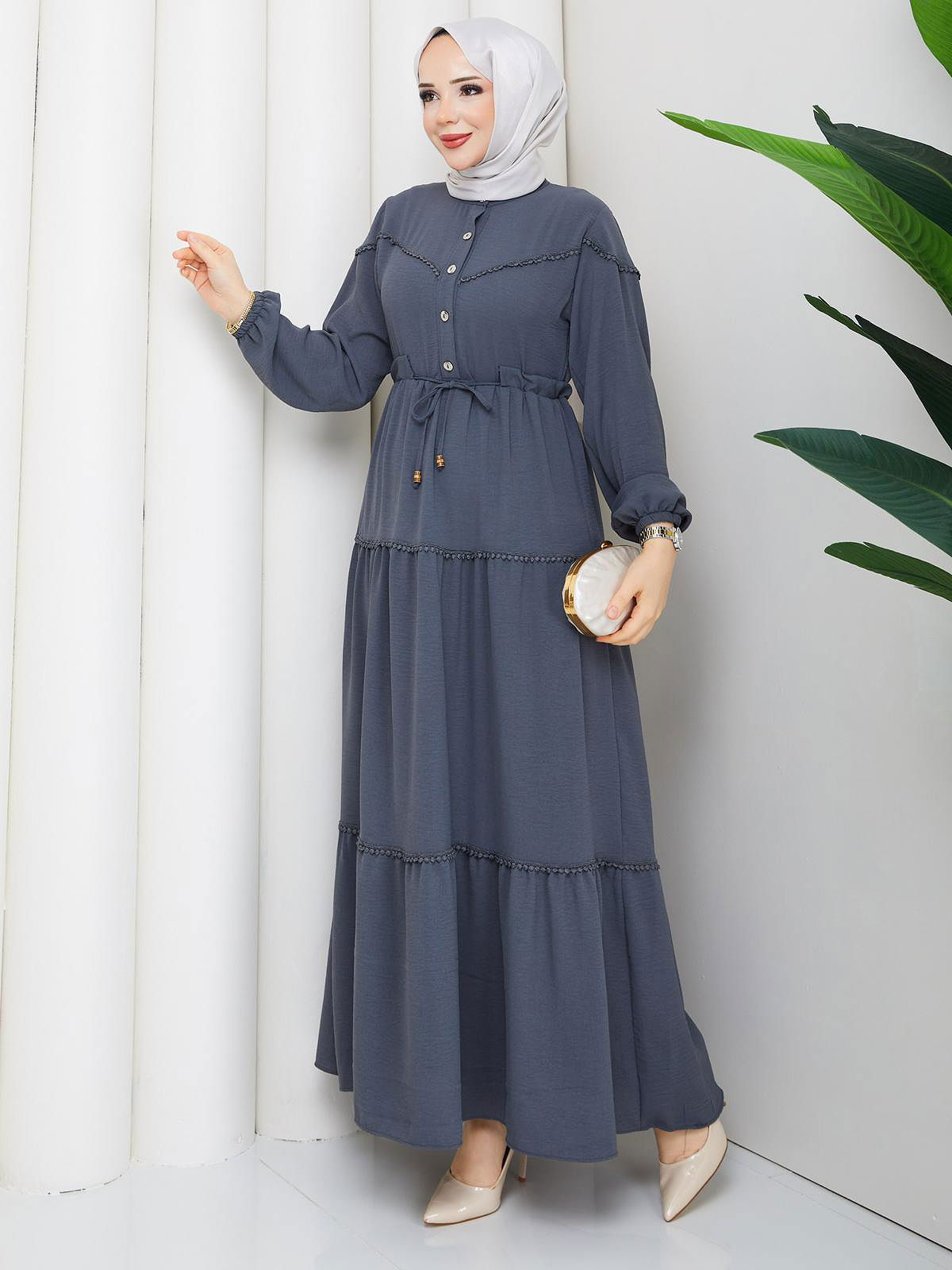 Belden Bağlamalı Tesettür Elbise-5071 Gri