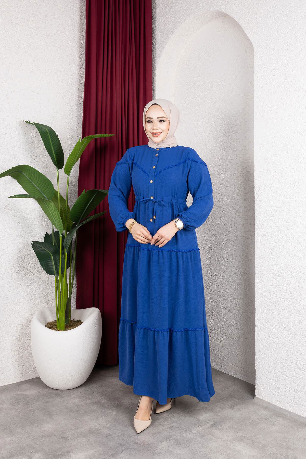 Belden Bağlamalı Tesettür Elbise-5071 Mavi