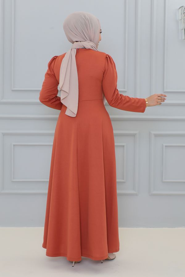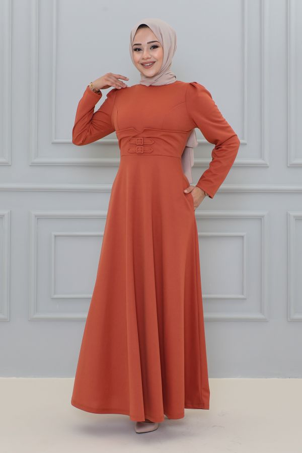Belden Oturtmalı Toka Detaylı Tesettür Elbise-3139 Kiremit