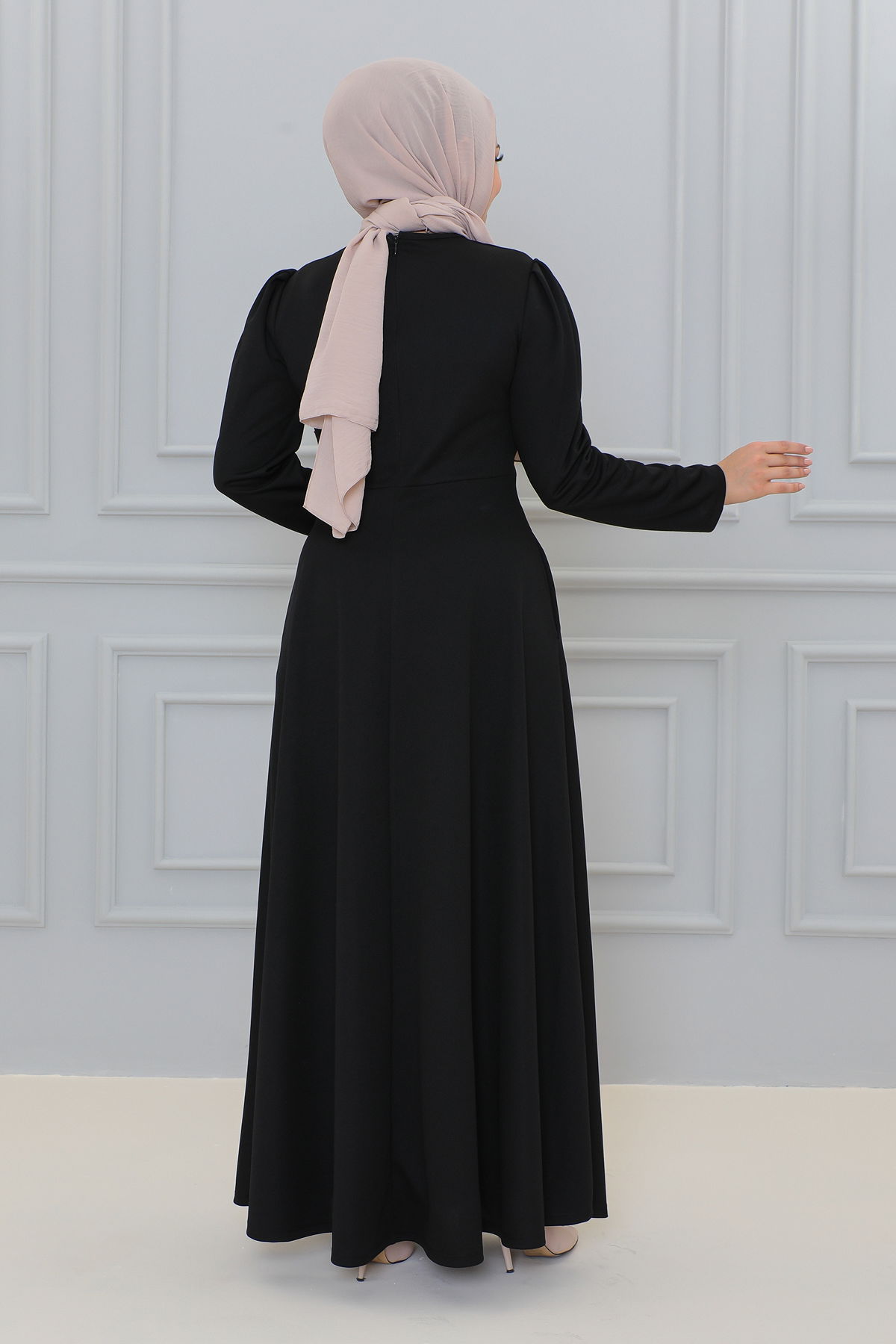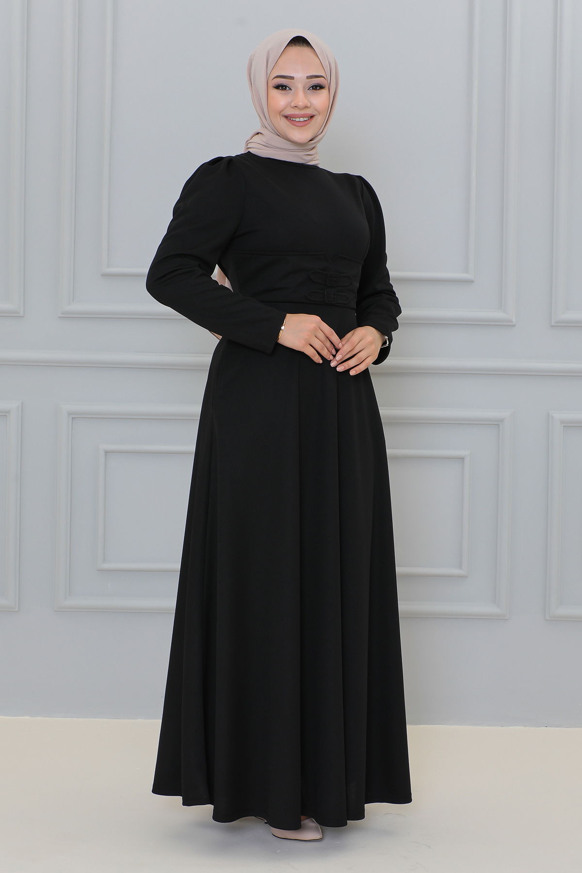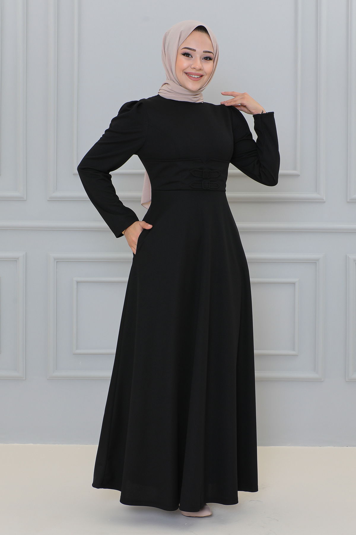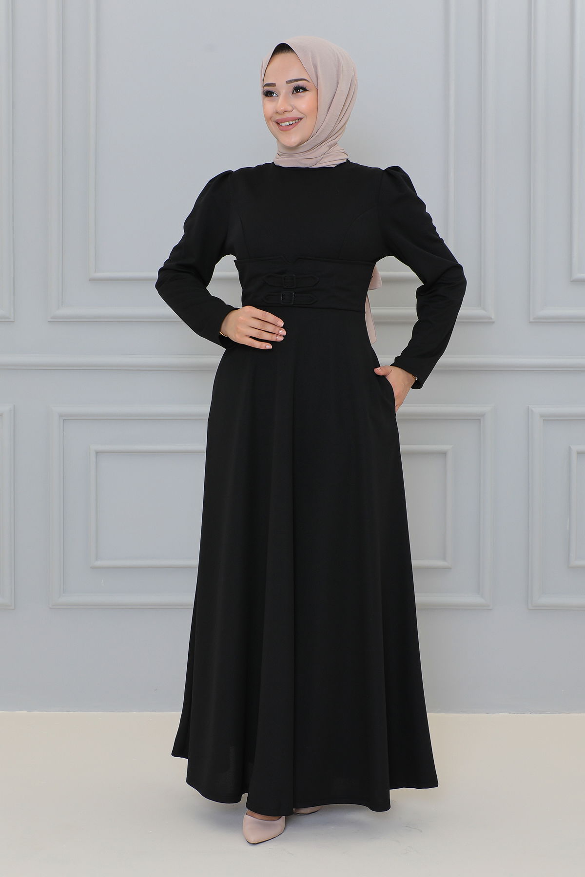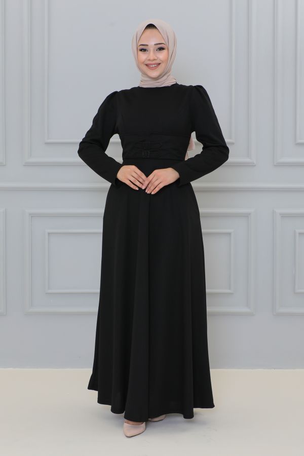 Belden Oturtmalı Toka Detaylı Tesettür Elbise-3139 Siyah