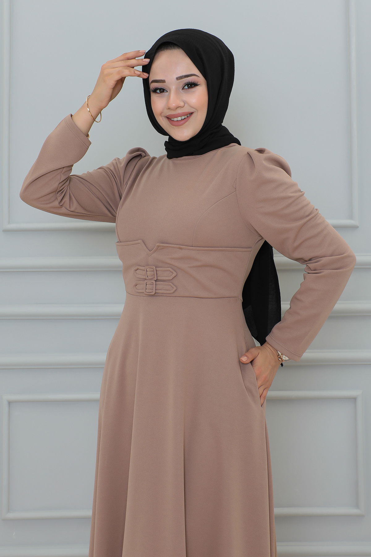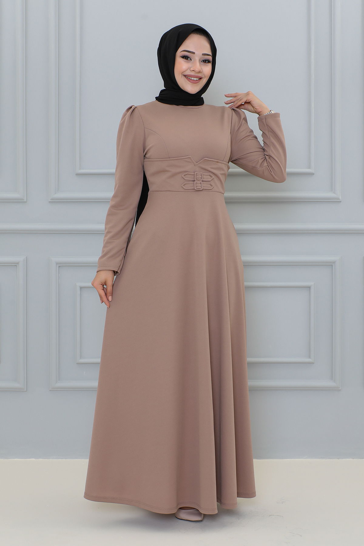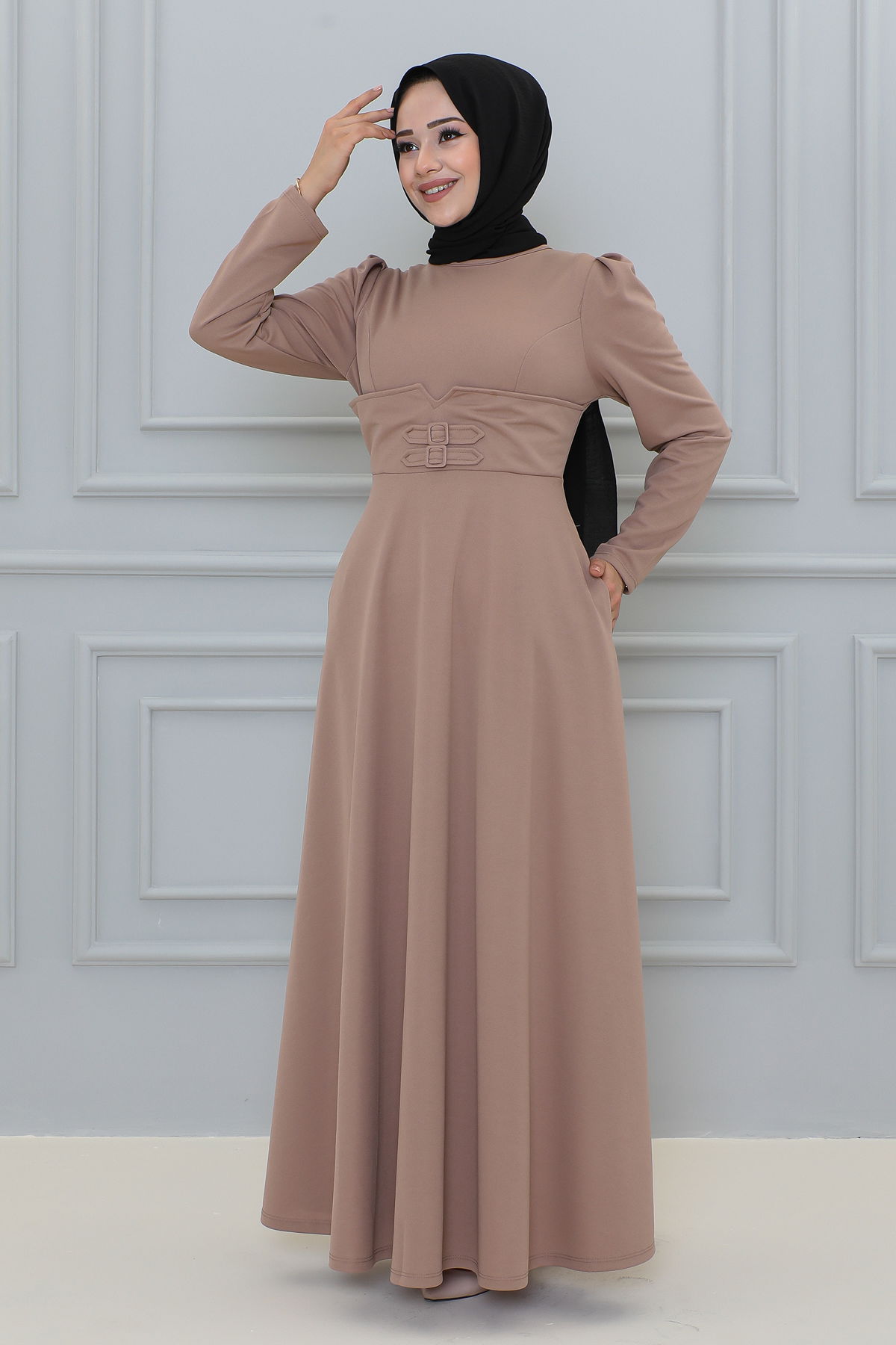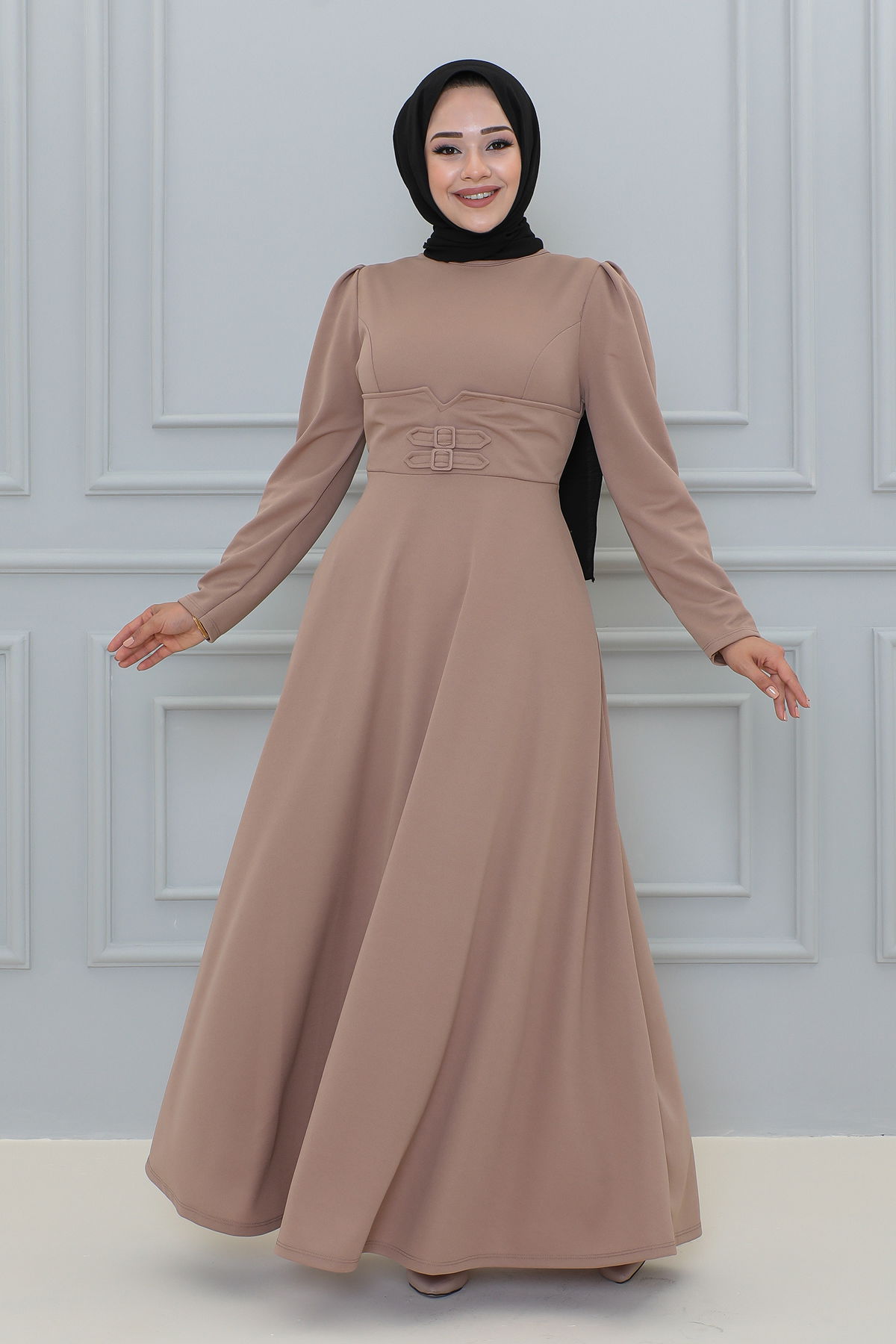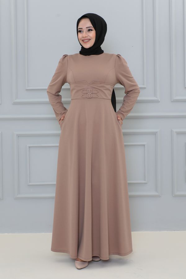 Belden Oturtmalı Toka Detaylı Tesettür Elbise-3139 Vizon