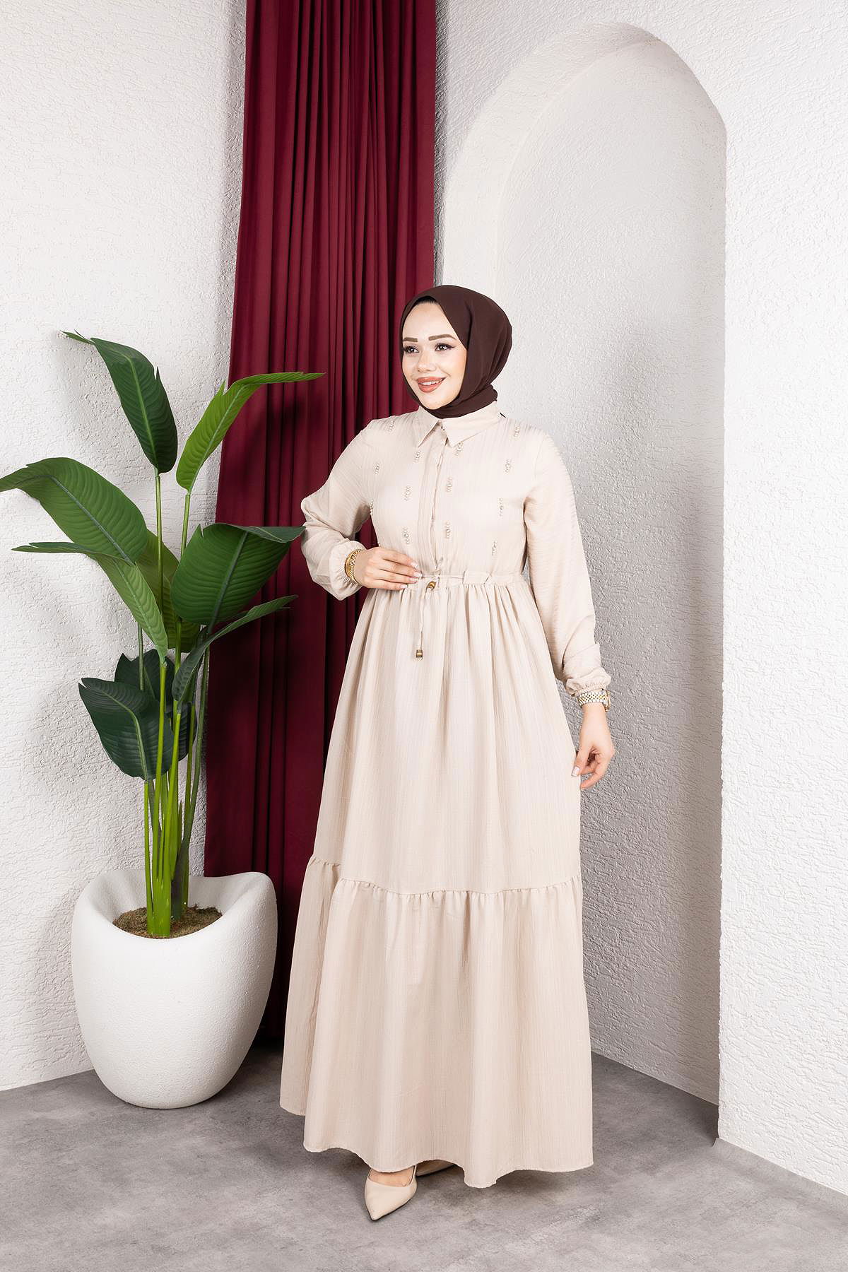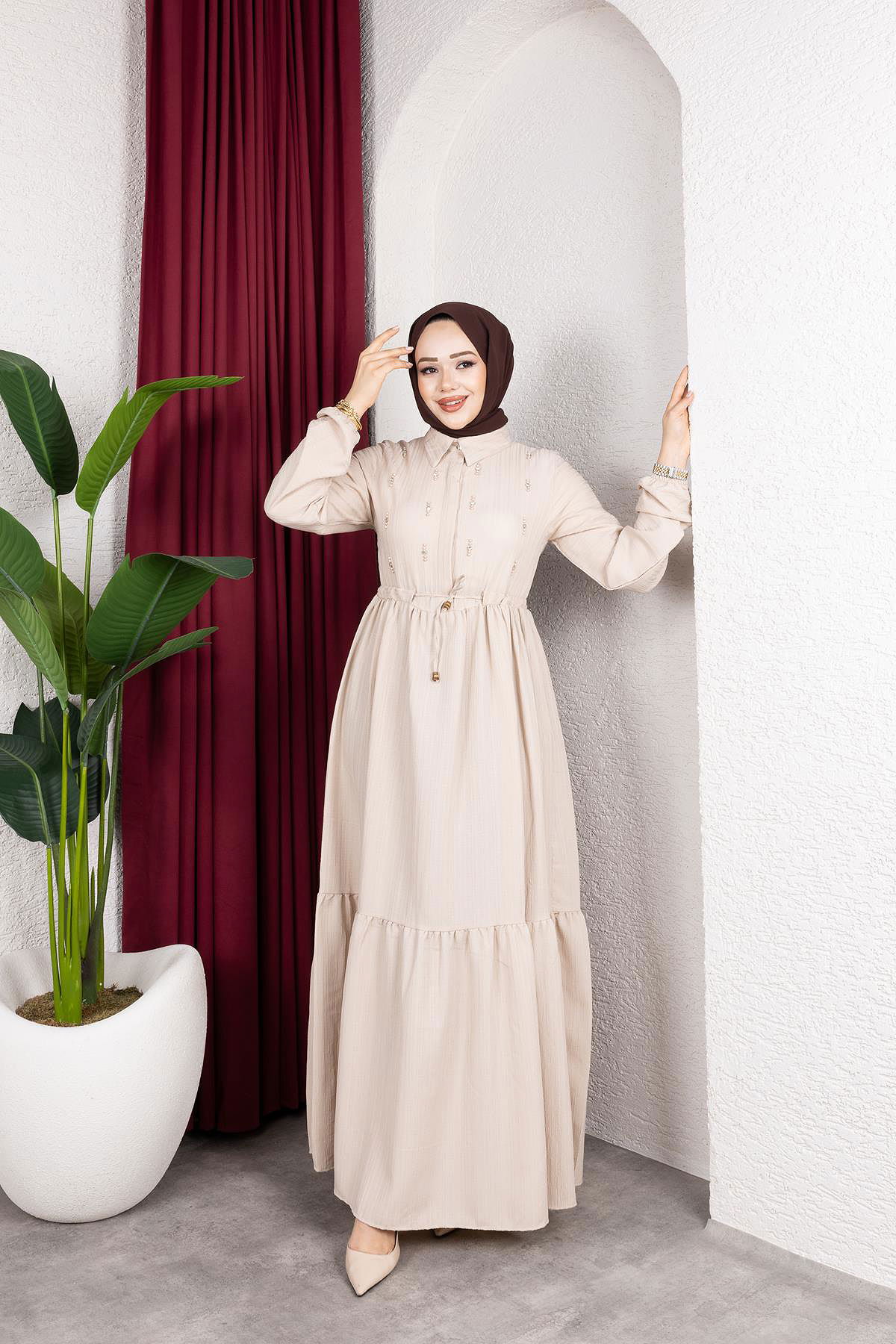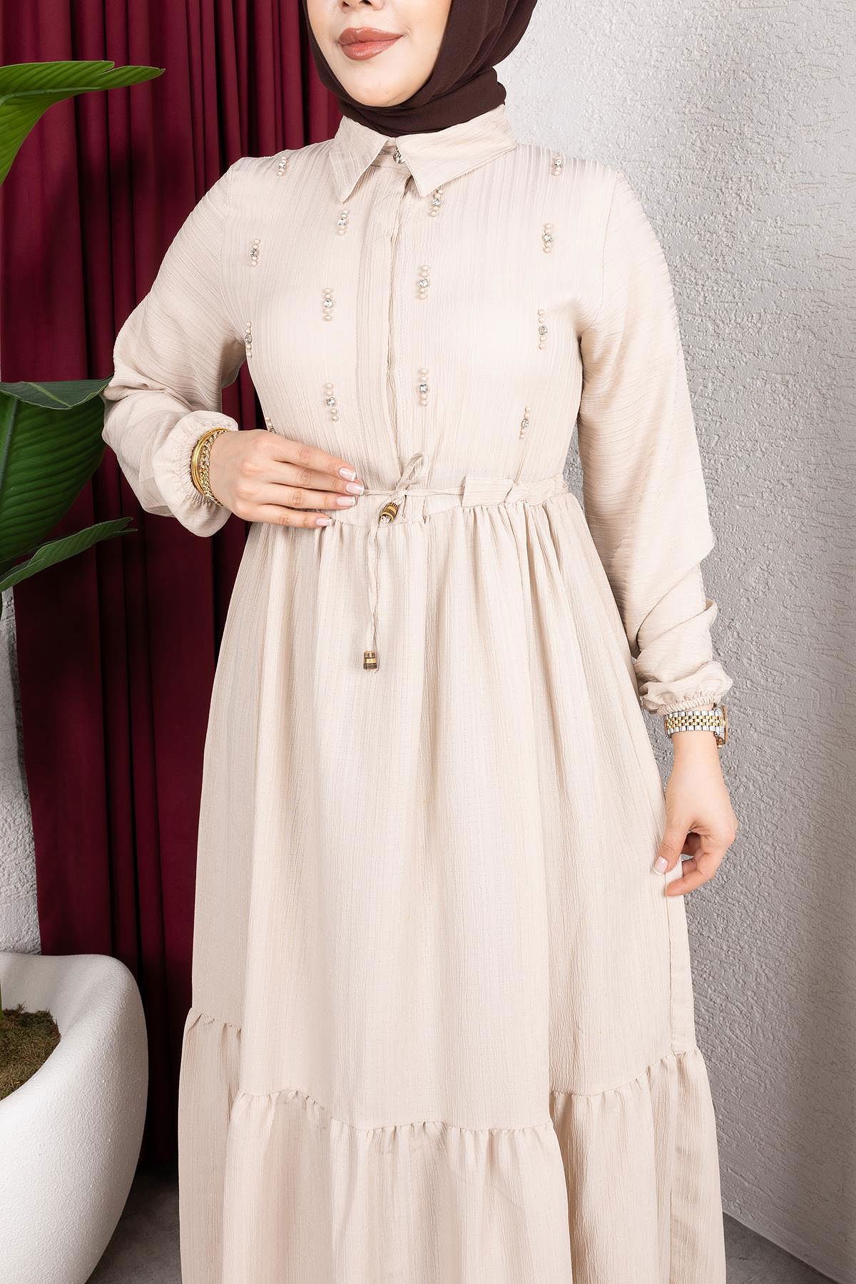 Beli Büzgülü İnci Ve Taş Detaylı Elbise-5070 Bej