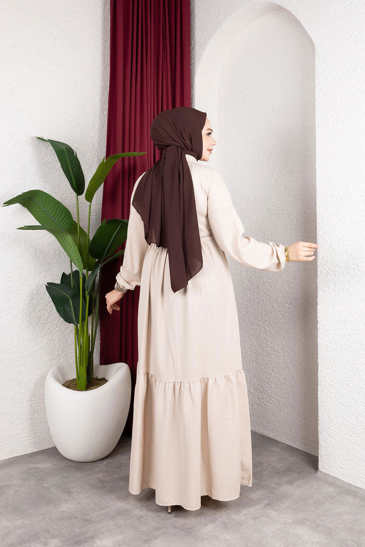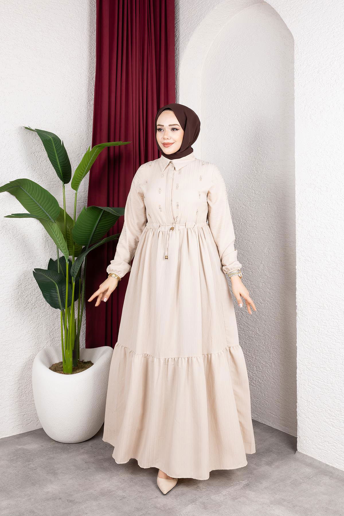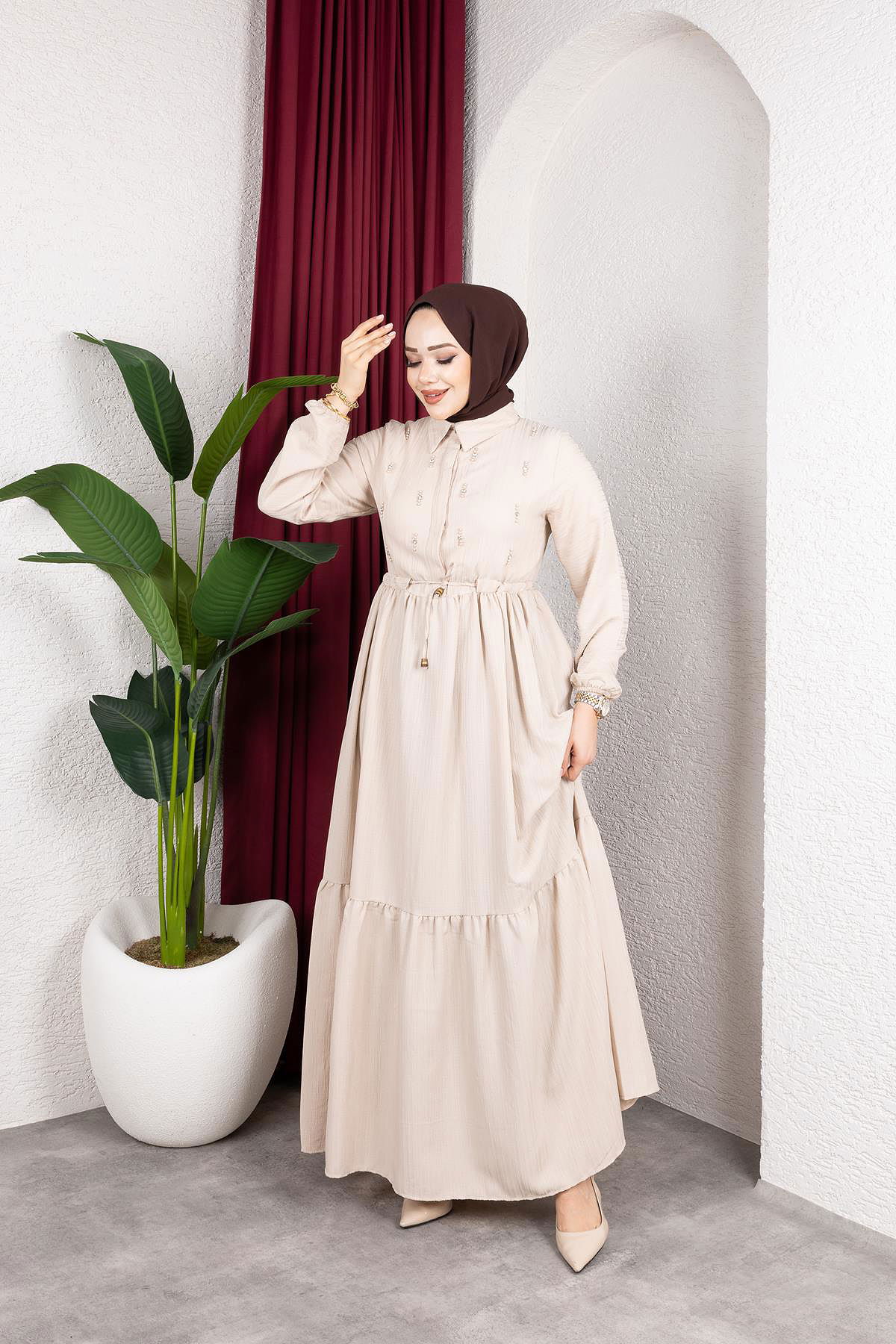 Beli Büzgülü İnci Ve Taş Detaylı Elbise-5070 Bej