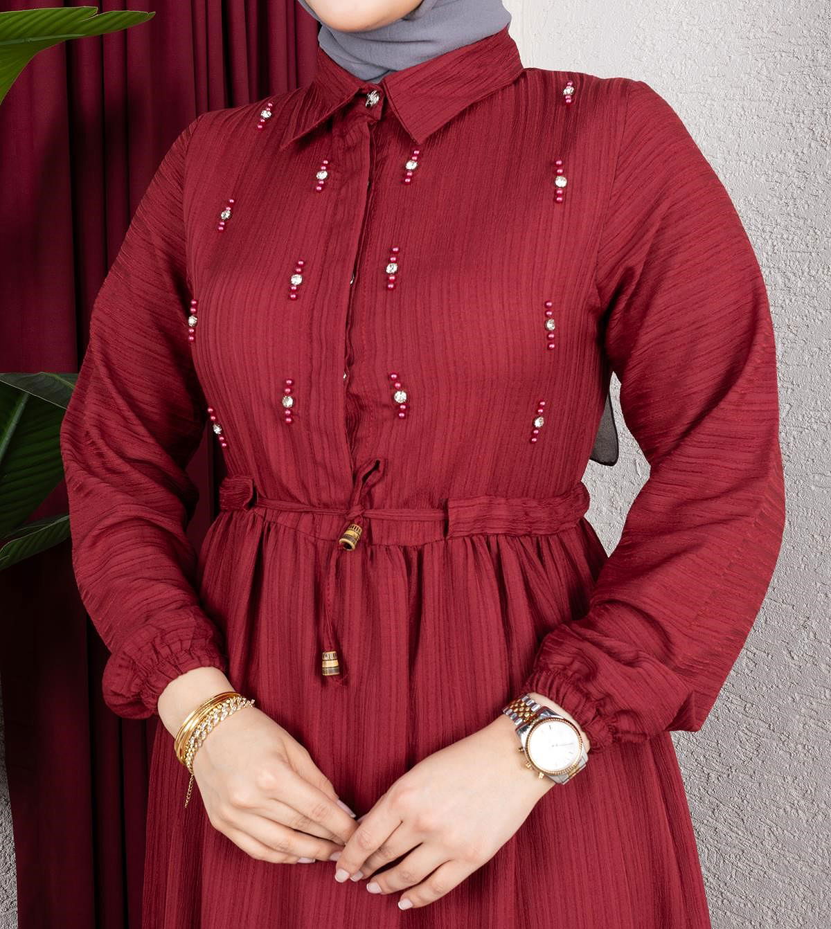 Beli Büzgülü İnci Ve Taş Detaylı Elbise-5070 Bordo