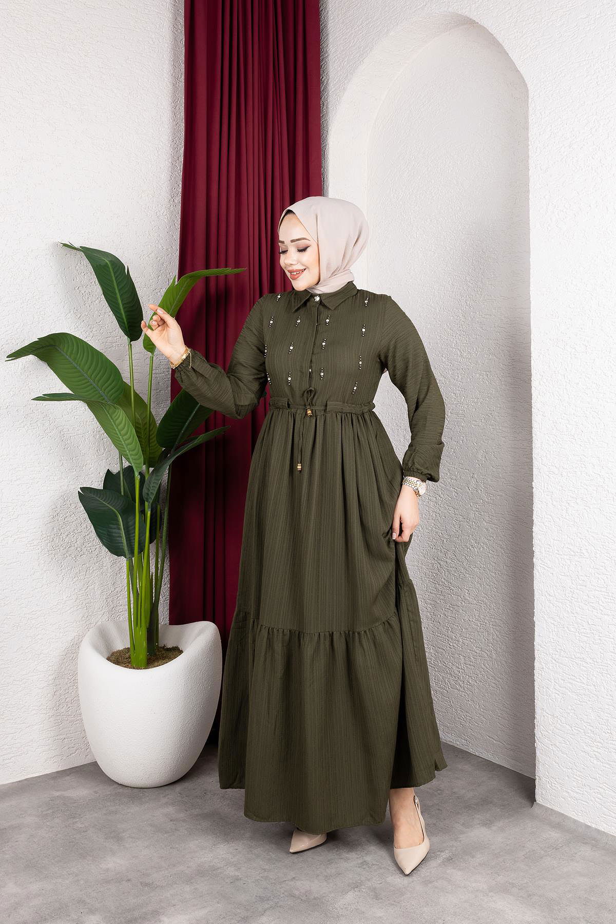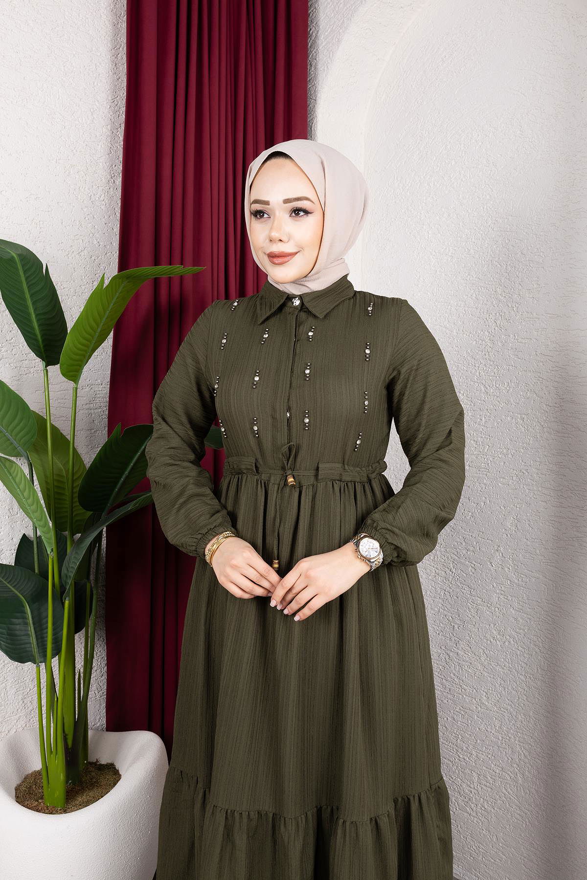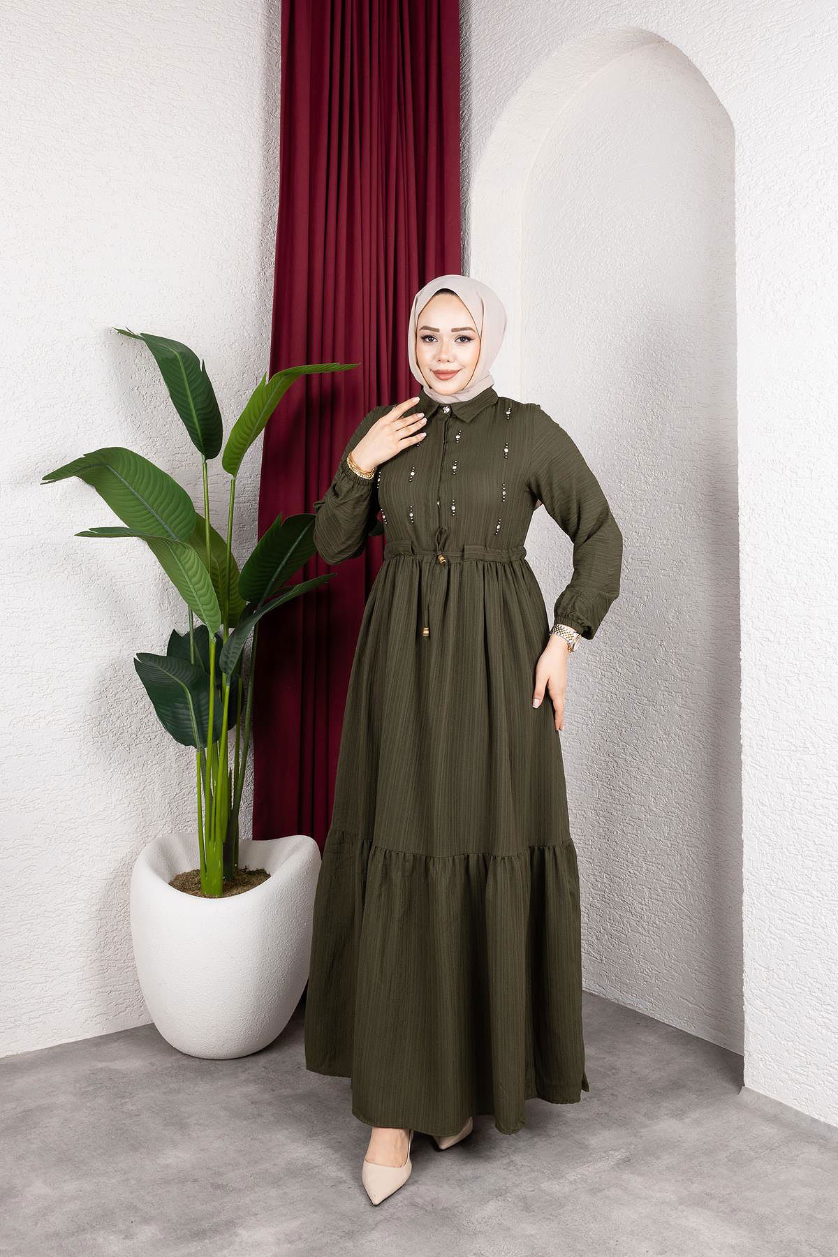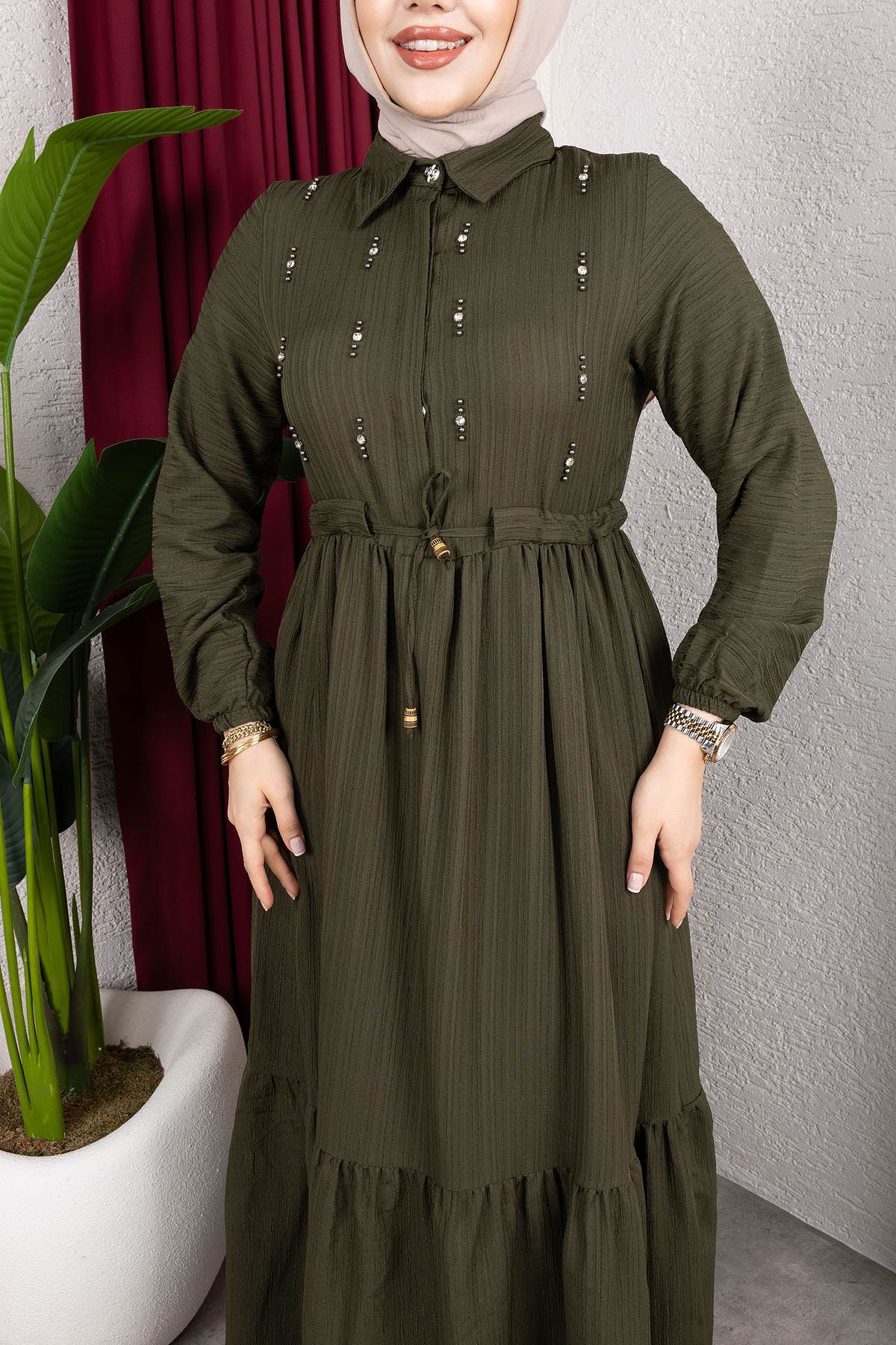 Beli Büzgülü İnci Ve Taş Detaylı Elbise-5070 Haki yeşili