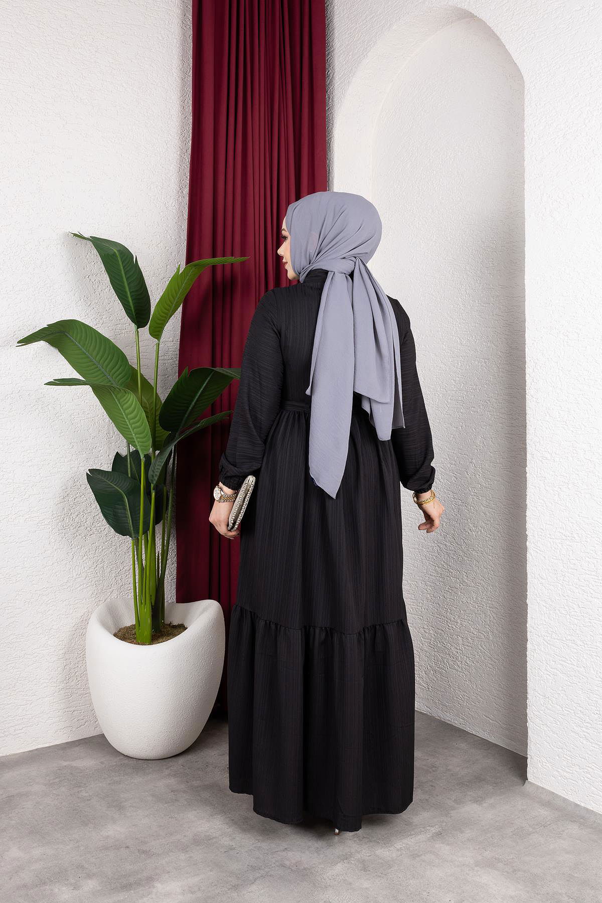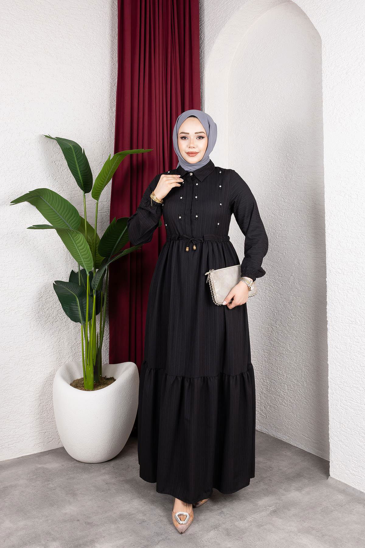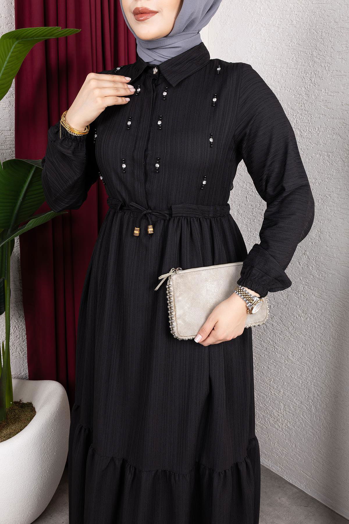 Beli Büzgülü İnci Ve Taş Detaylı Elbise-5070 Siyah