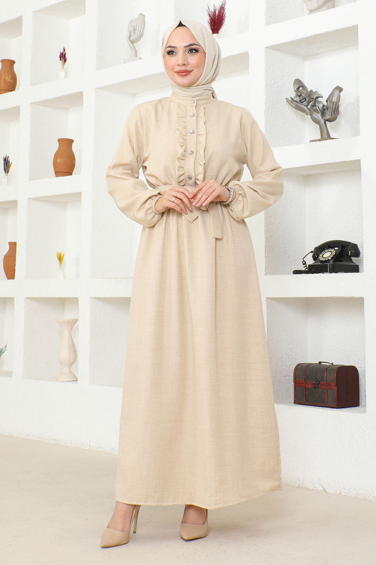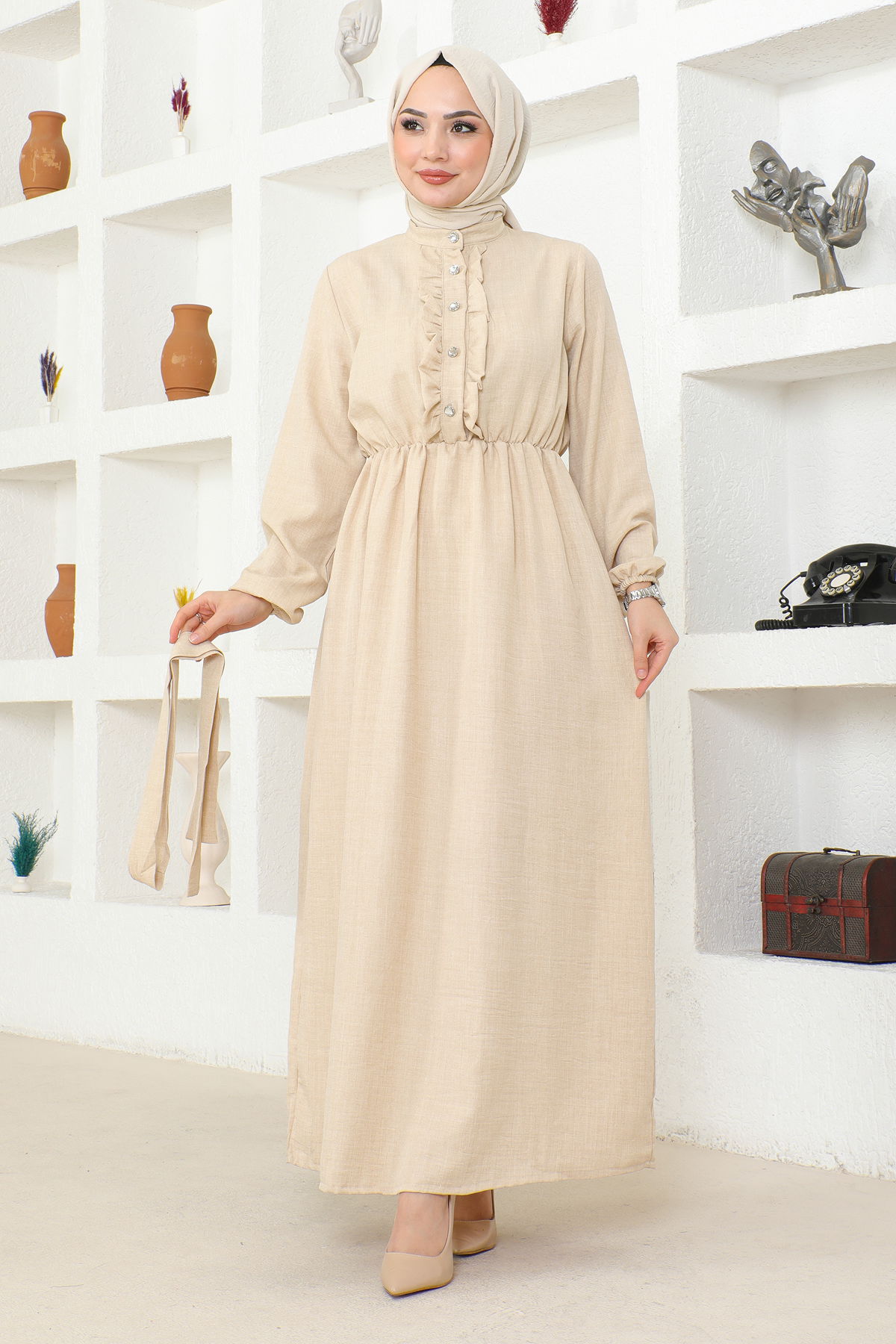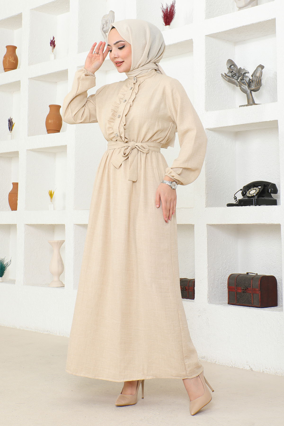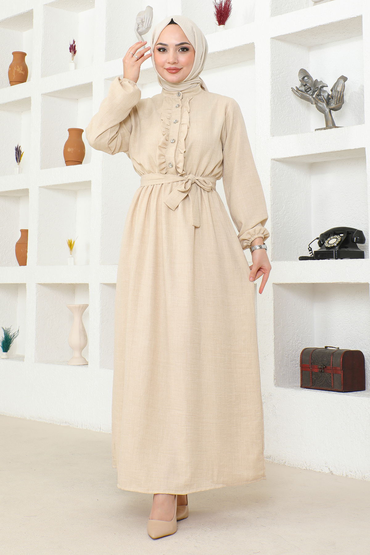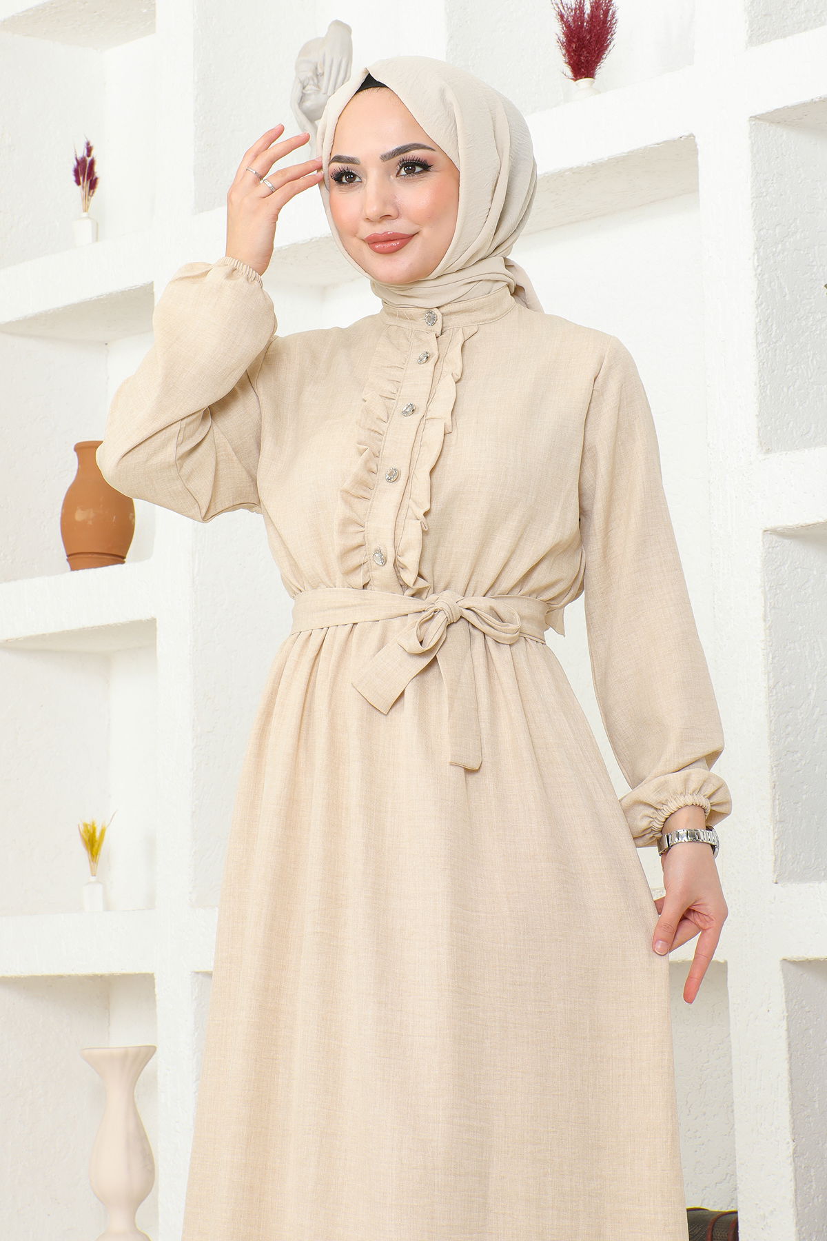 Beli Lastikli Kuşaklı Tesettür Elbise-3851 Krem