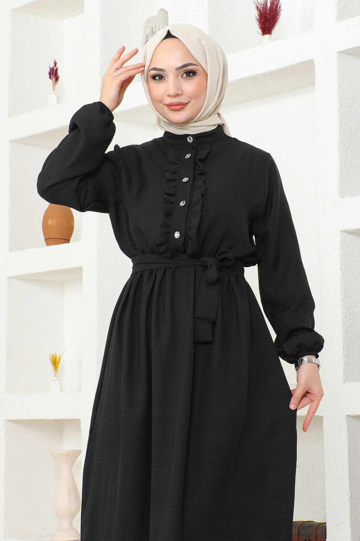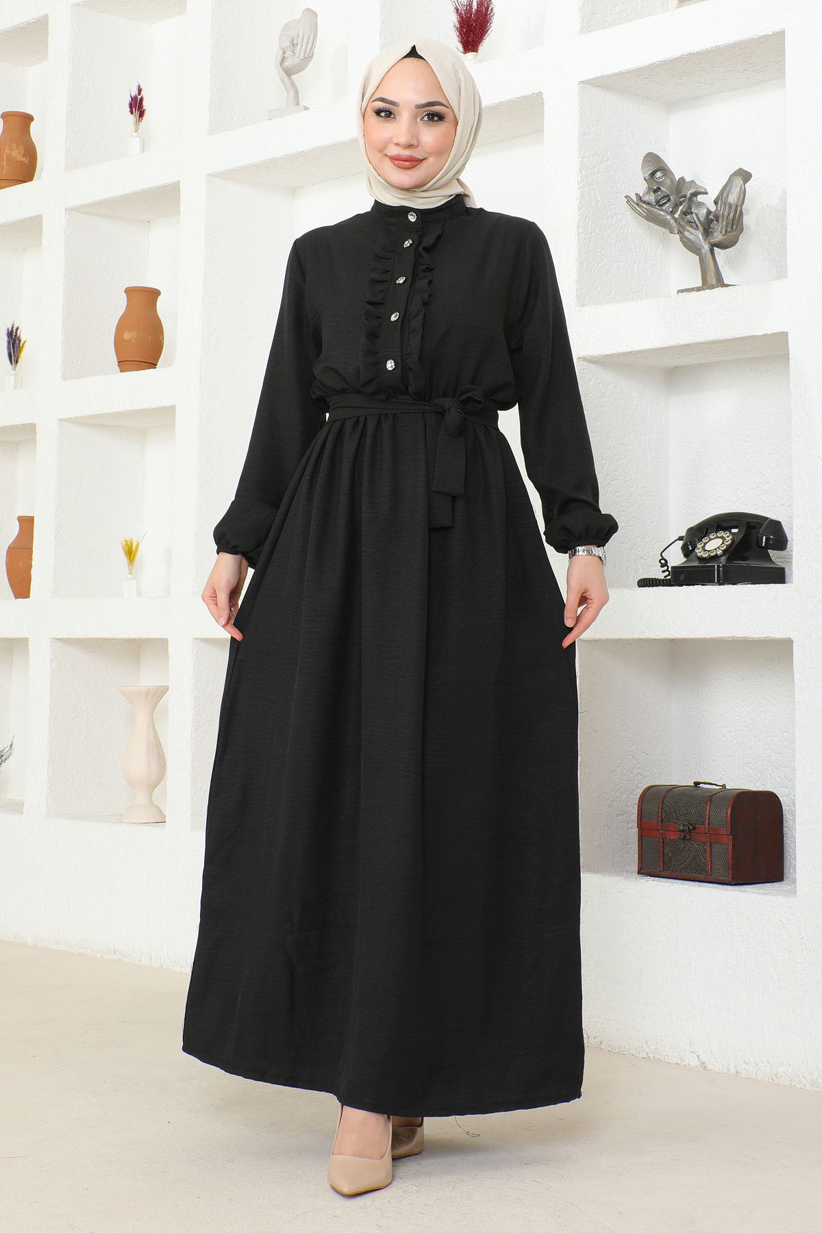 Beli Lastikli Kuşaklı Tesettür Elbise-3851 Siyah