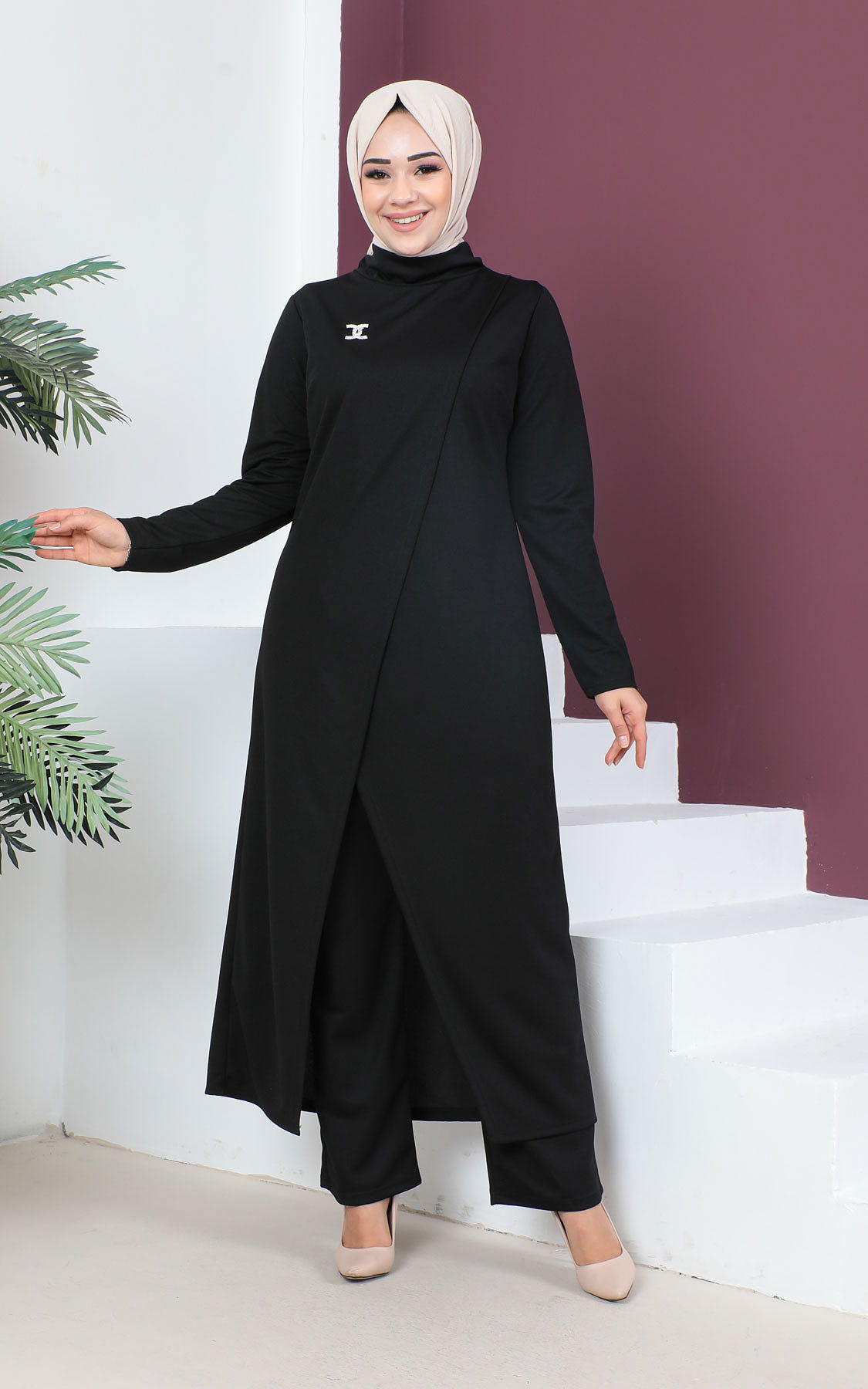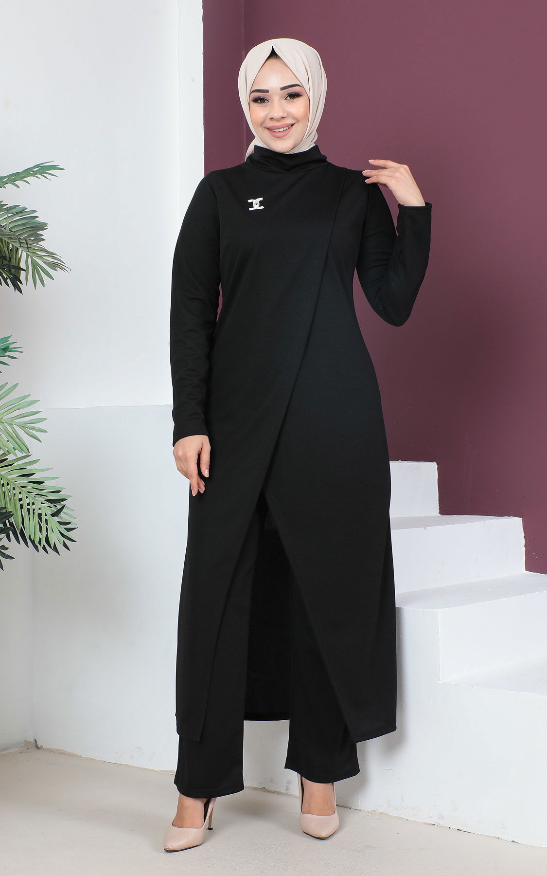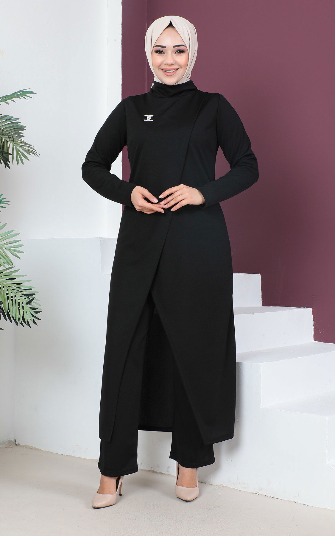 Broşlu Asimetrik Kesim İkili Takım-3132 Siyah