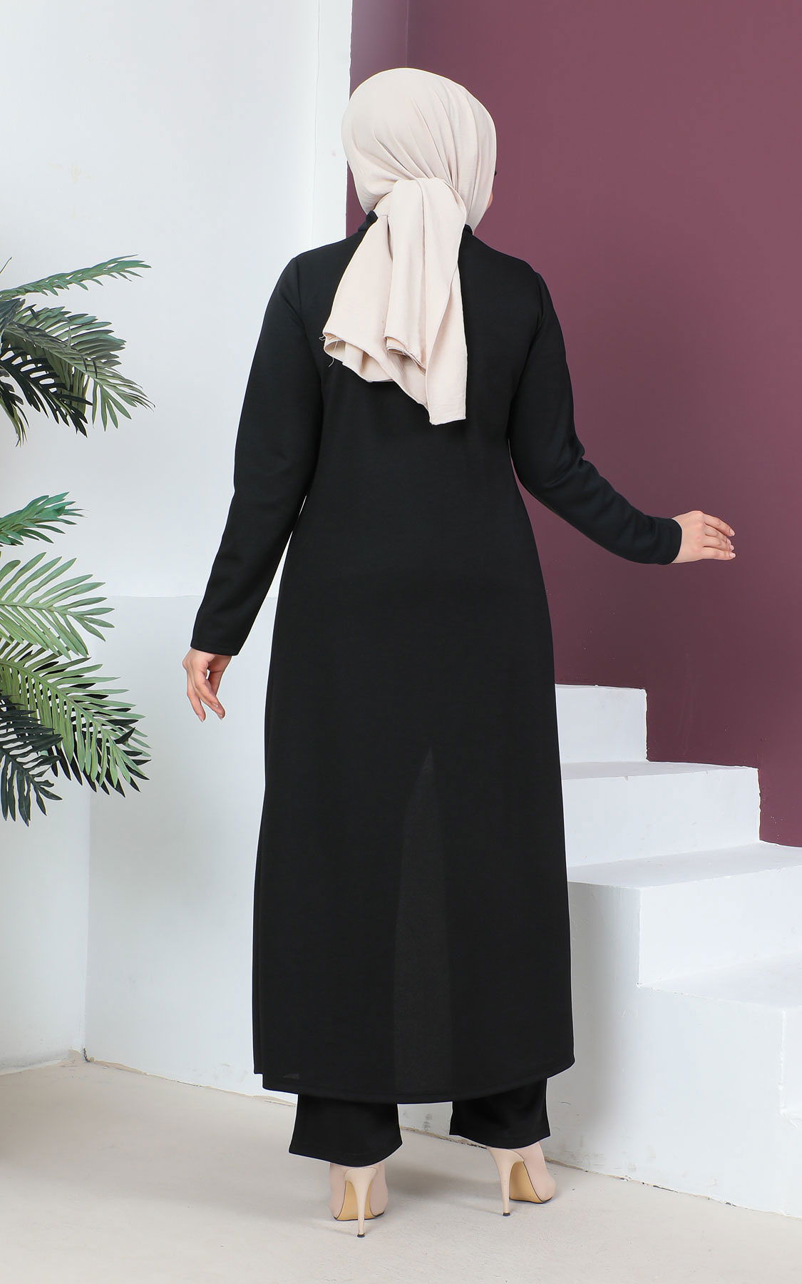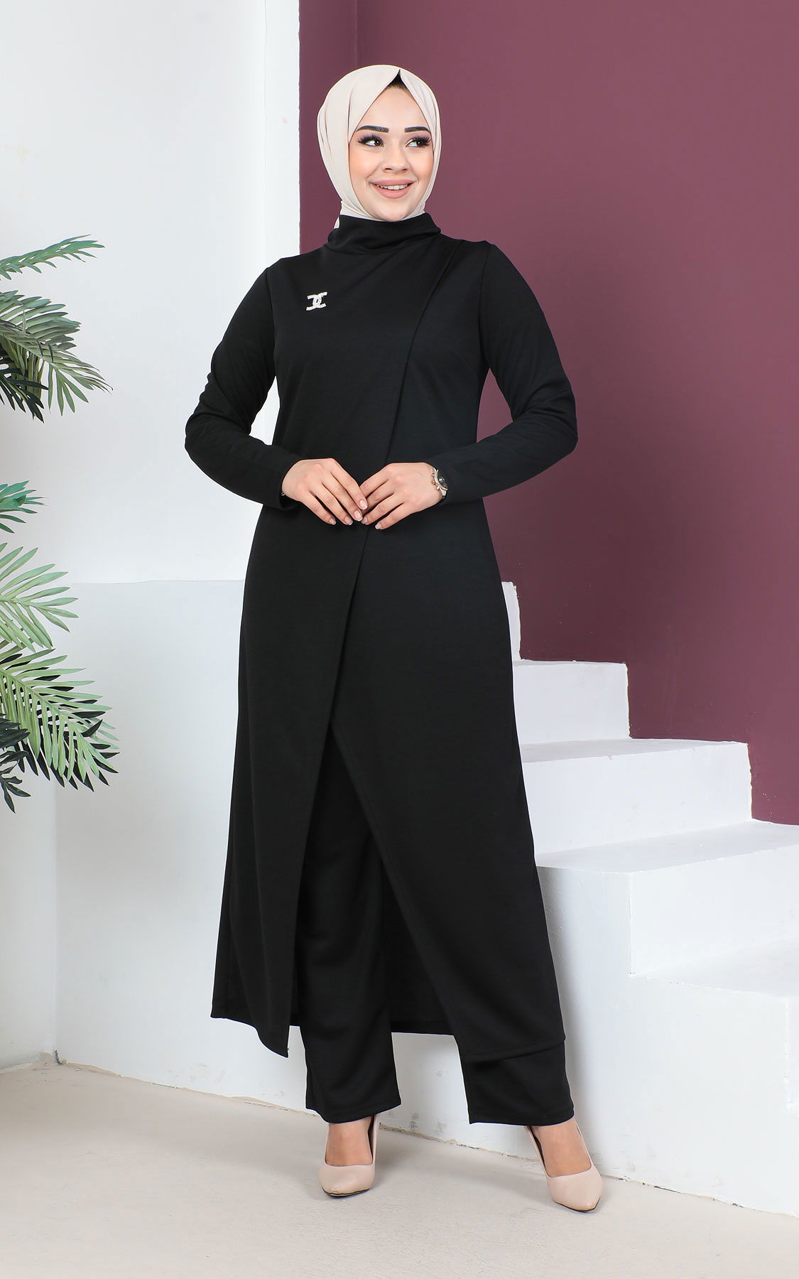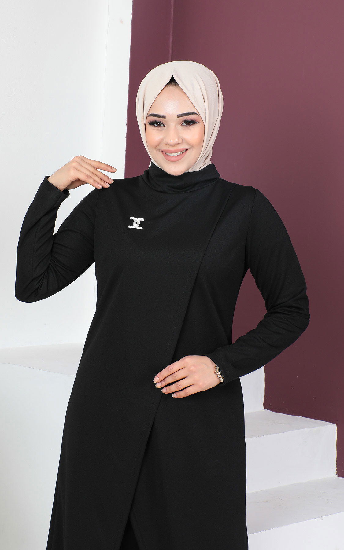 Broşlu Asimetrik Kesim İkili Takım-3132 Siyah