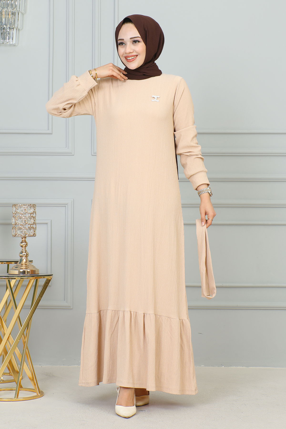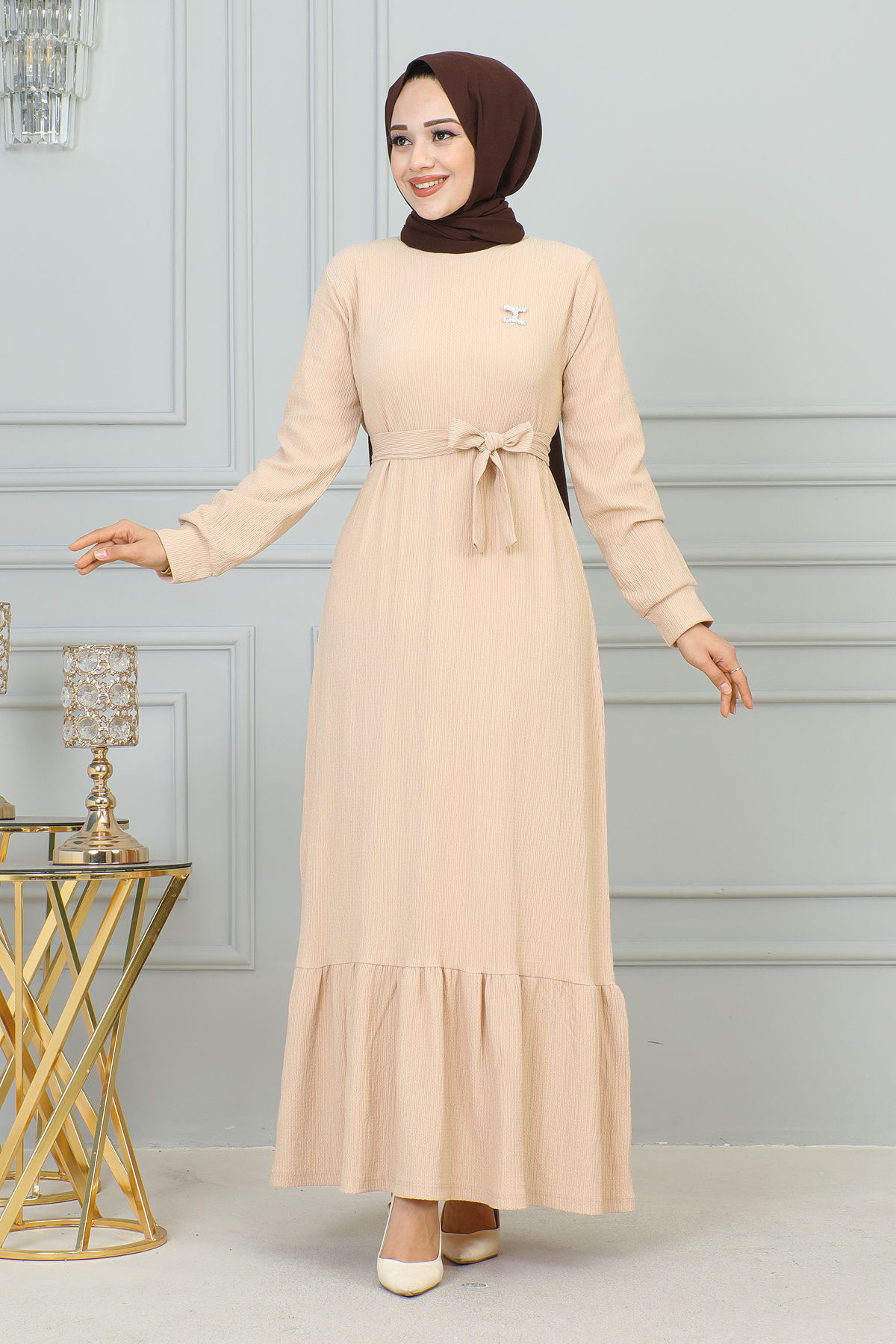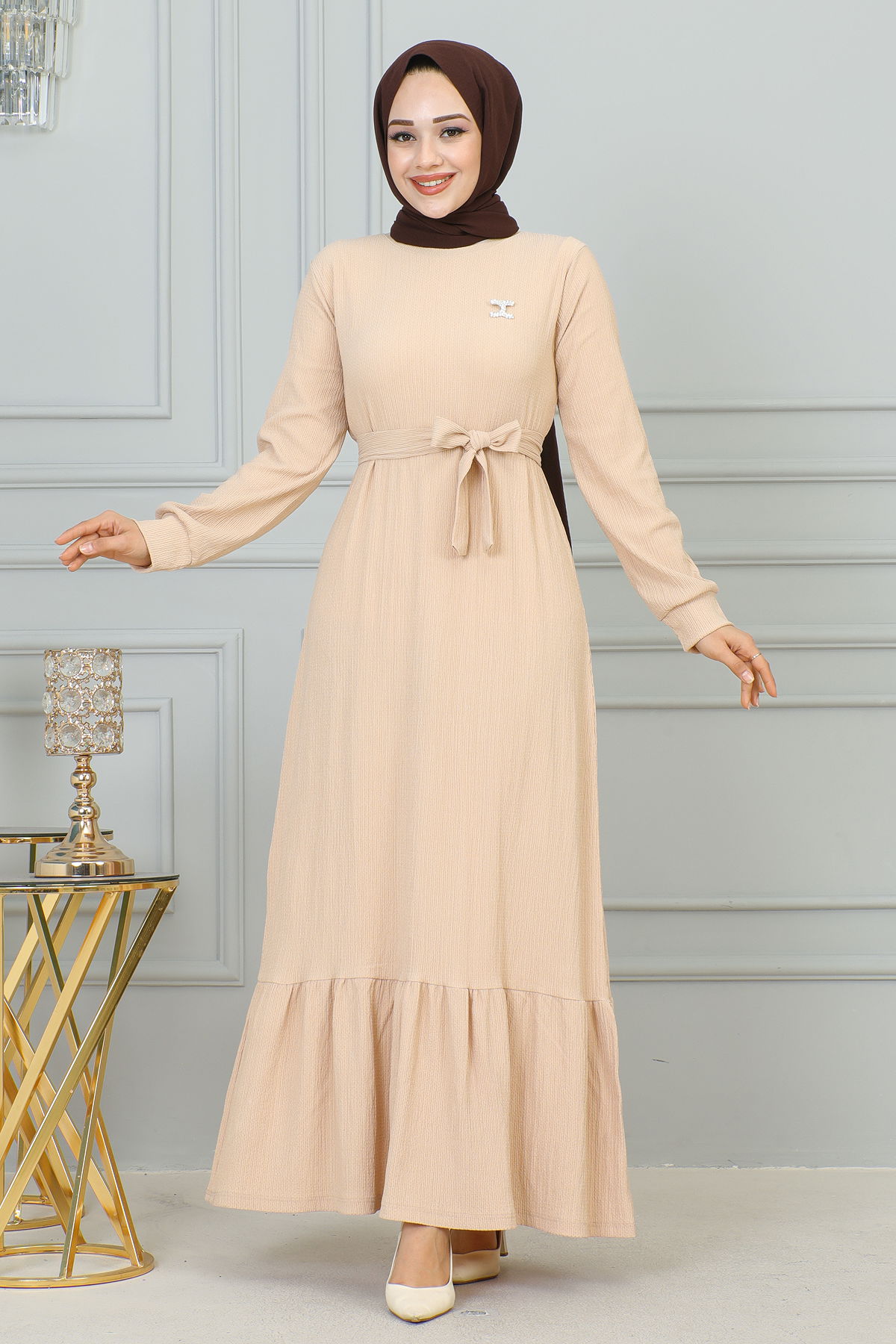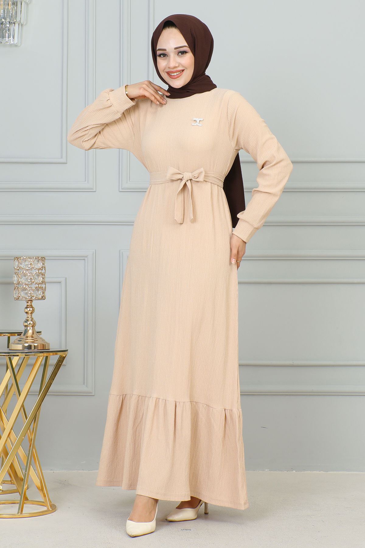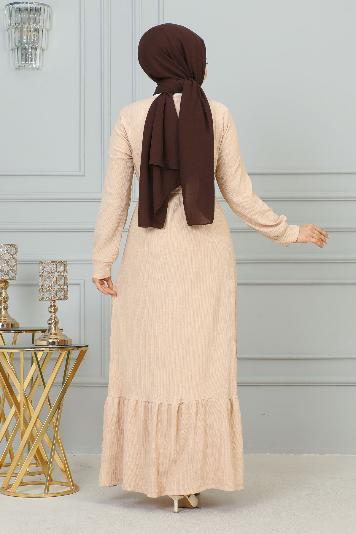 Broşlu Bürümcük Tesettür Elbise-3931 Vizon