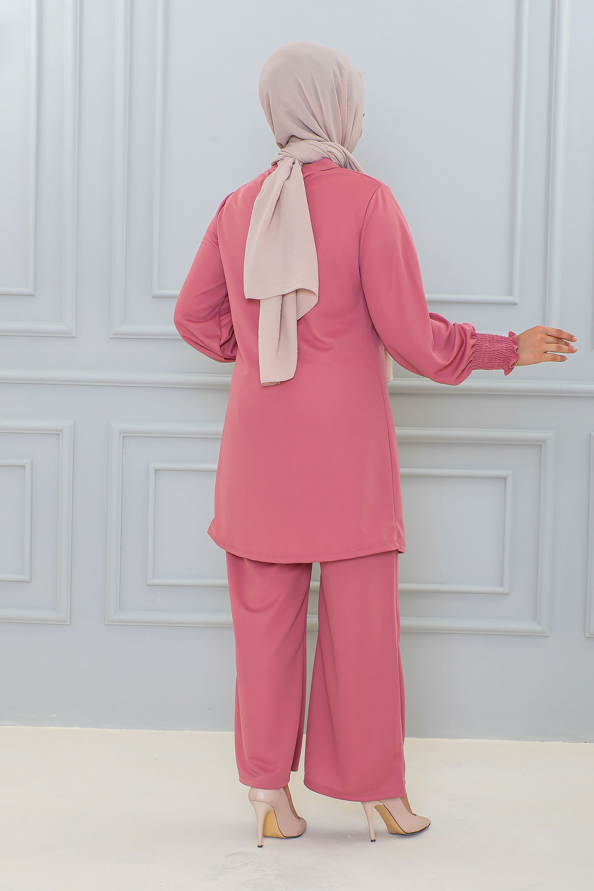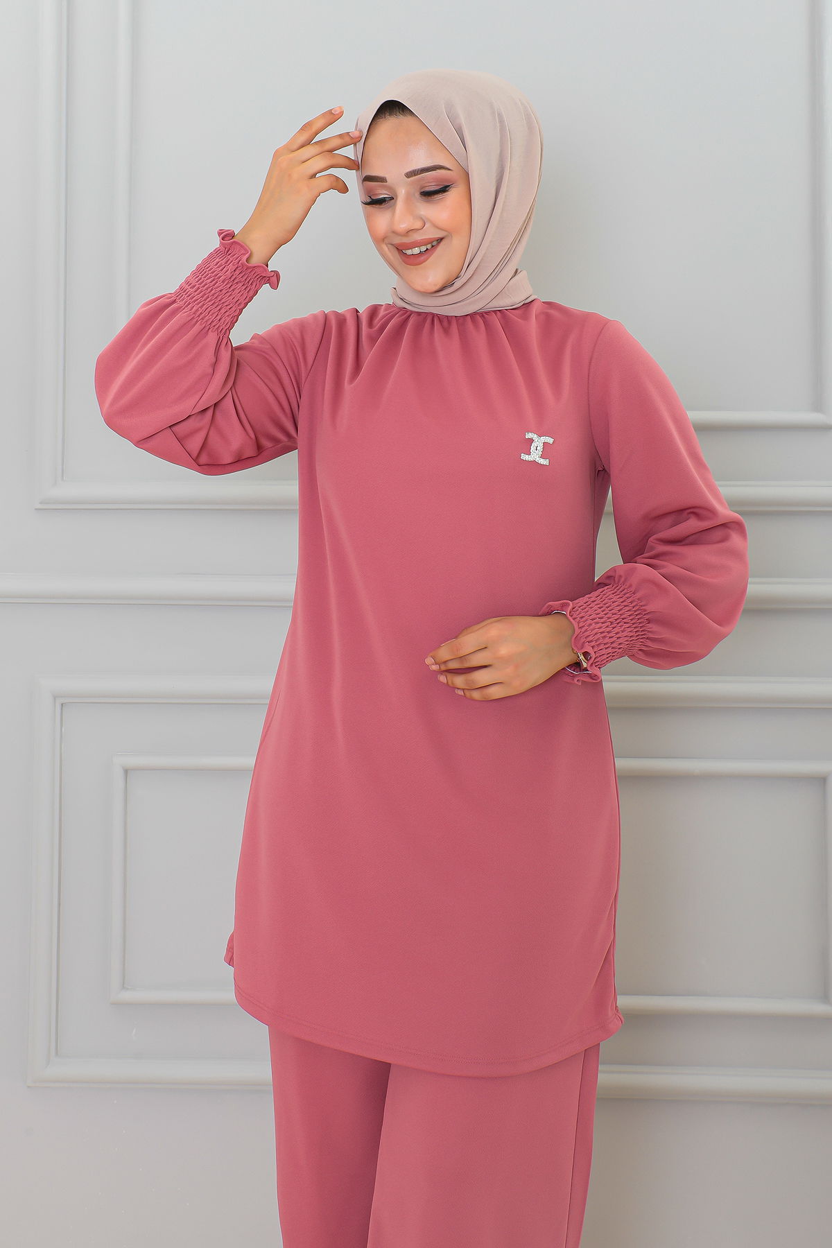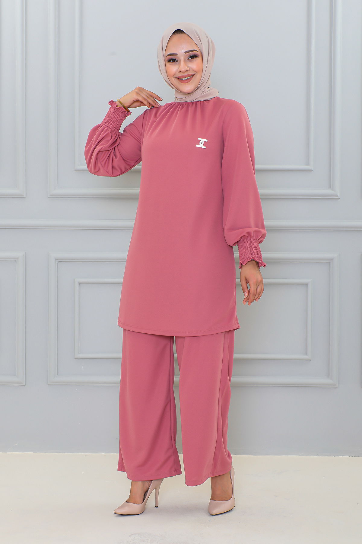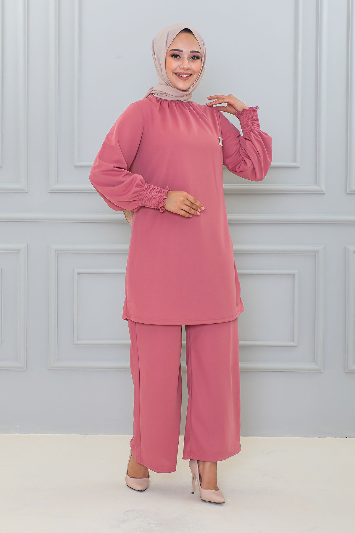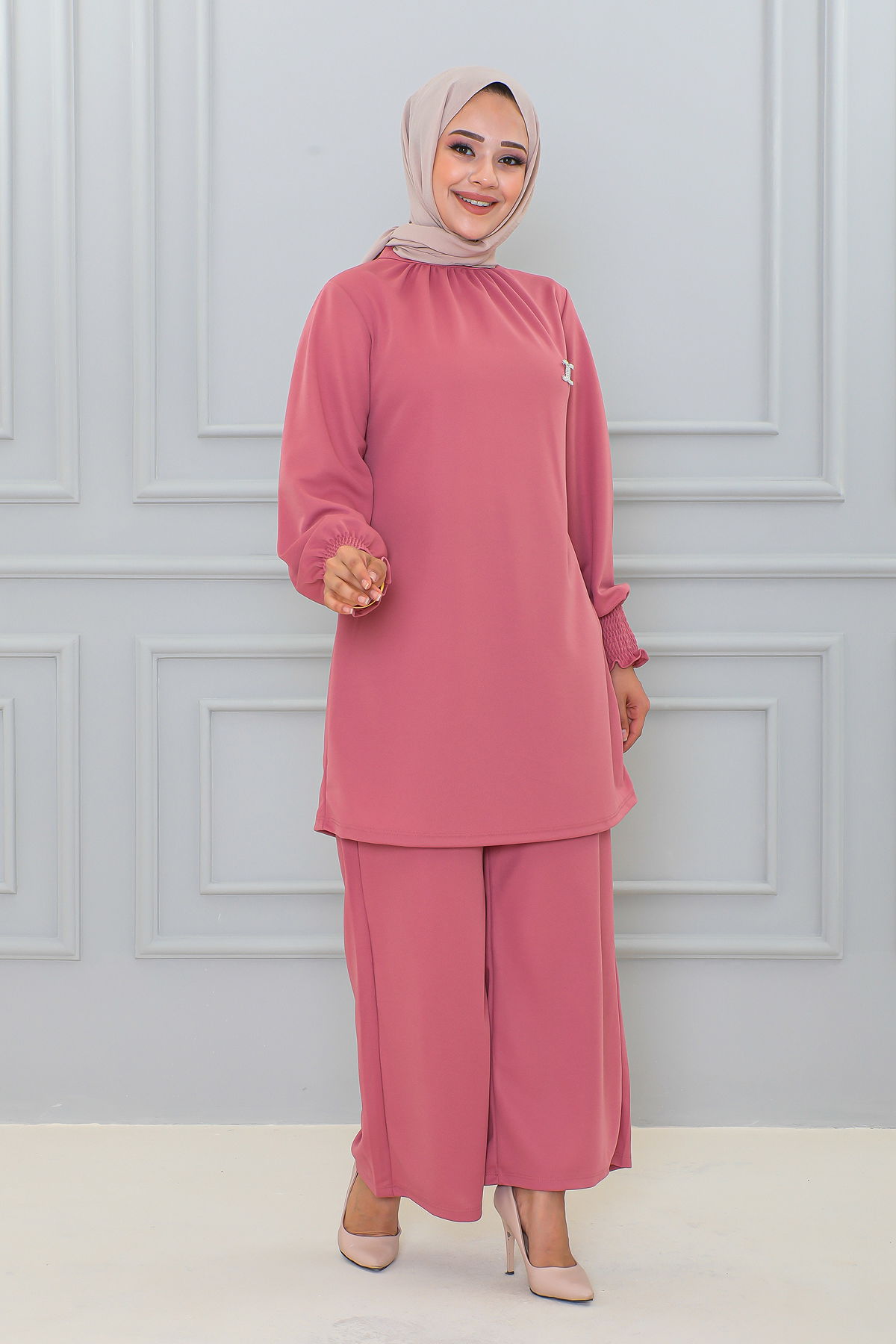 Broşlu İkili Tesettür Takım-3123 Gülkurusu