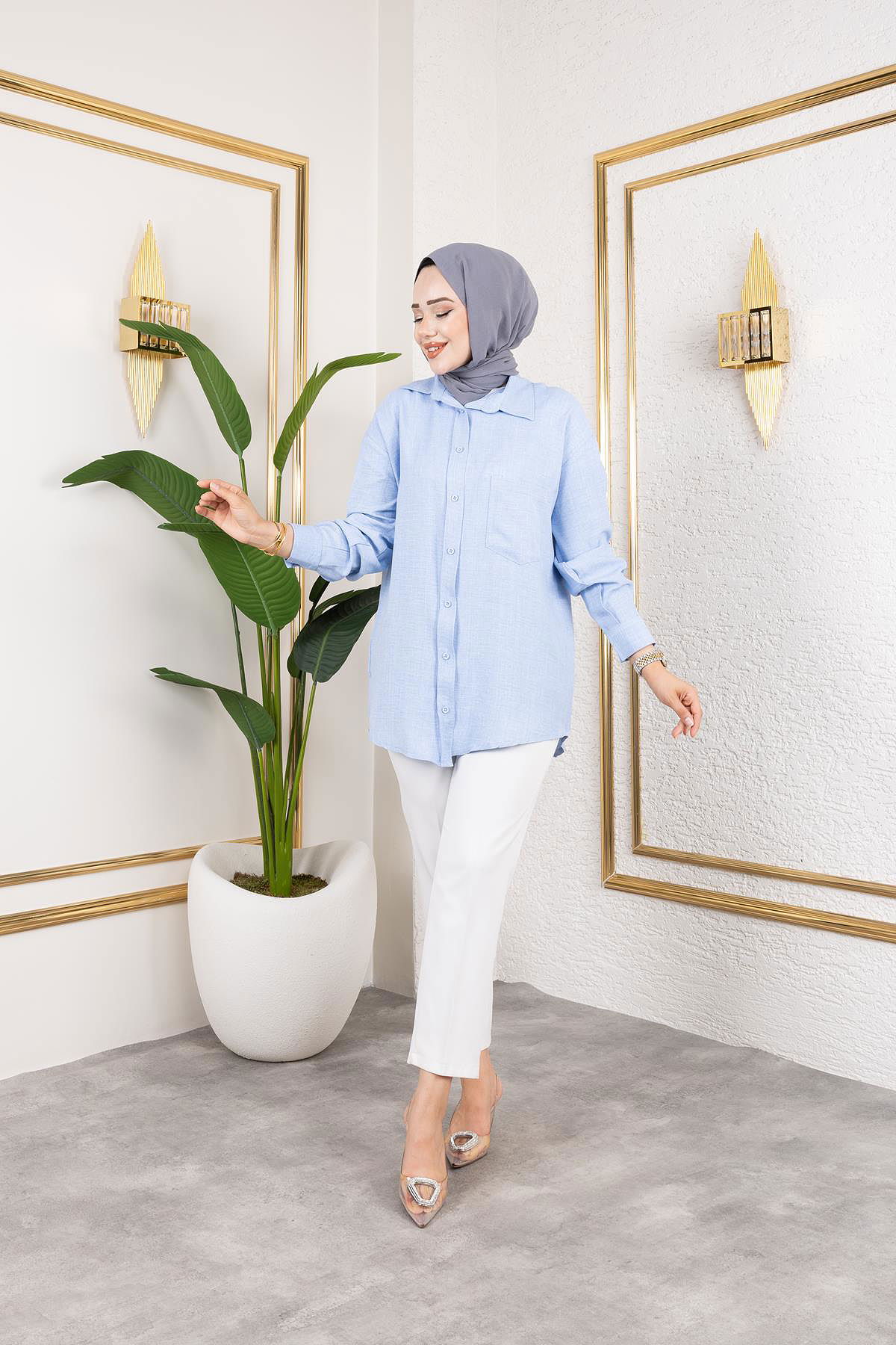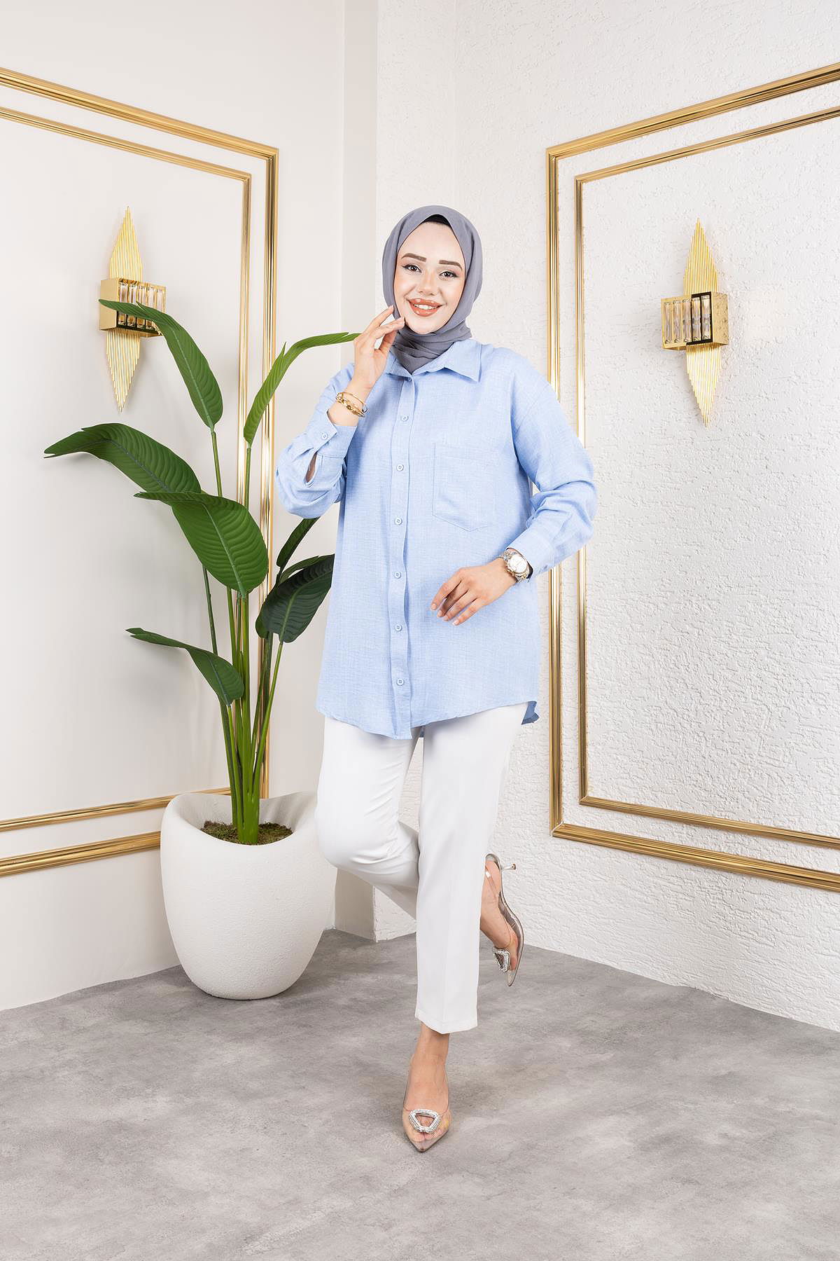 Cep Detaylı Tesettür Gömlek-3037 Mavi