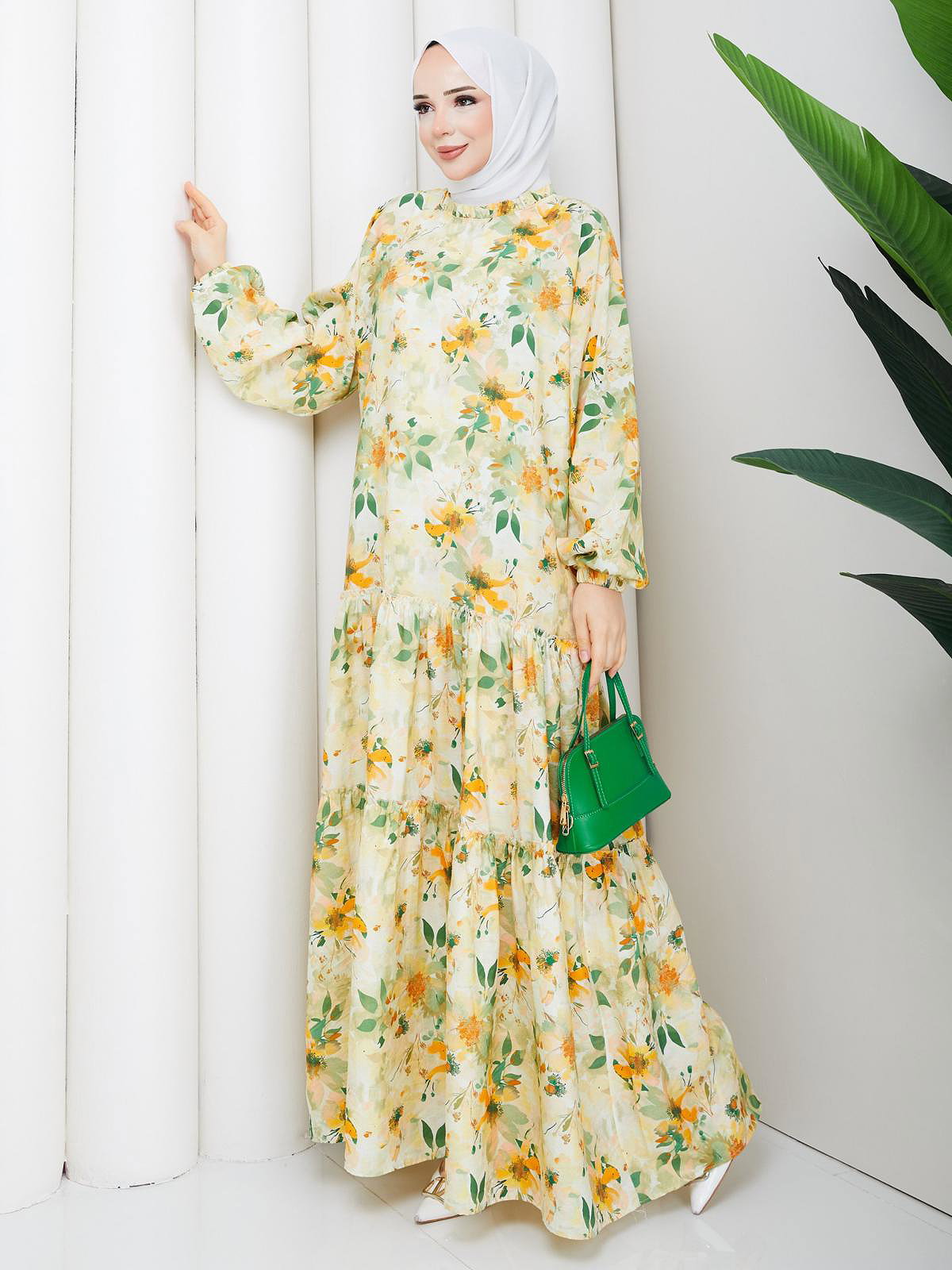 Çiçek Desenli Modal Elbise-5190 Hardal