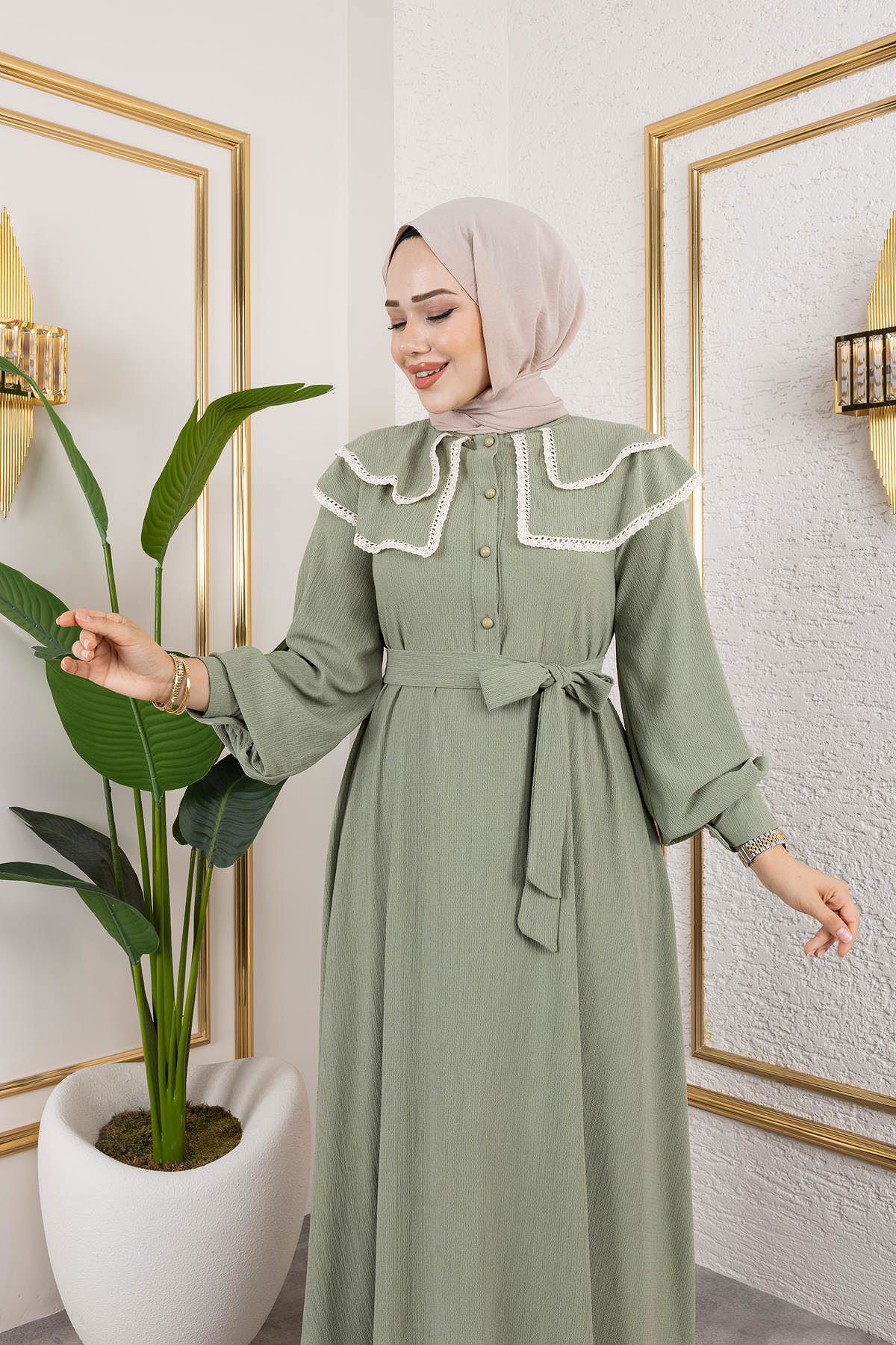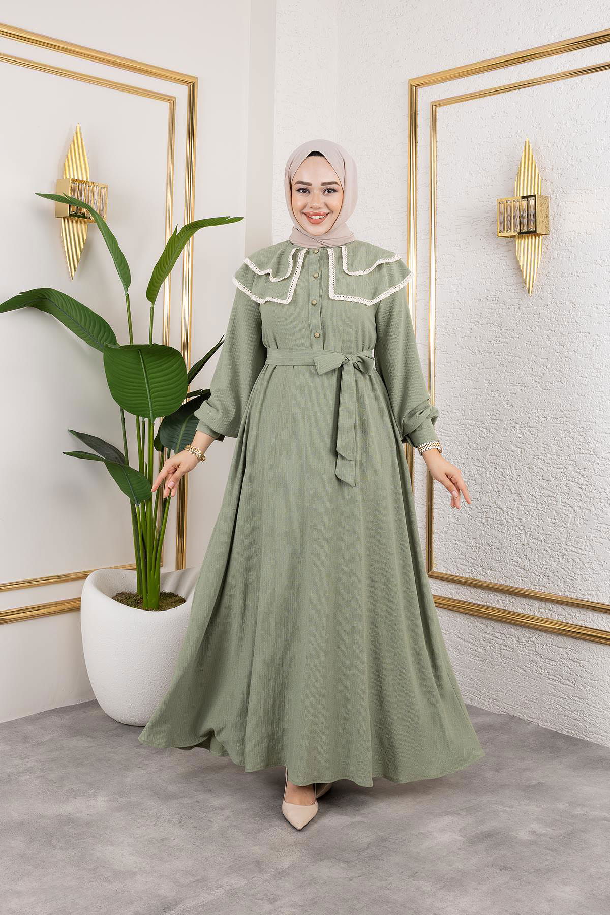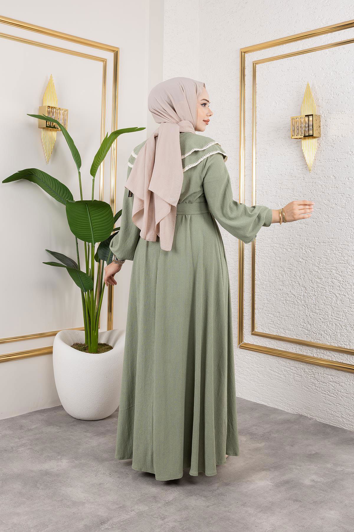 Dantel Detaylı Kloş Tesettür Elbise-5031Su yeşili