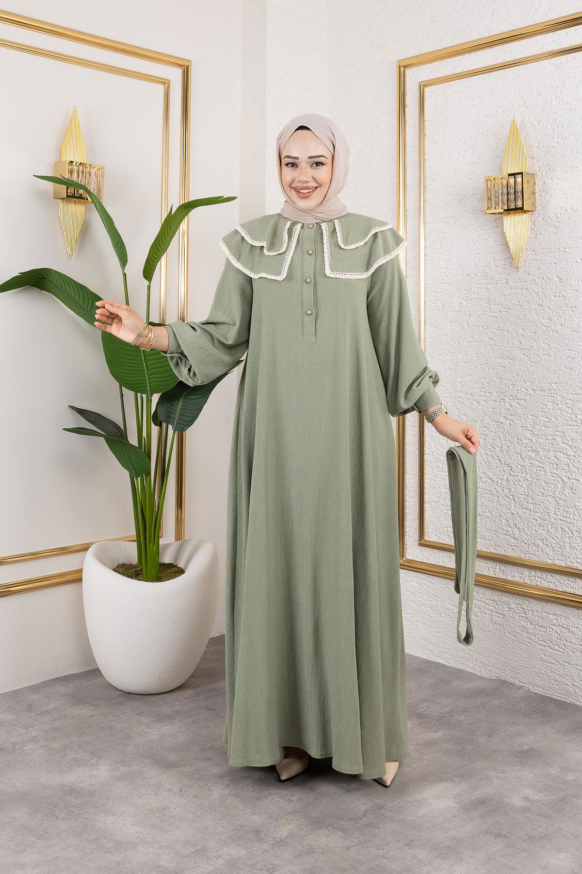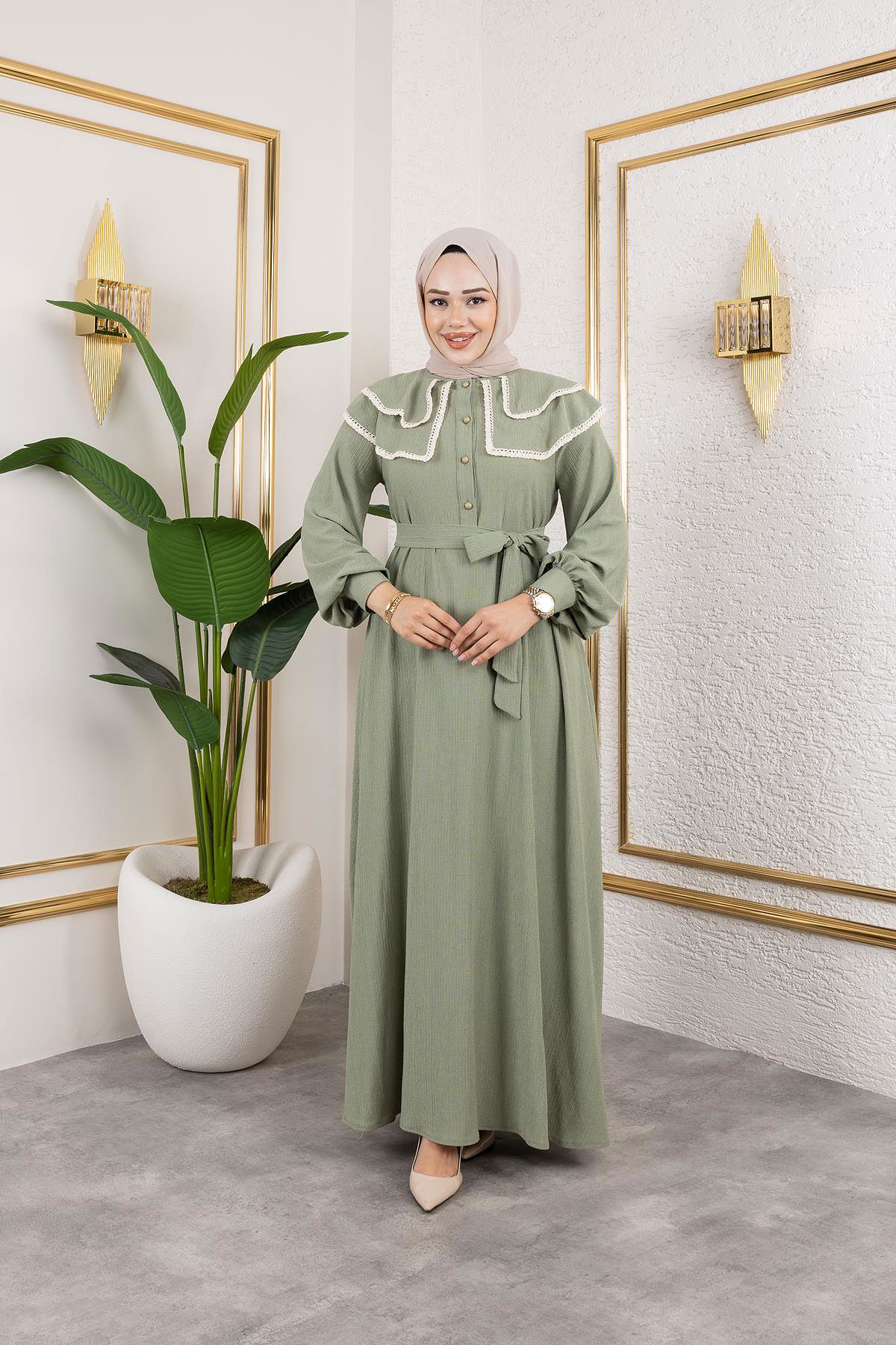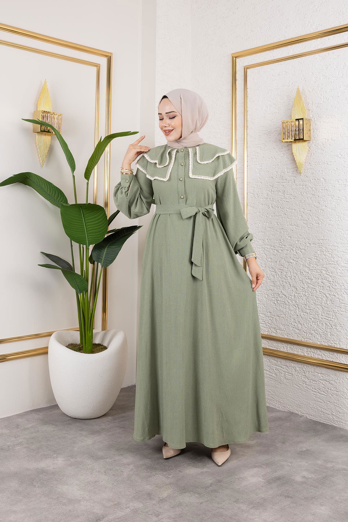 Dantel Detaylı Kloş Tesettür Elbise-5031Su yeşili