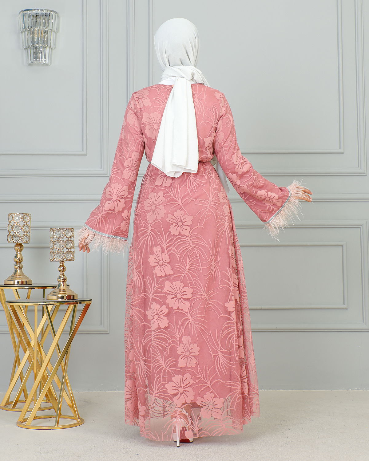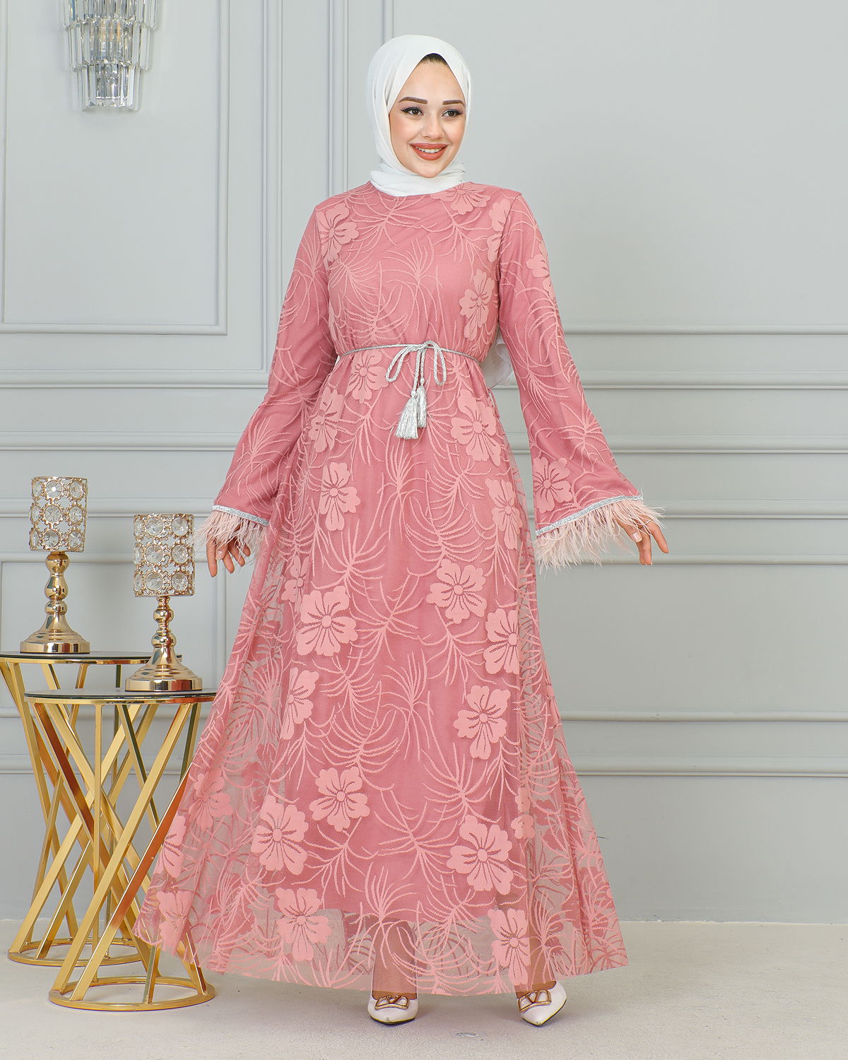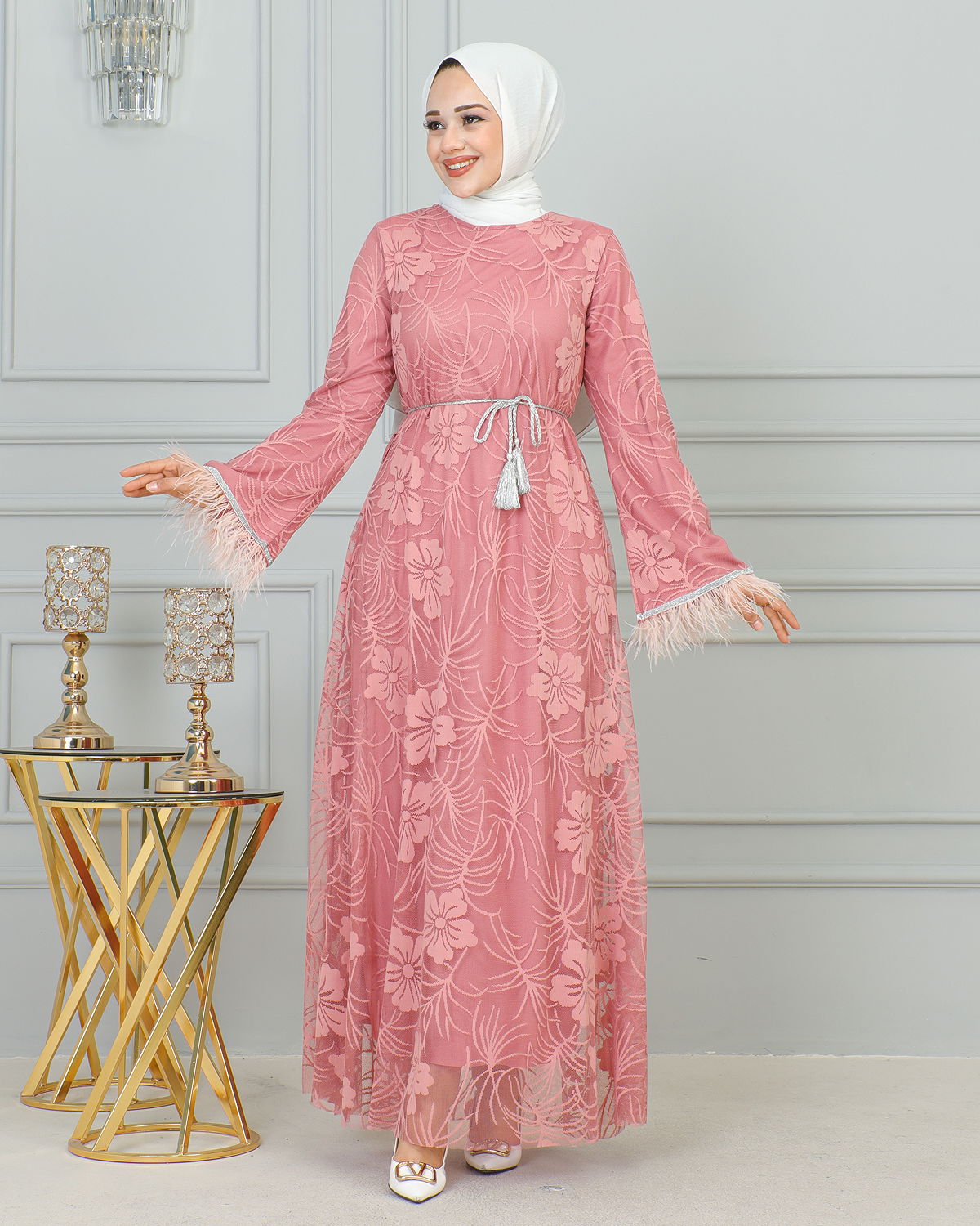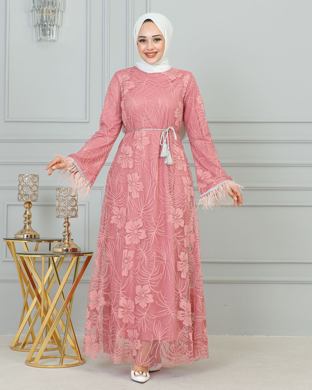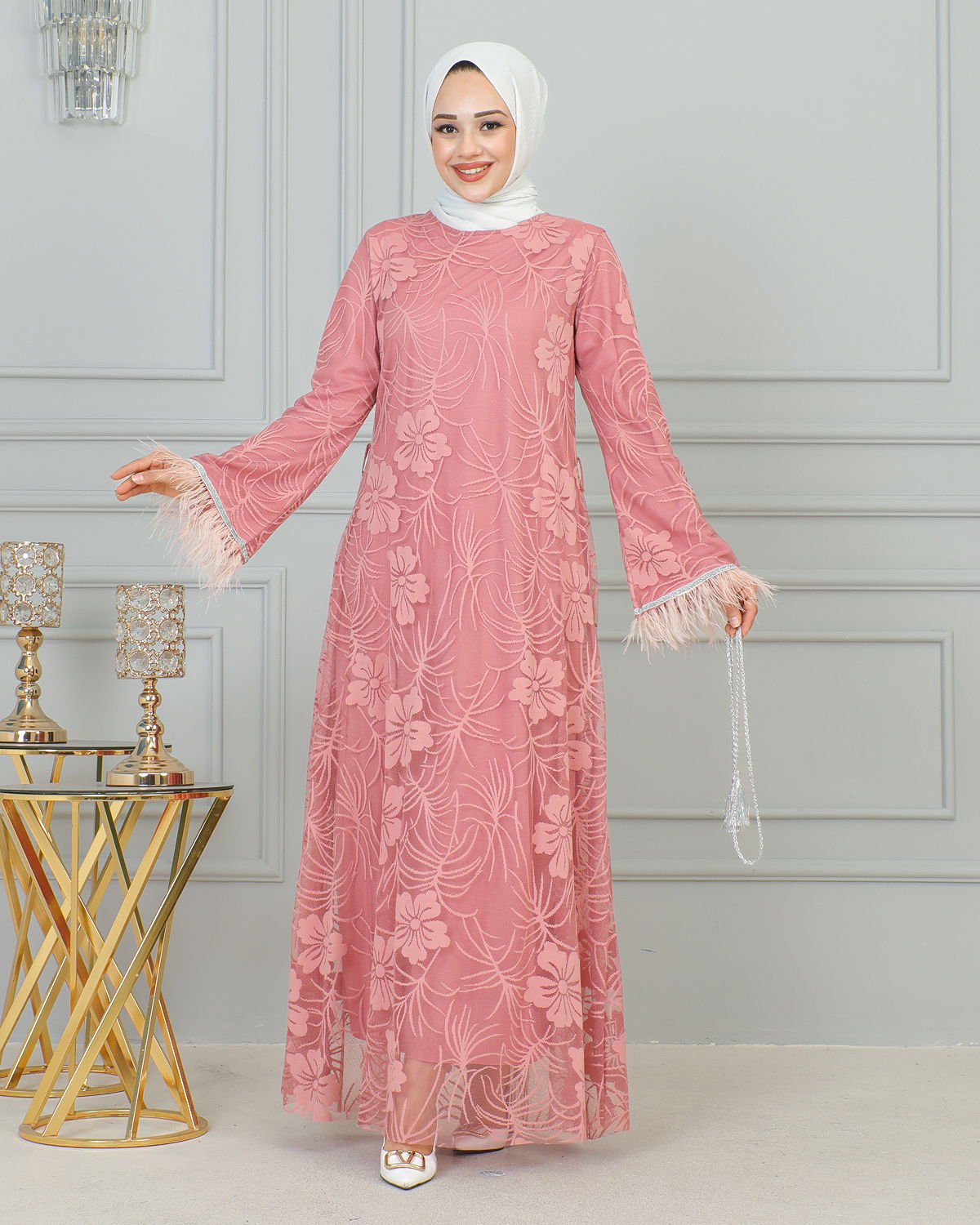 Dantel Ve Tüy Detaylı Tesettür Elbise-3177 Gülkurusu
