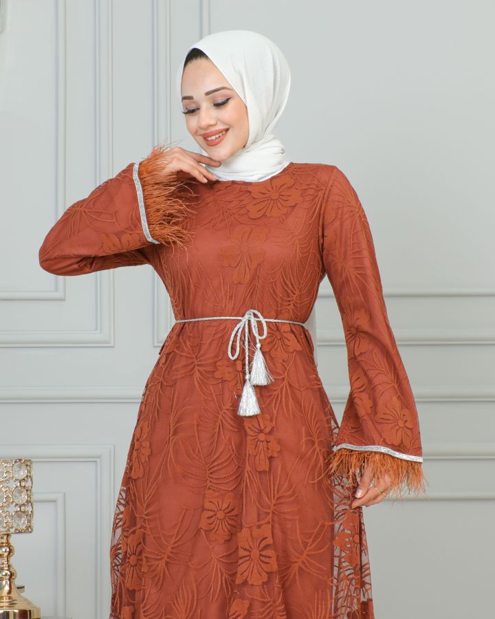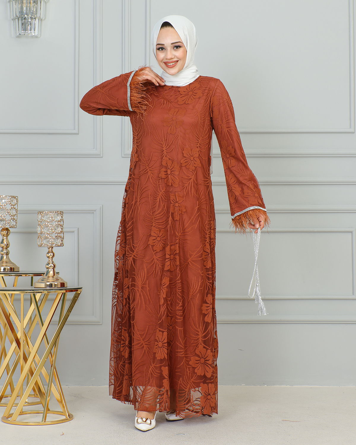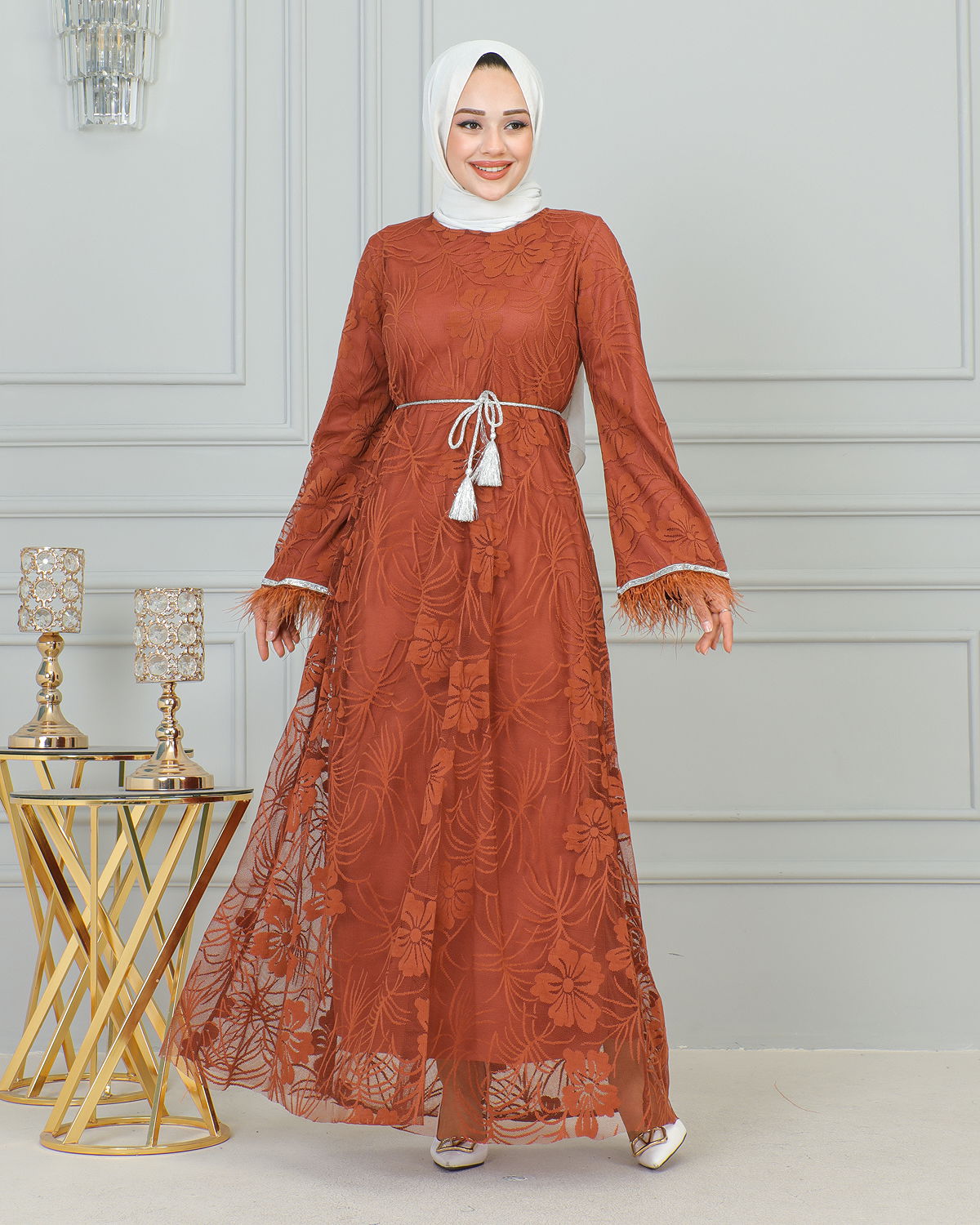 Dantel Ve Tüy Detaylı Tesettür Elbise-3177 Kiremit