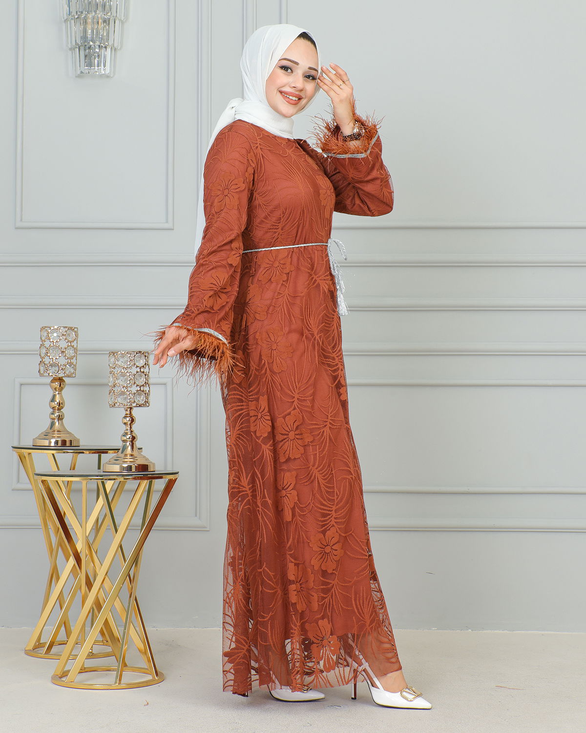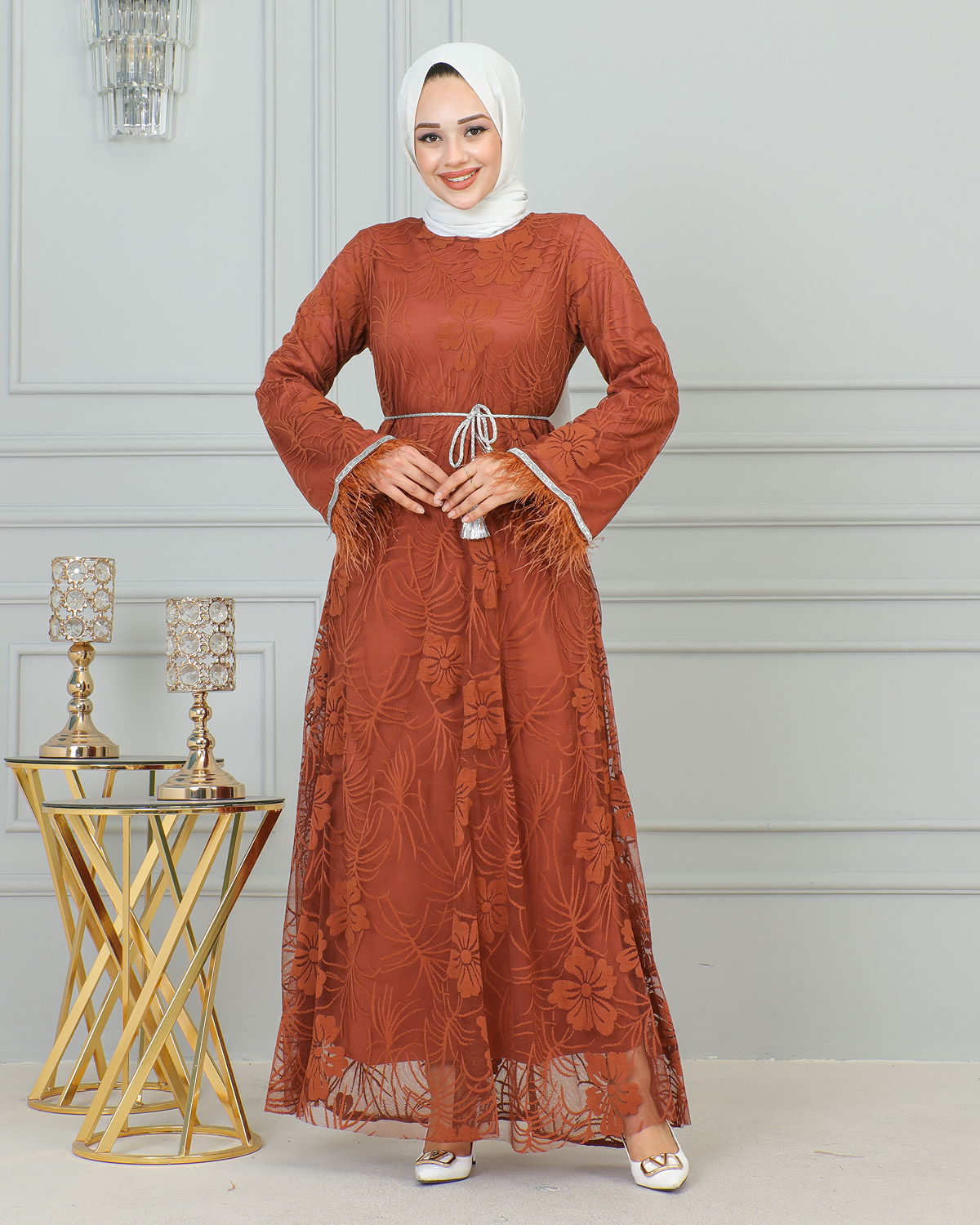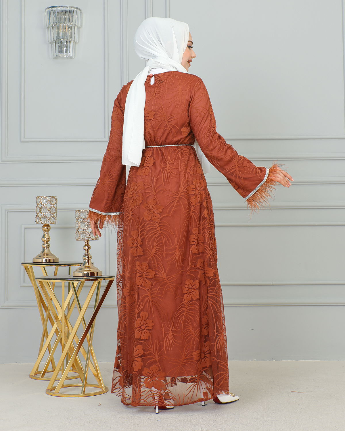 Dantel Ve Tüy Detaylı Tesettür Elbise-3177 Kiremit
