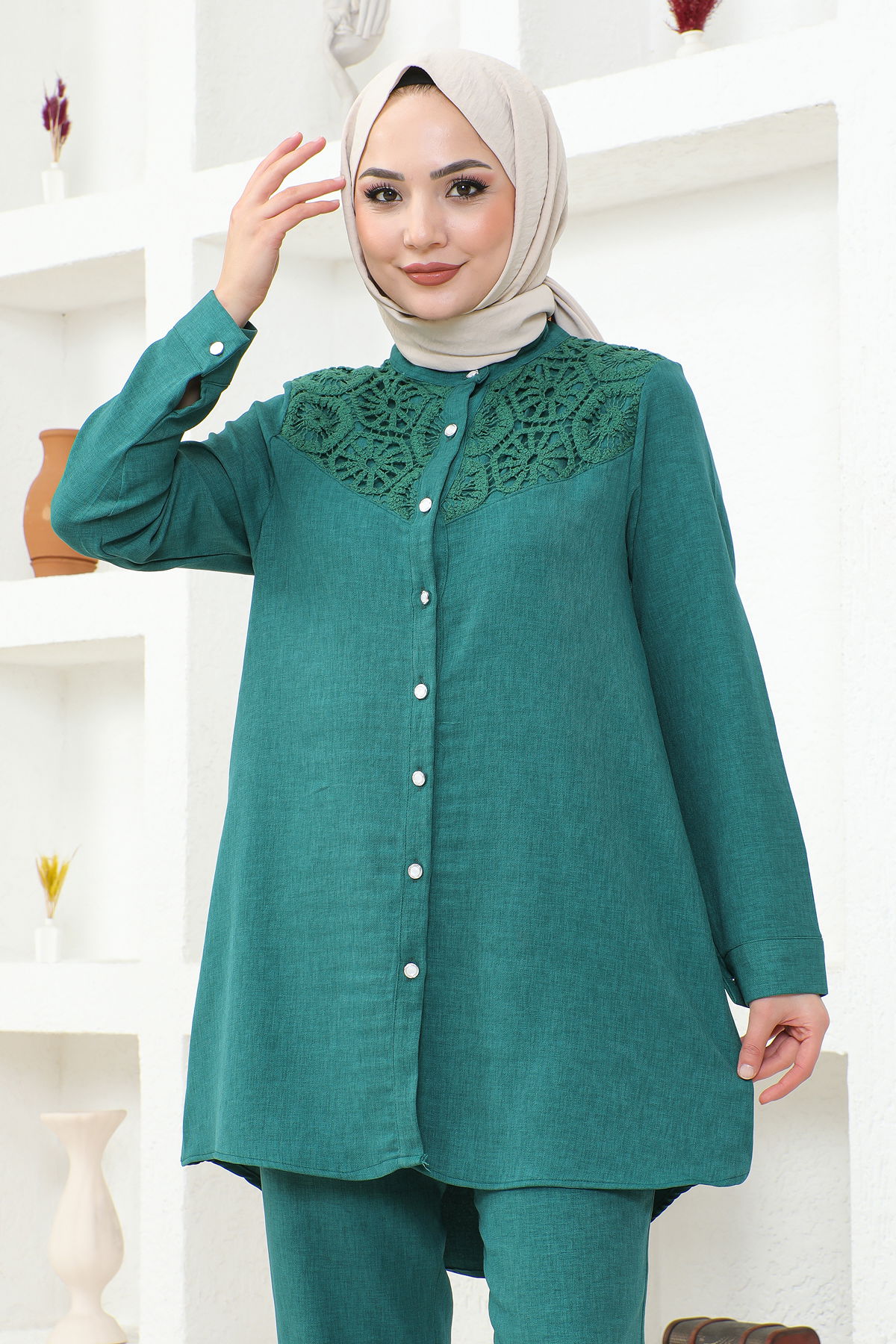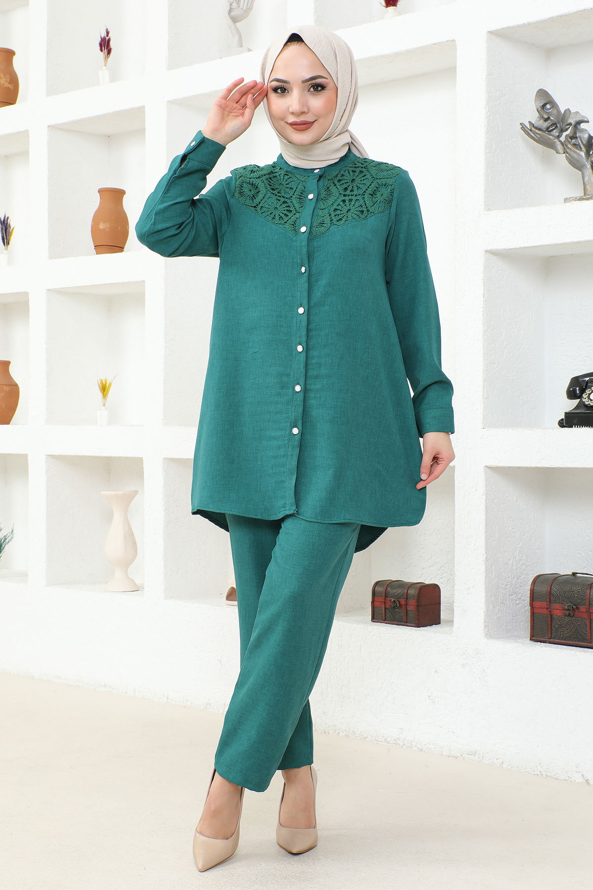 Dantelli İkili Tesettür Takım-3328 Zümrüt yeşili