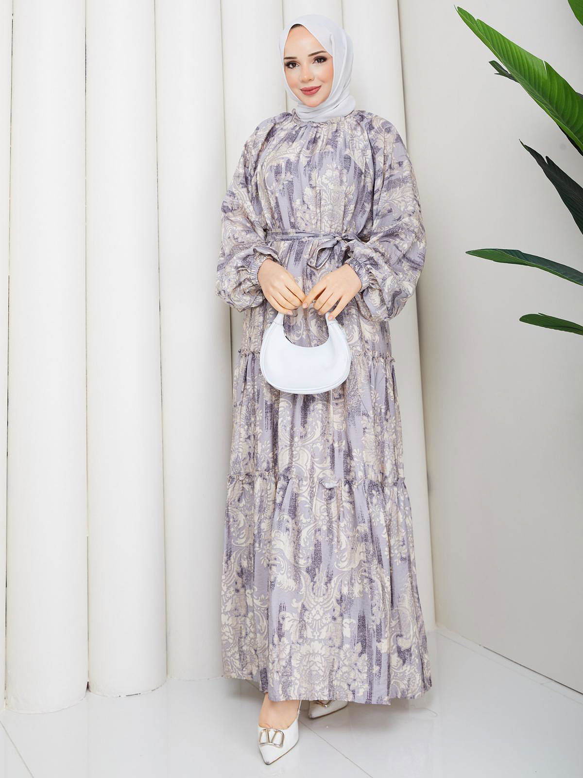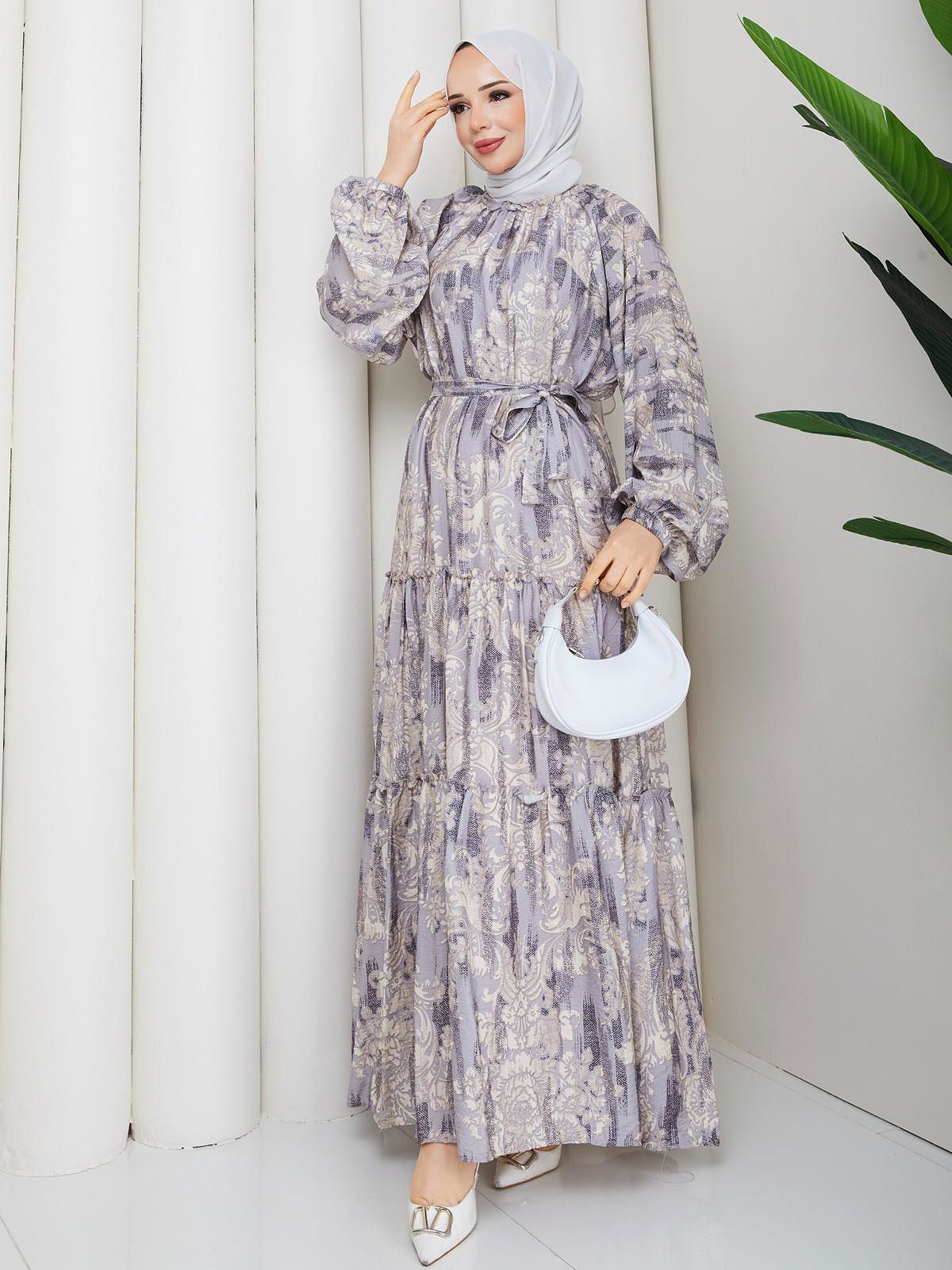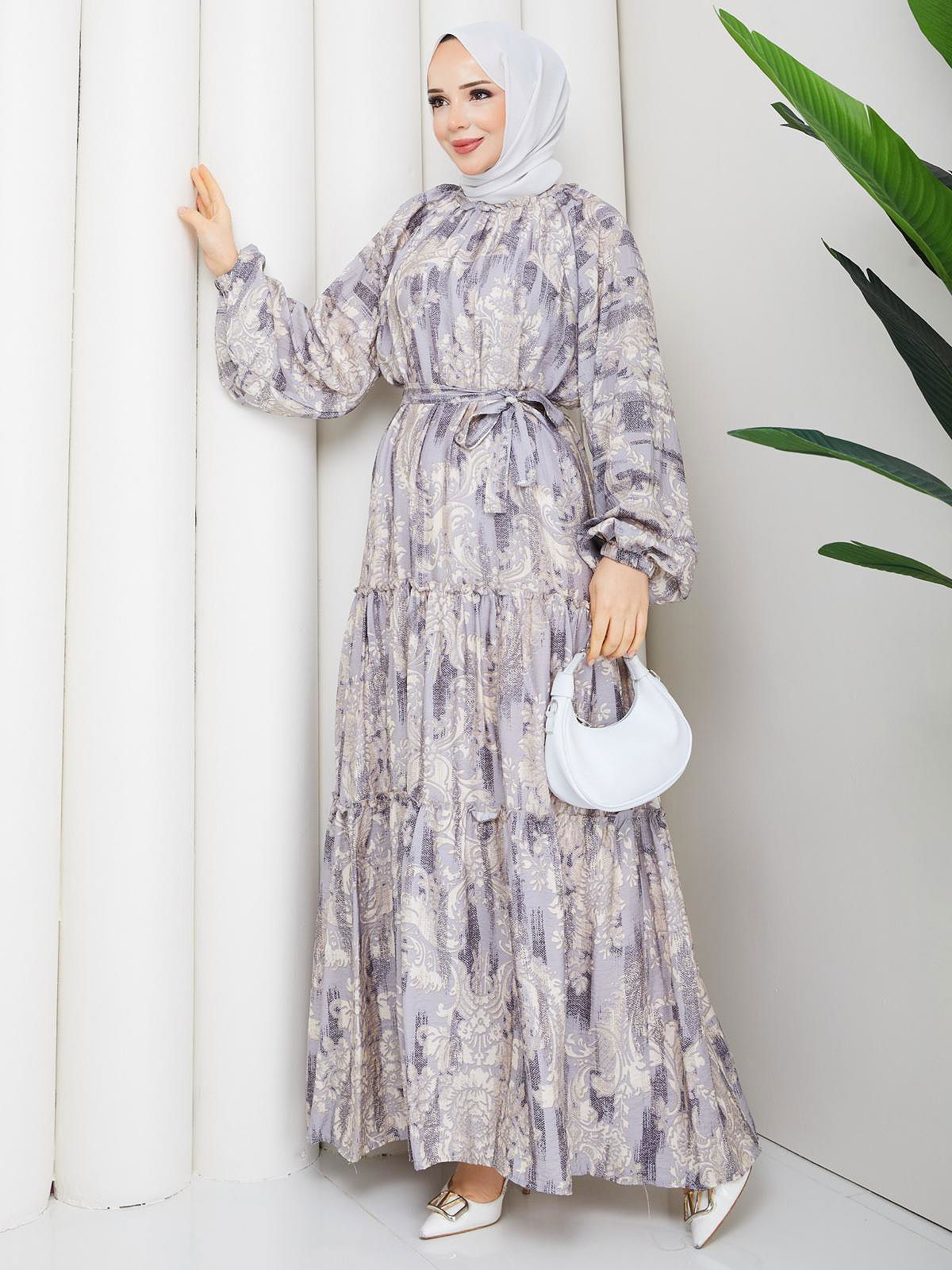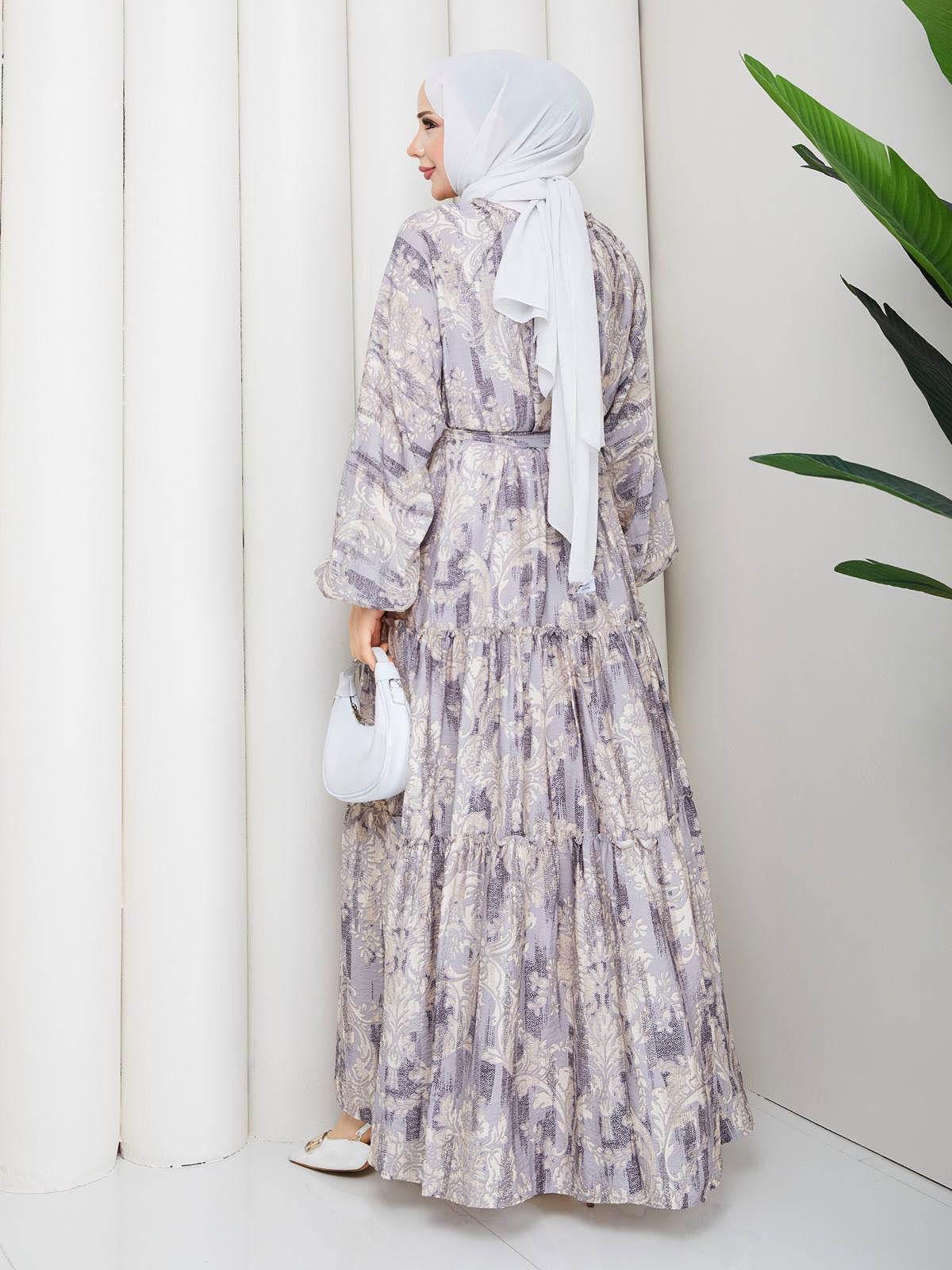 Desenli Kloş Kat Kat Elbise-5150 Gri