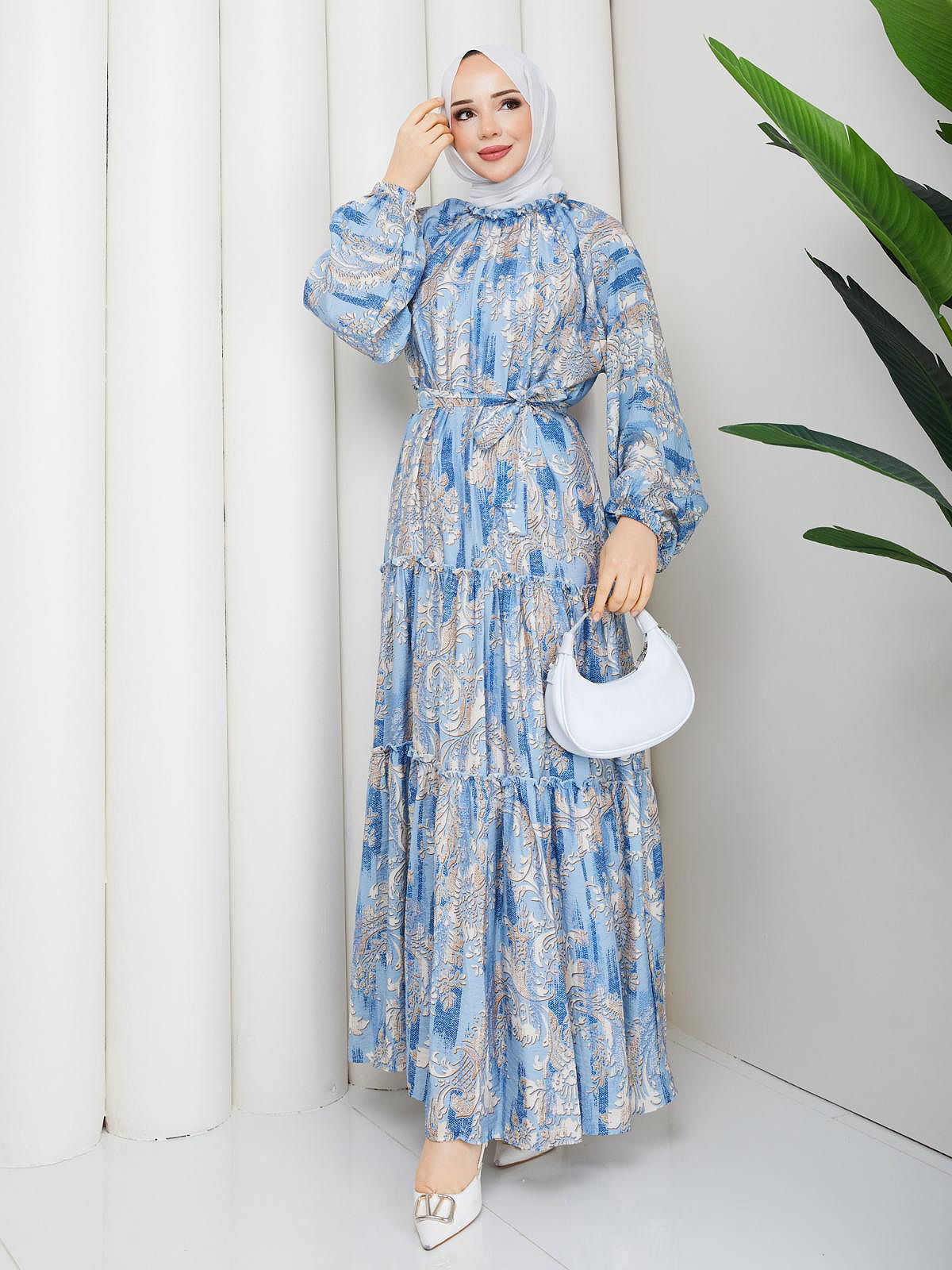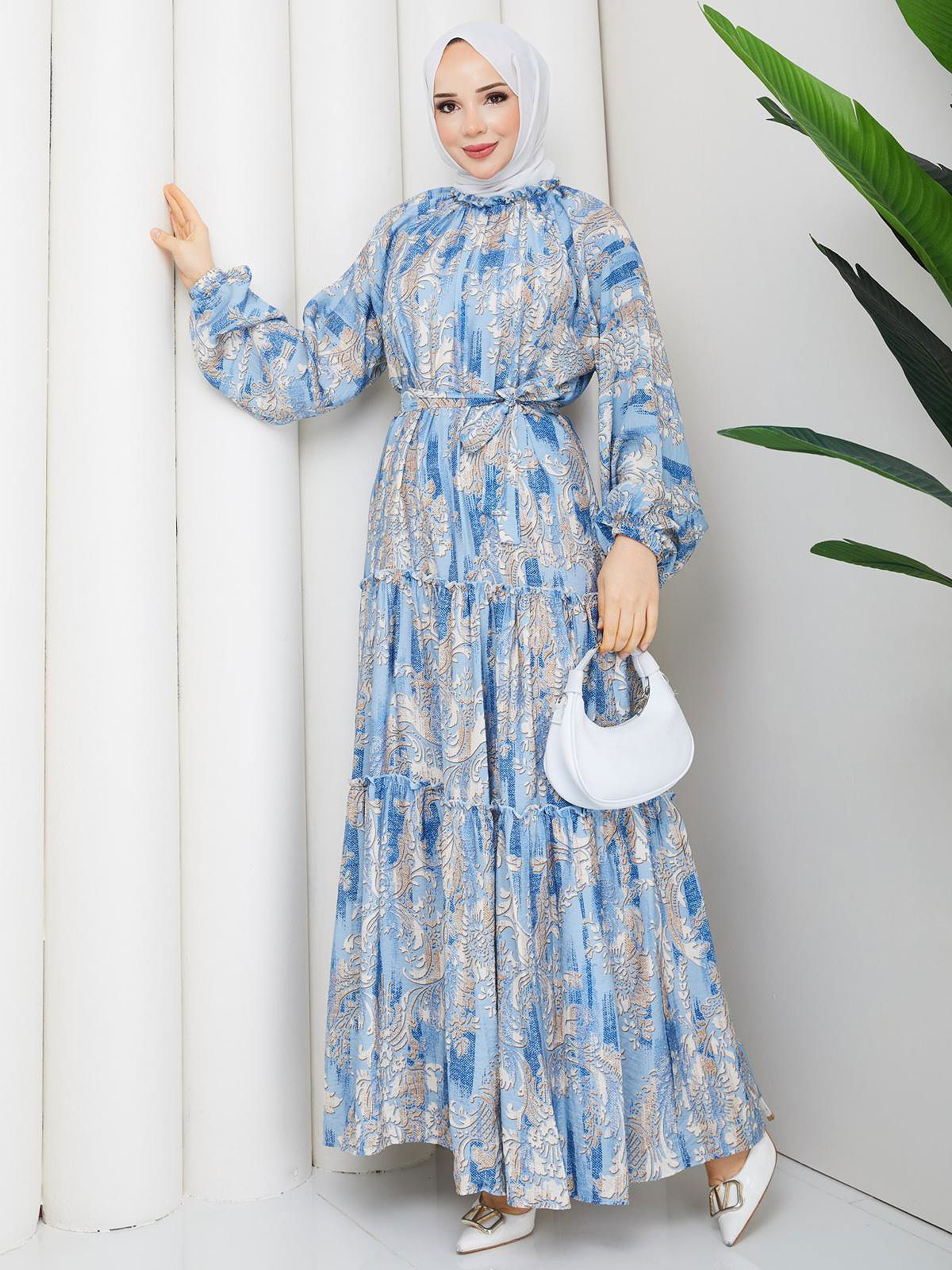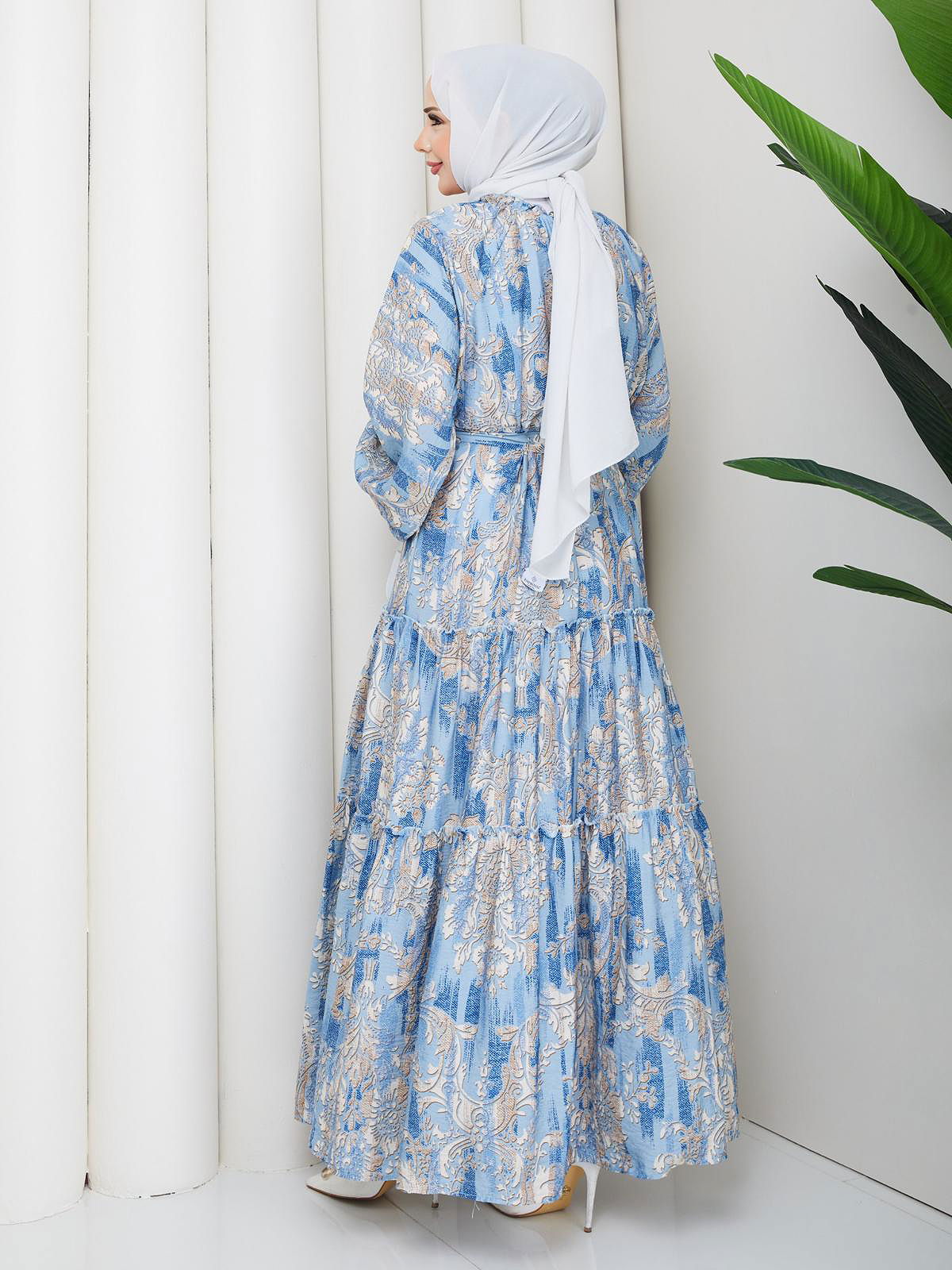 Desenli Kloş Kat Kat Elbise-5150 Mavi