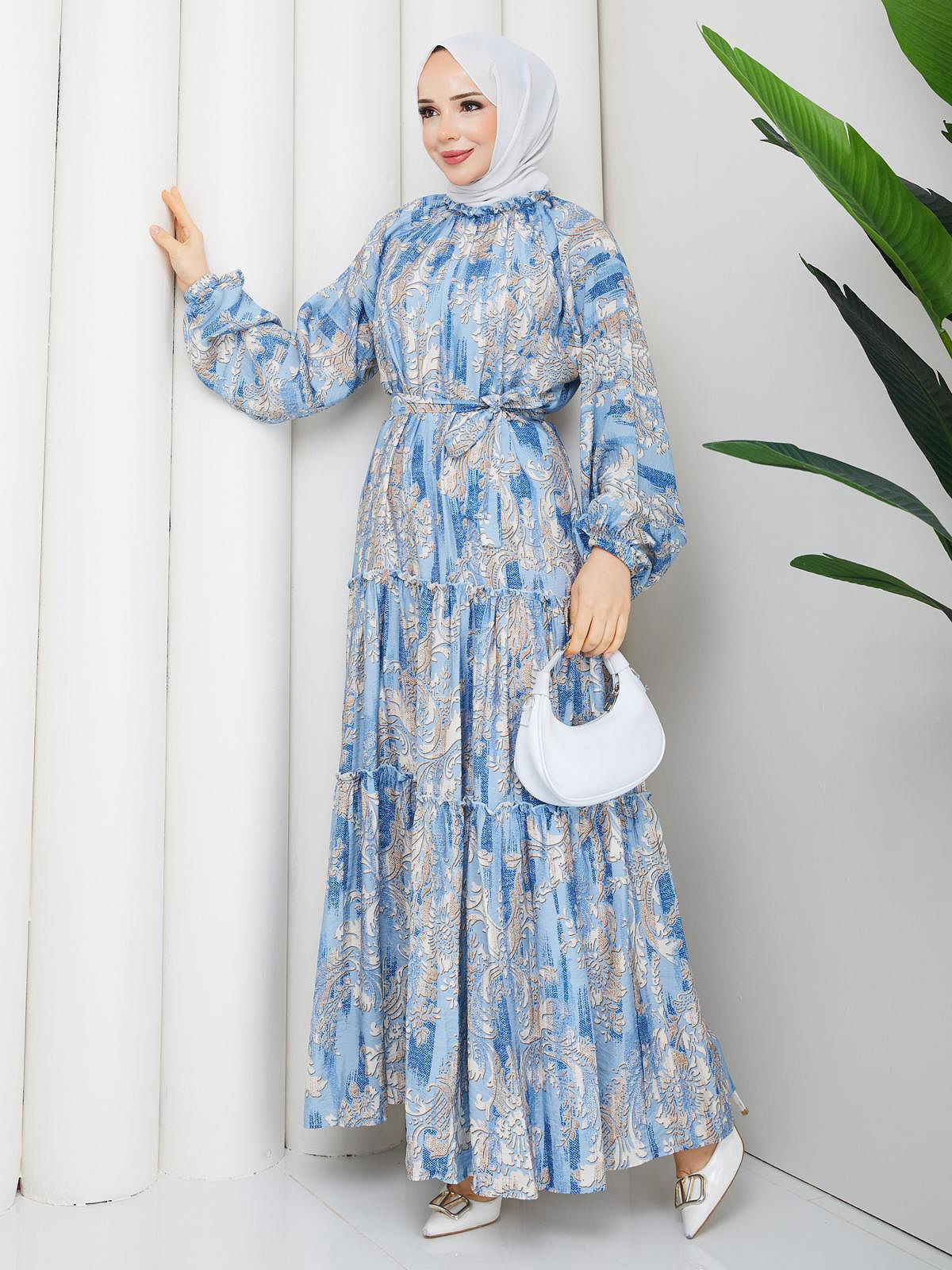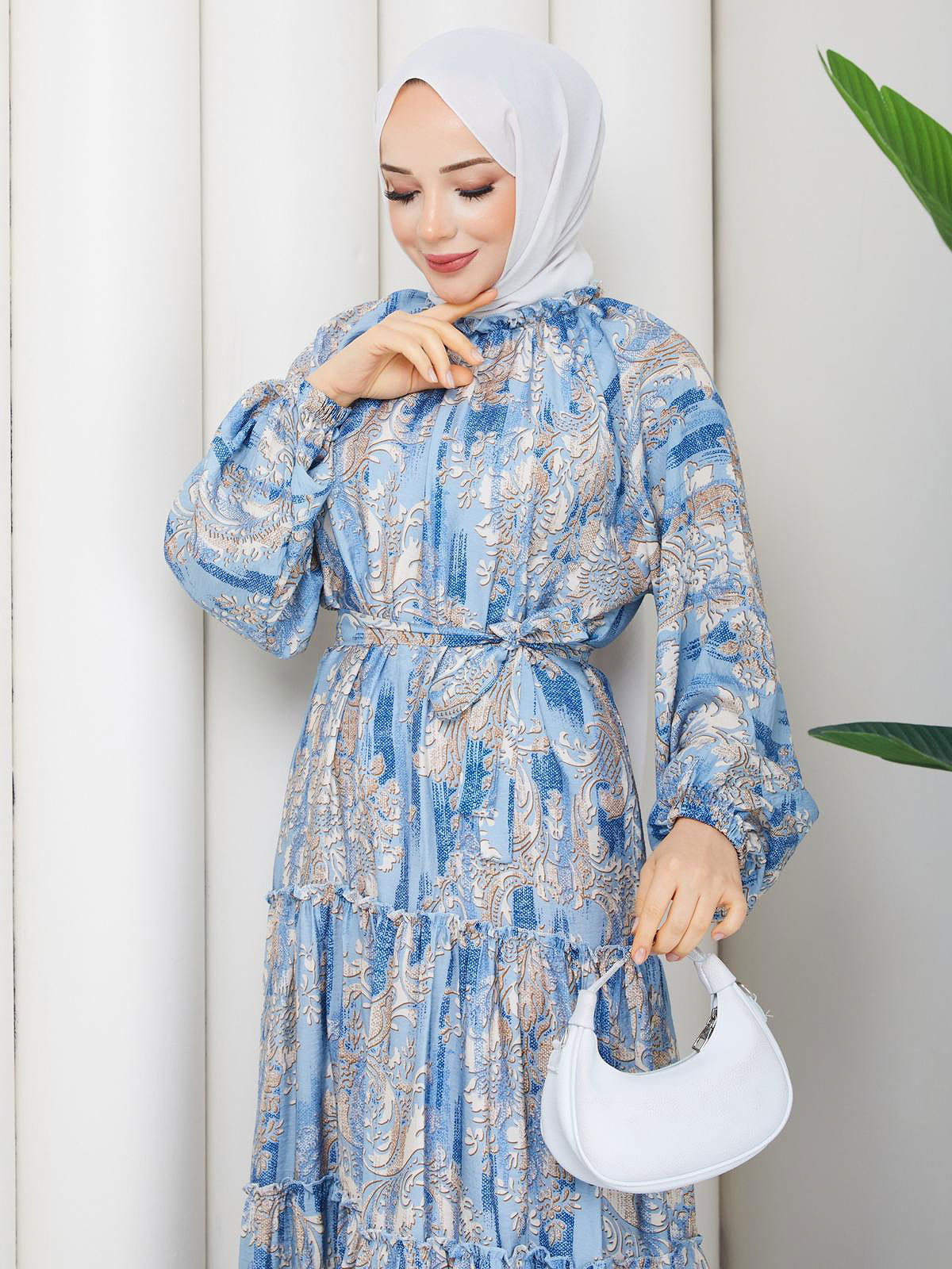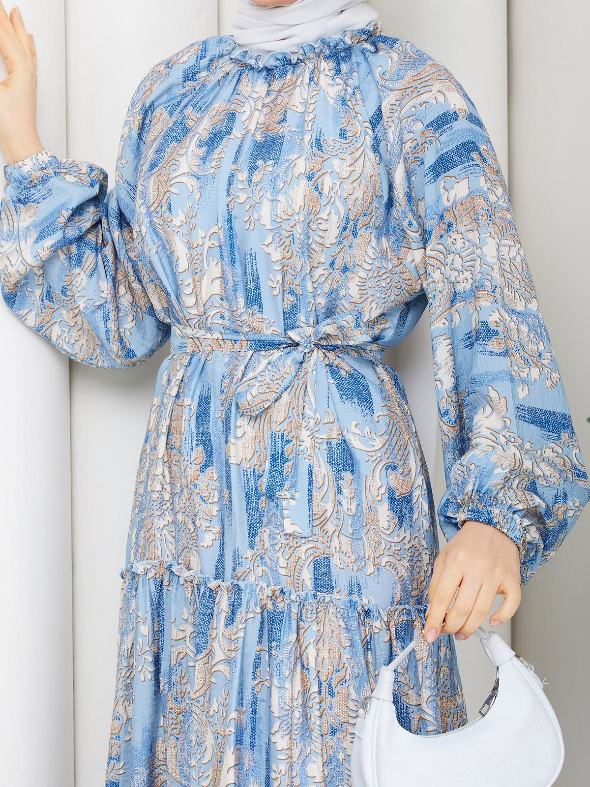 Desenli Kloş Kat Kat Elbise-5150 Mavi