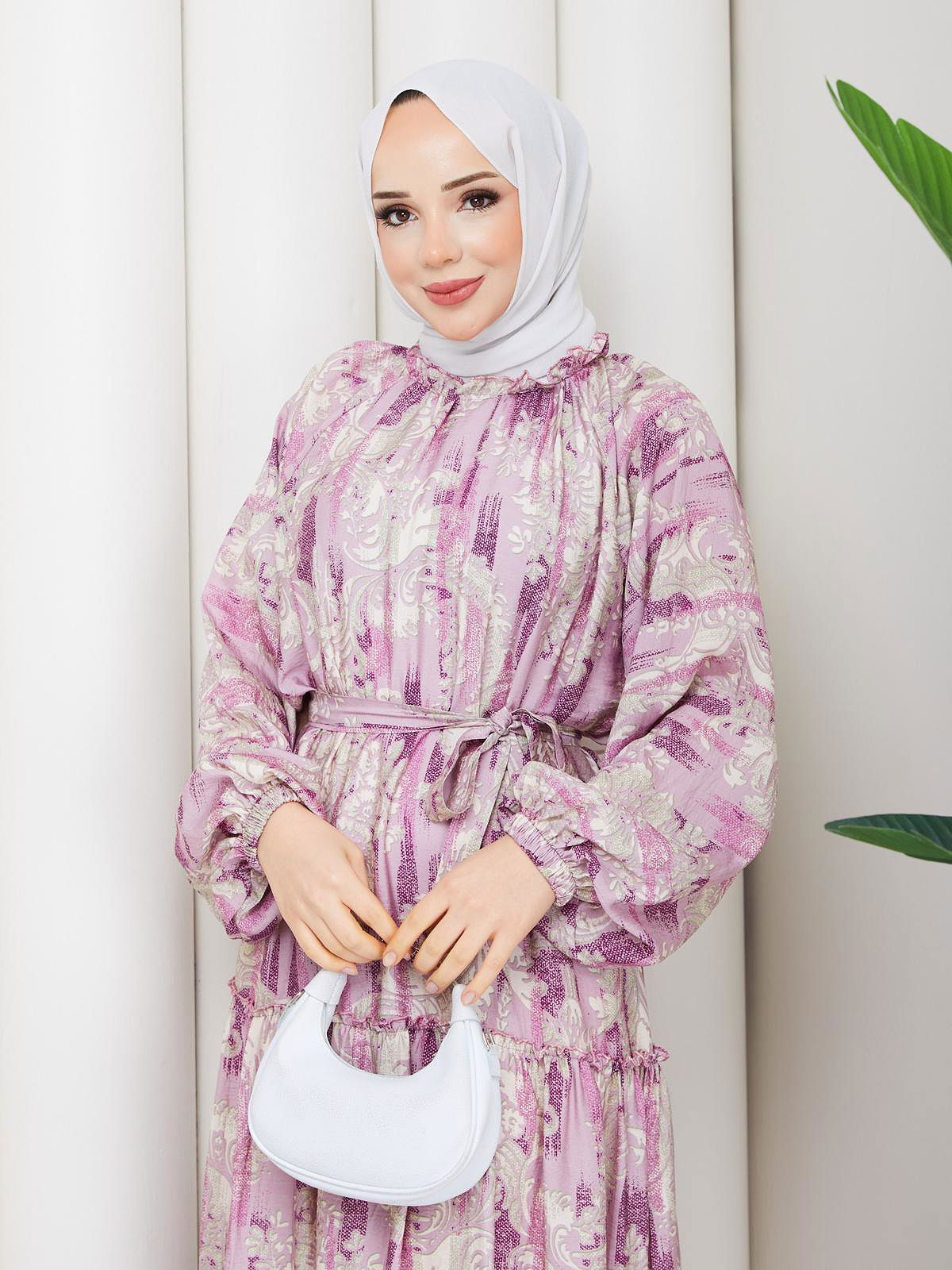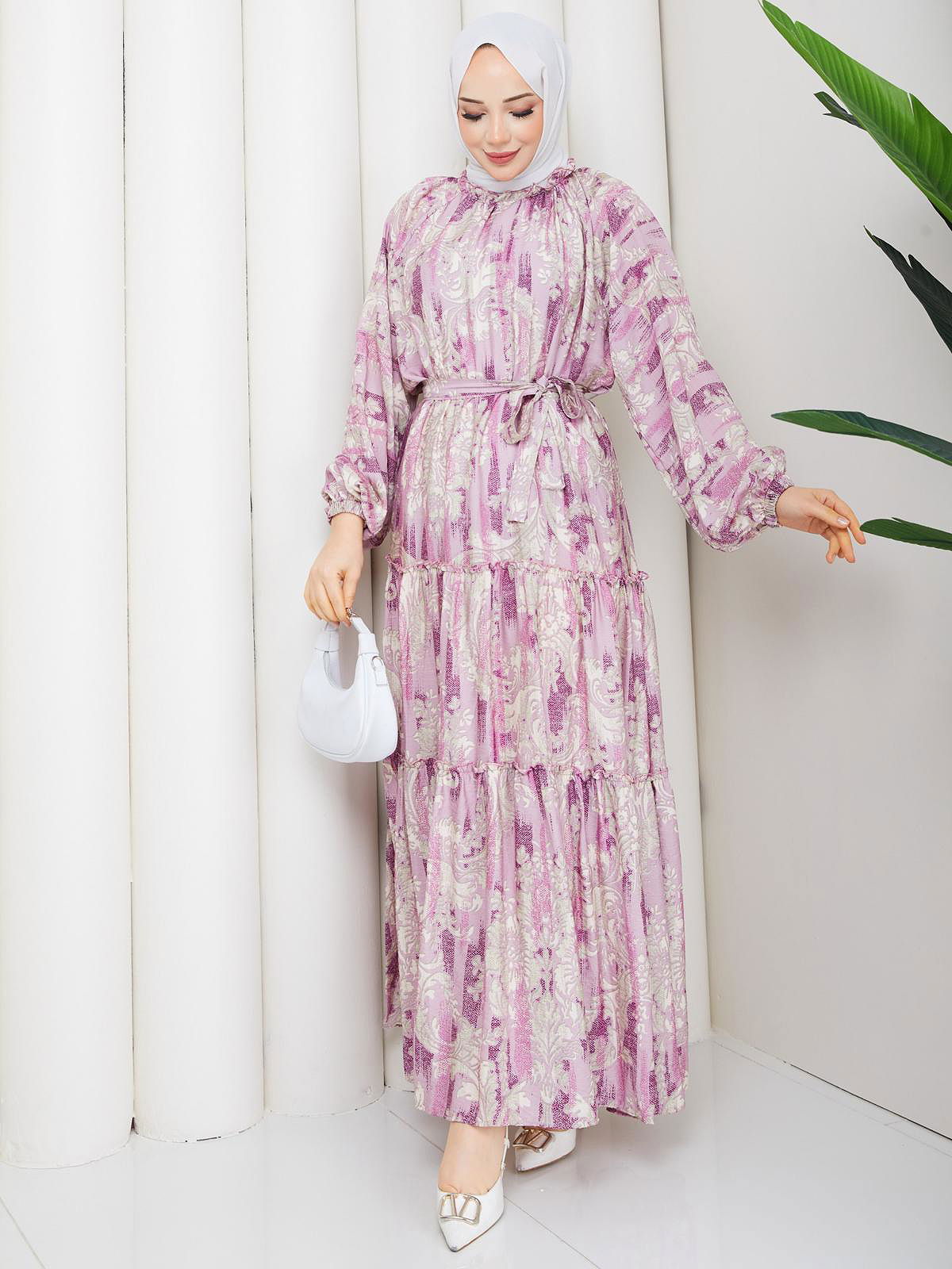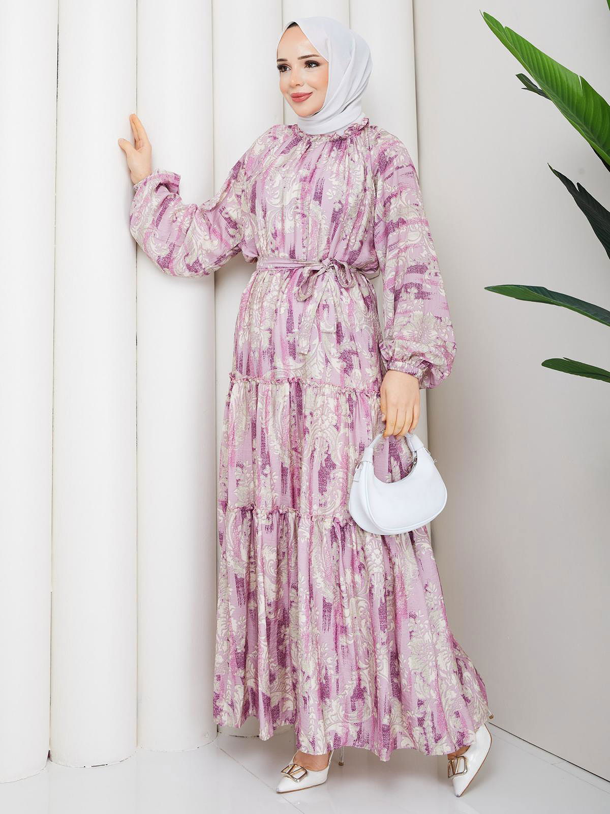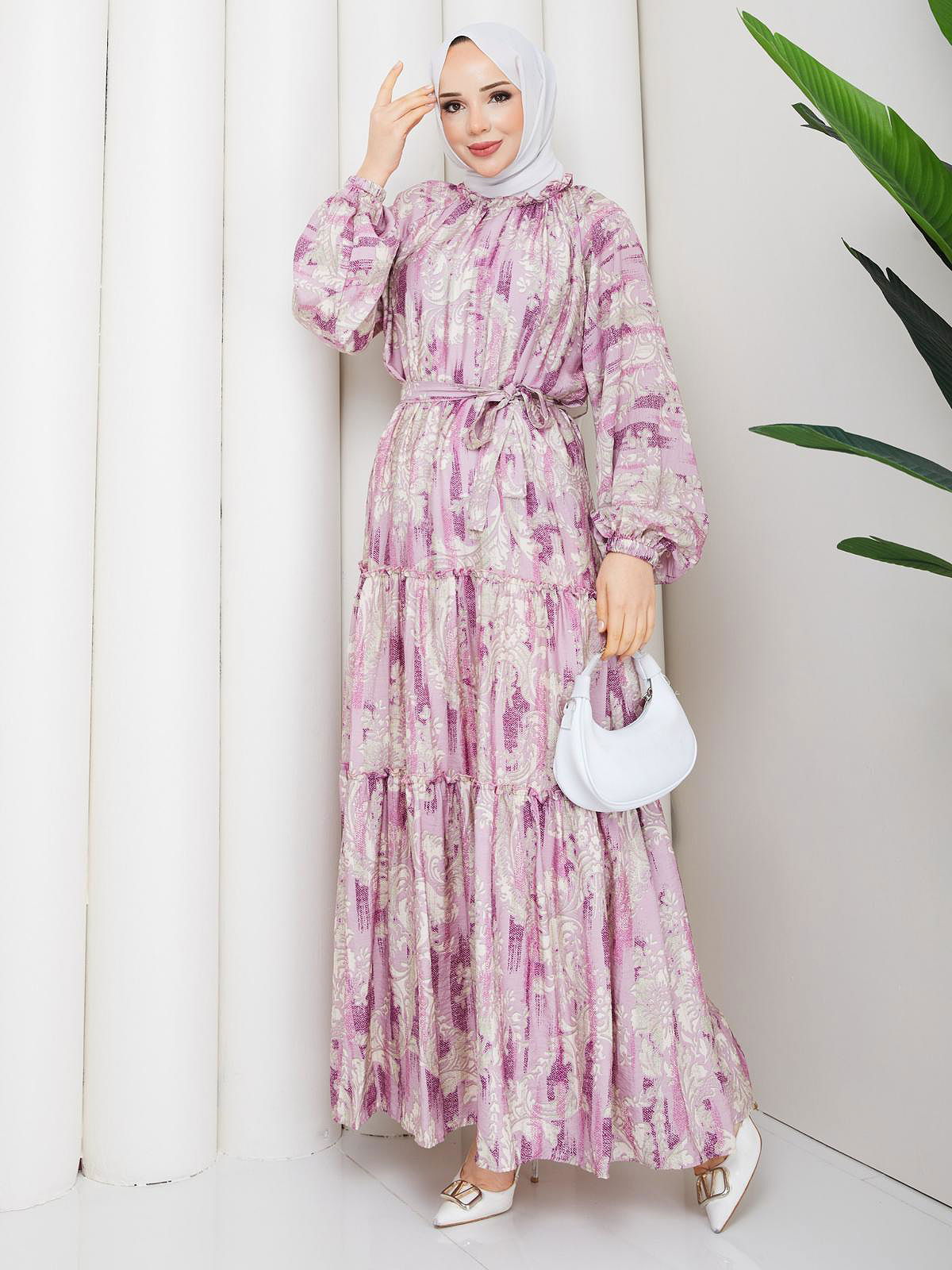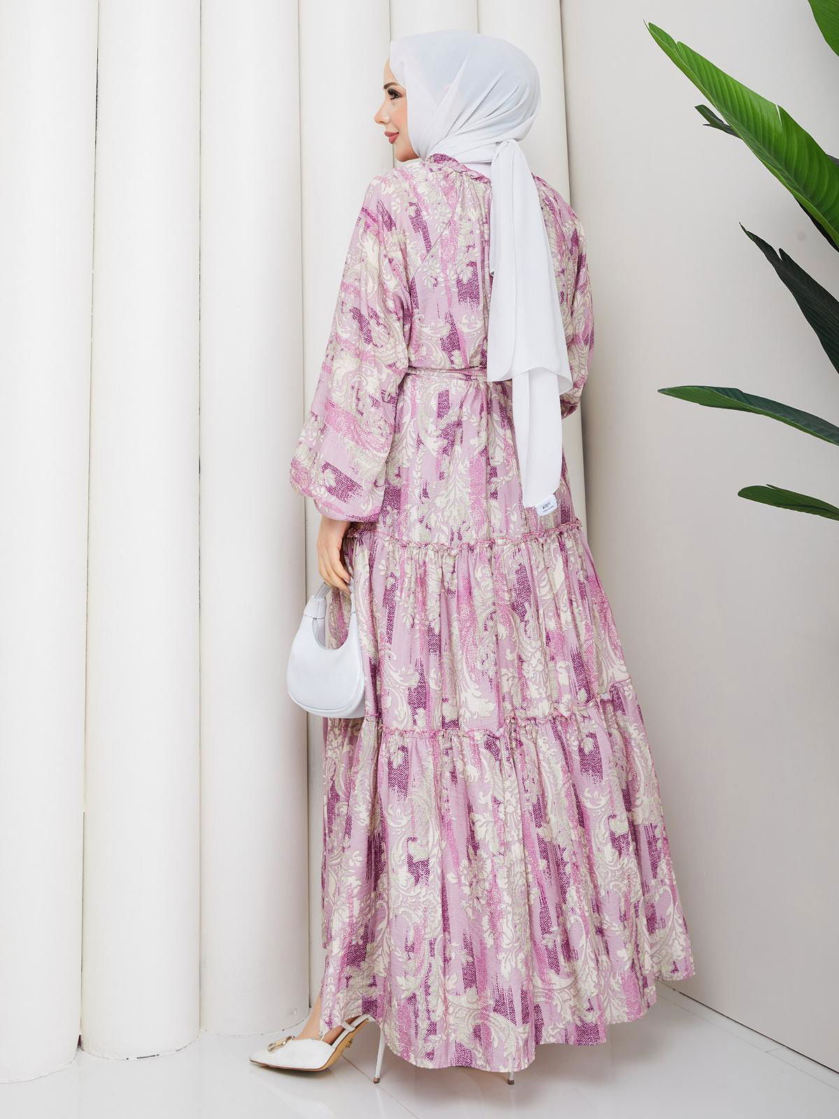 Desenli Kloş Kat Kat Elbise-5150 Mor