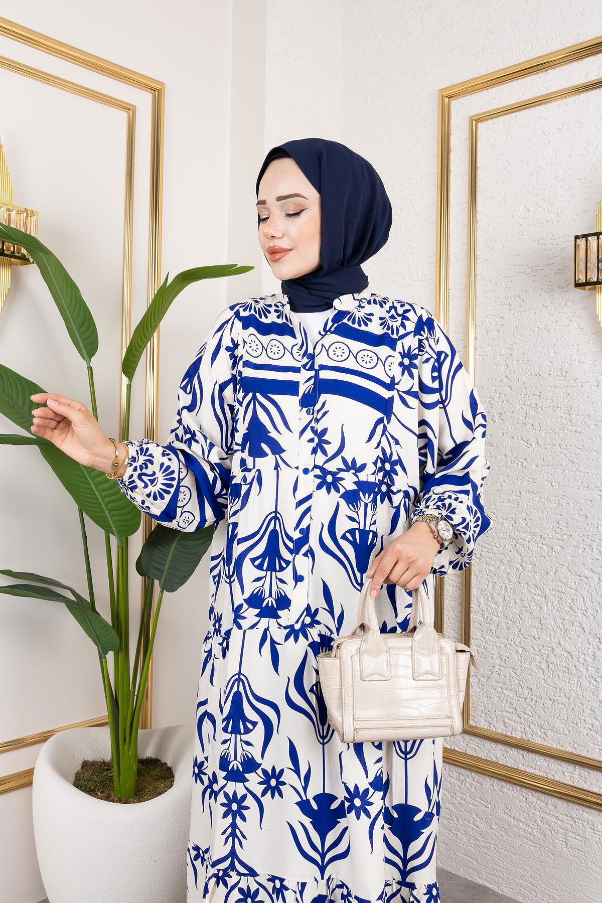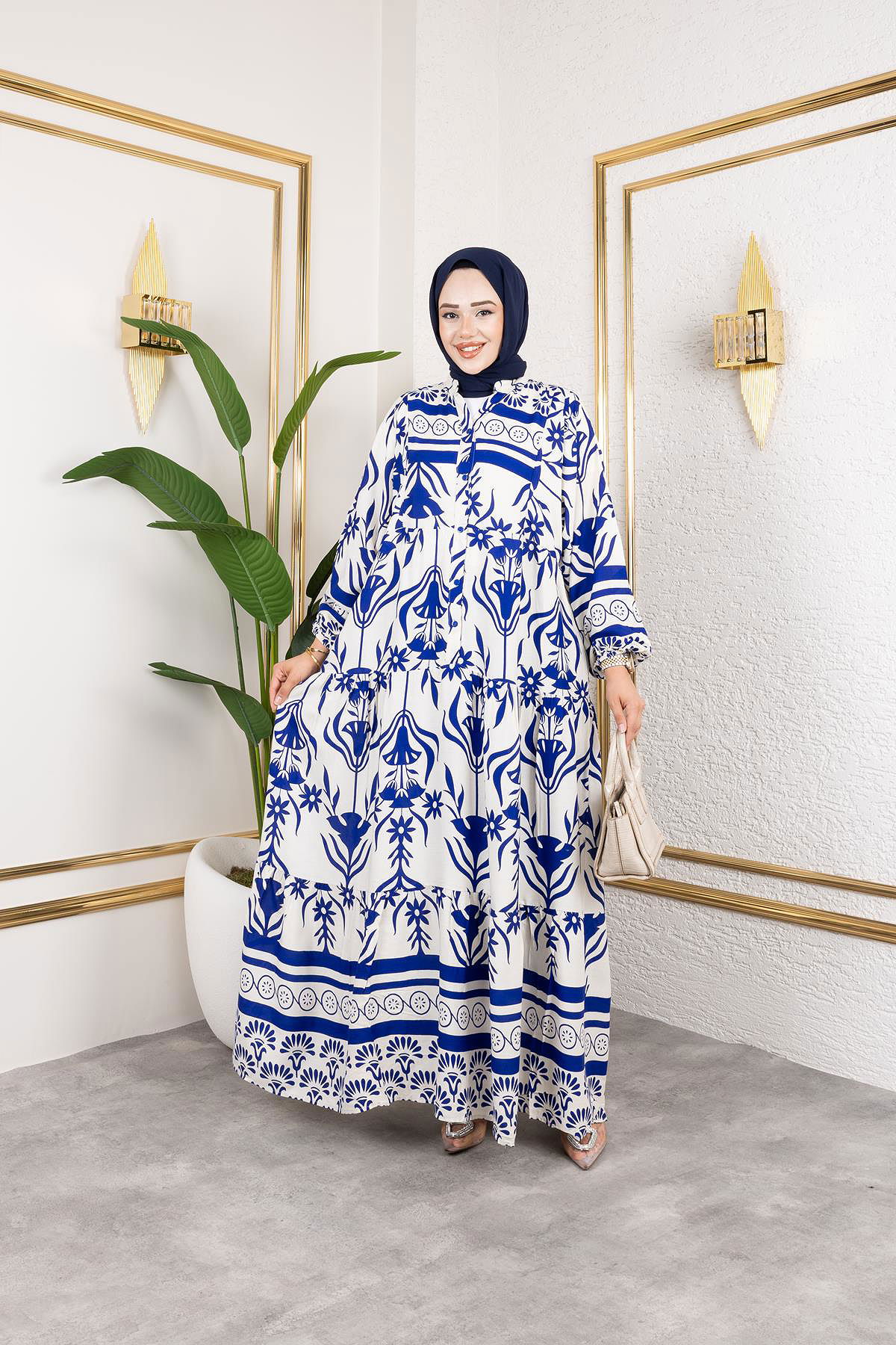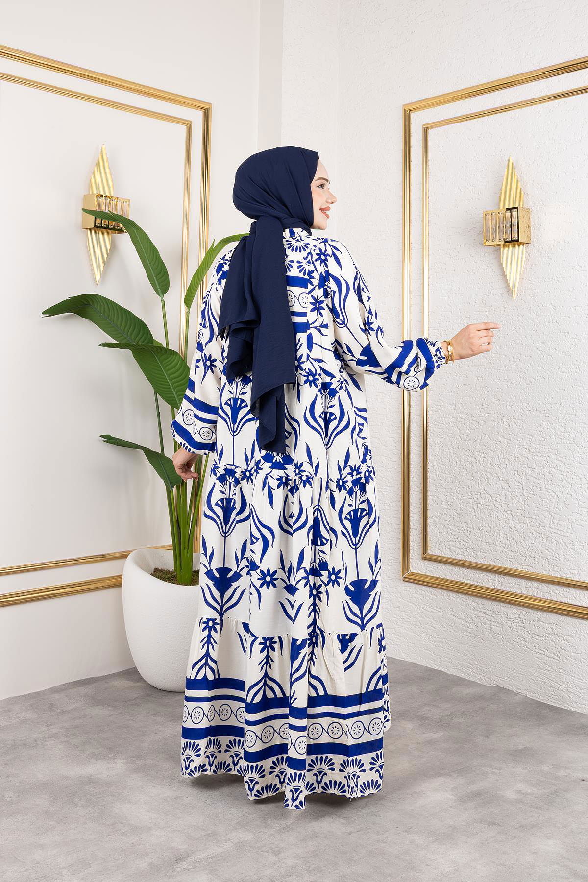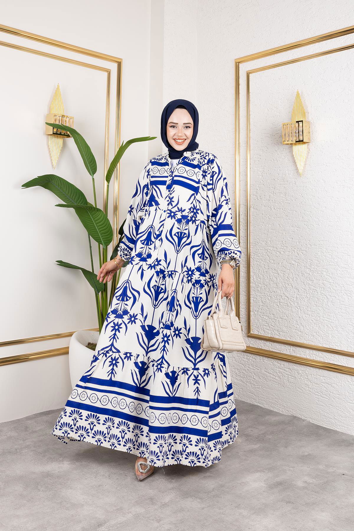 Desenli Tesettür Elbise-3038 Mavi