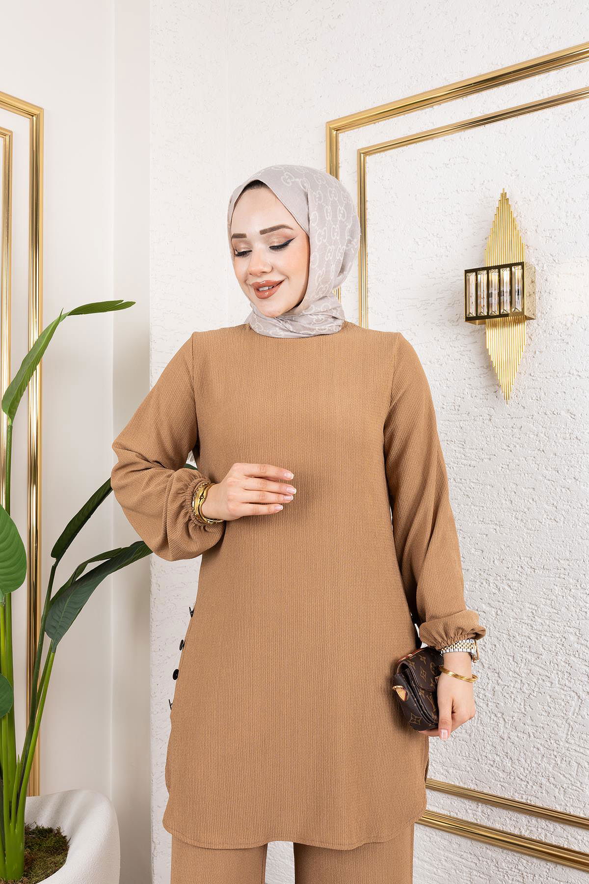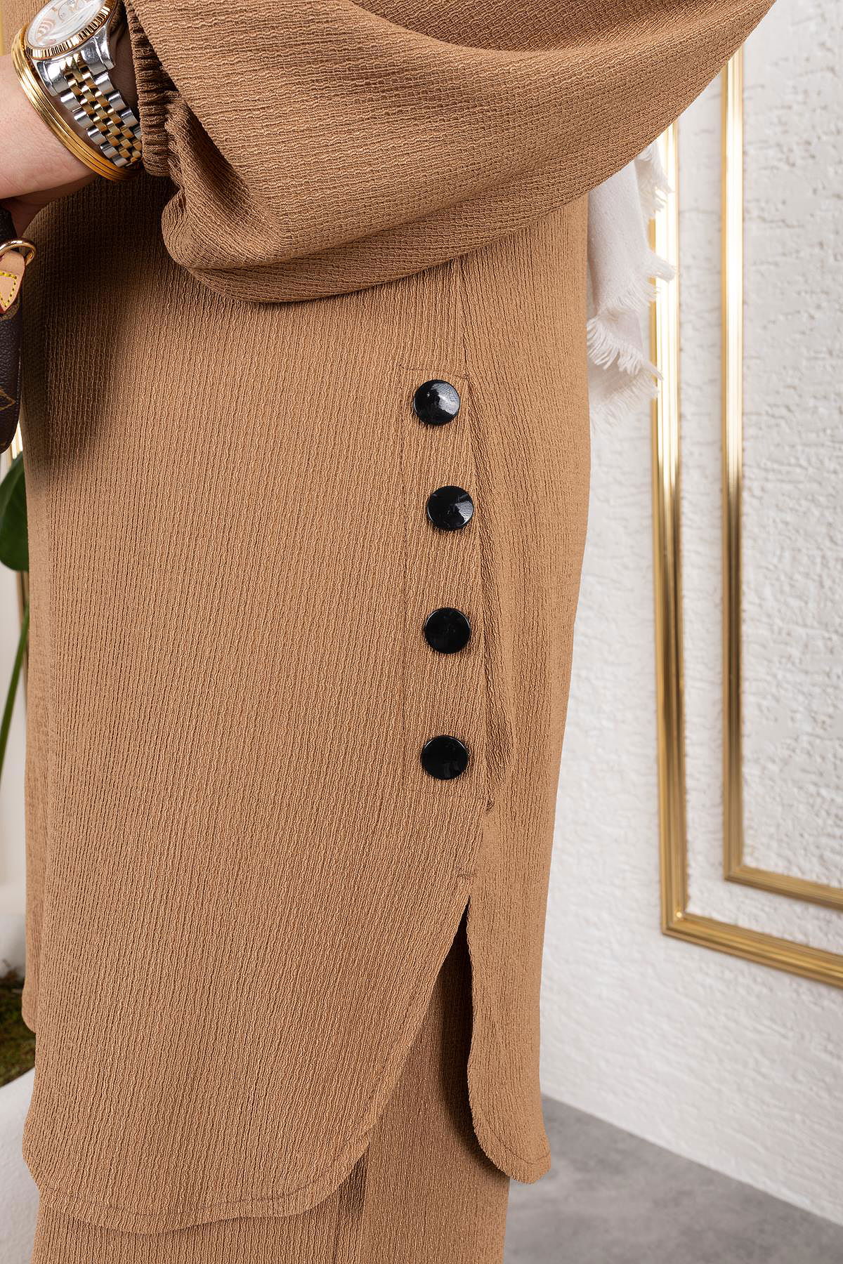 Düğme Detaylı Bürümcük Kumaş Tesettür Takım-3153 Latte