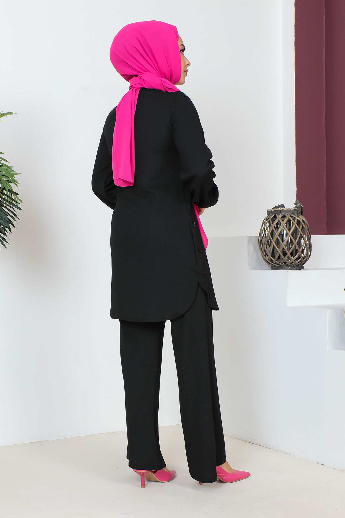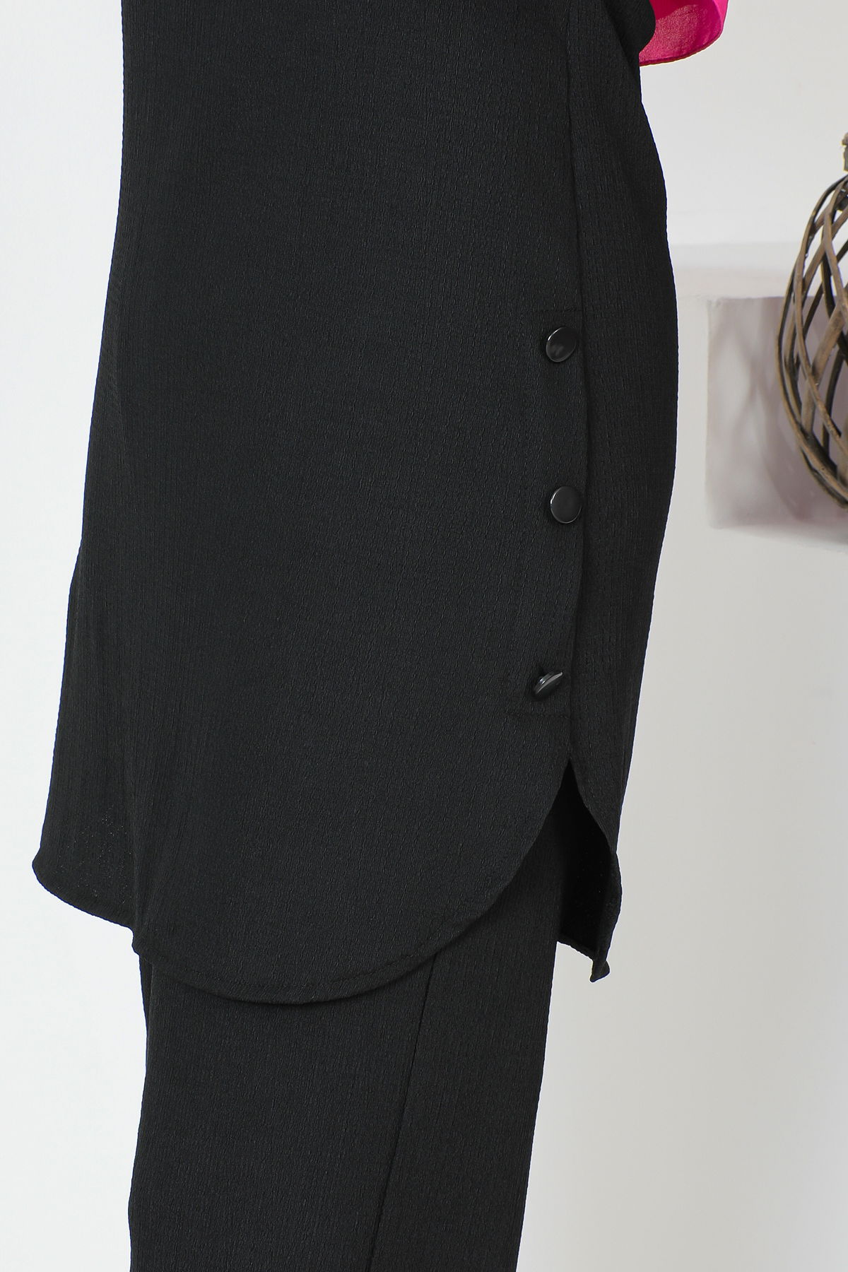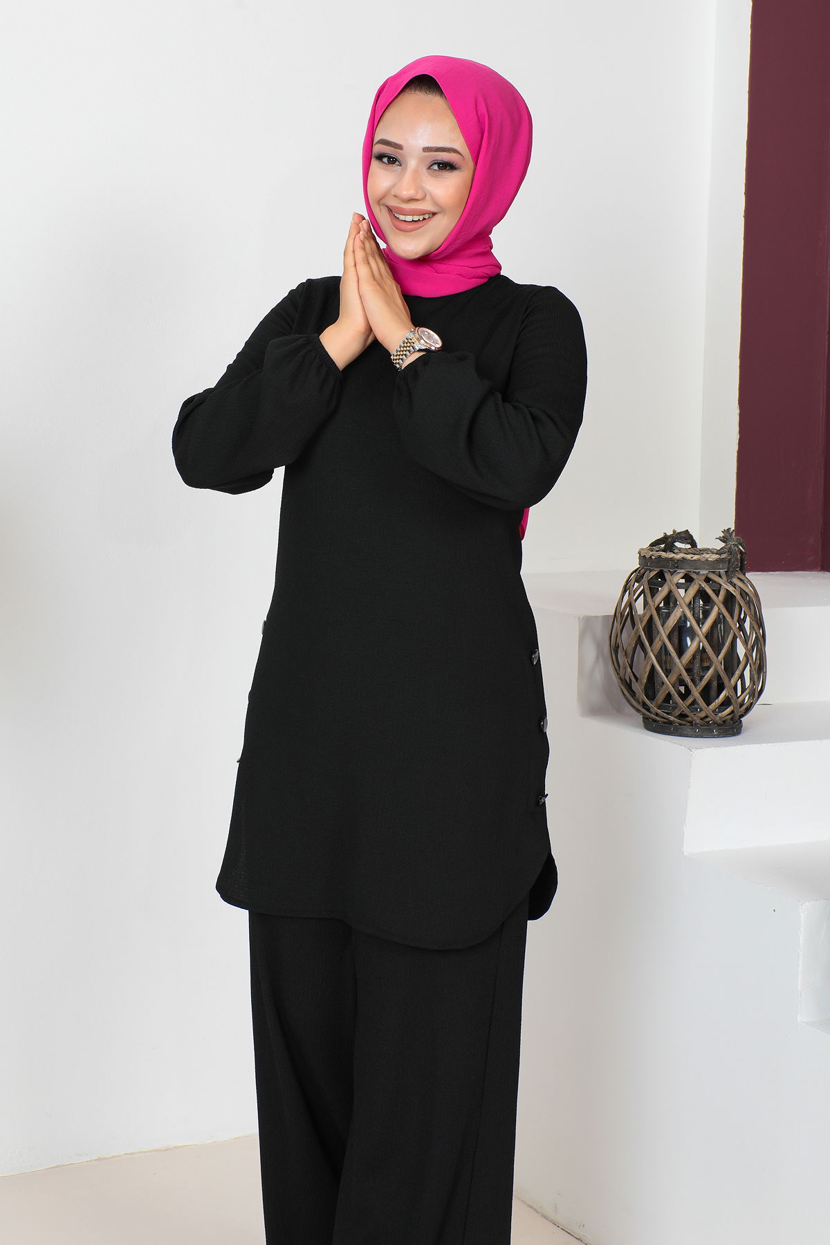 Düğme Detaylı Bürümcük Kumaş Tesettür Takım-3153 Siyah
