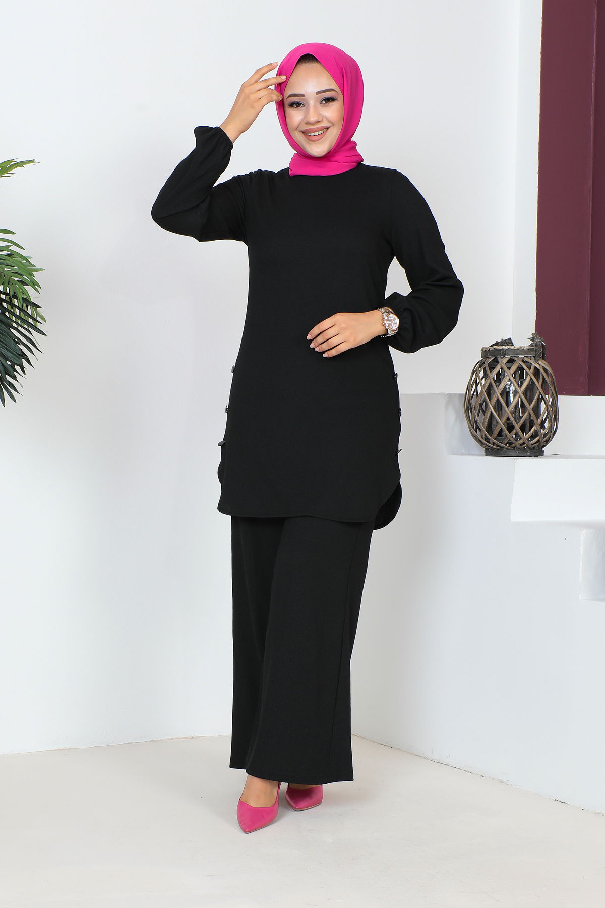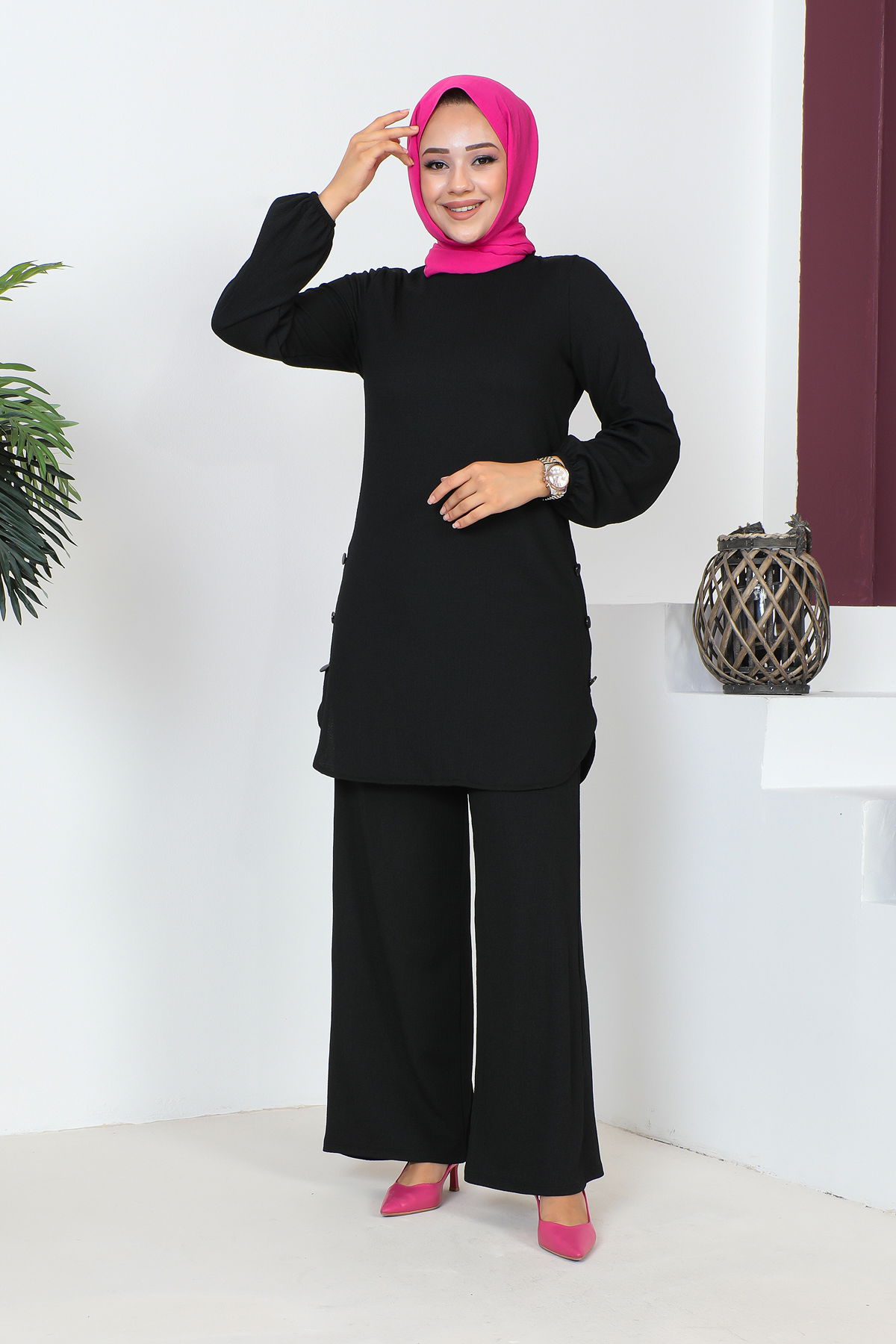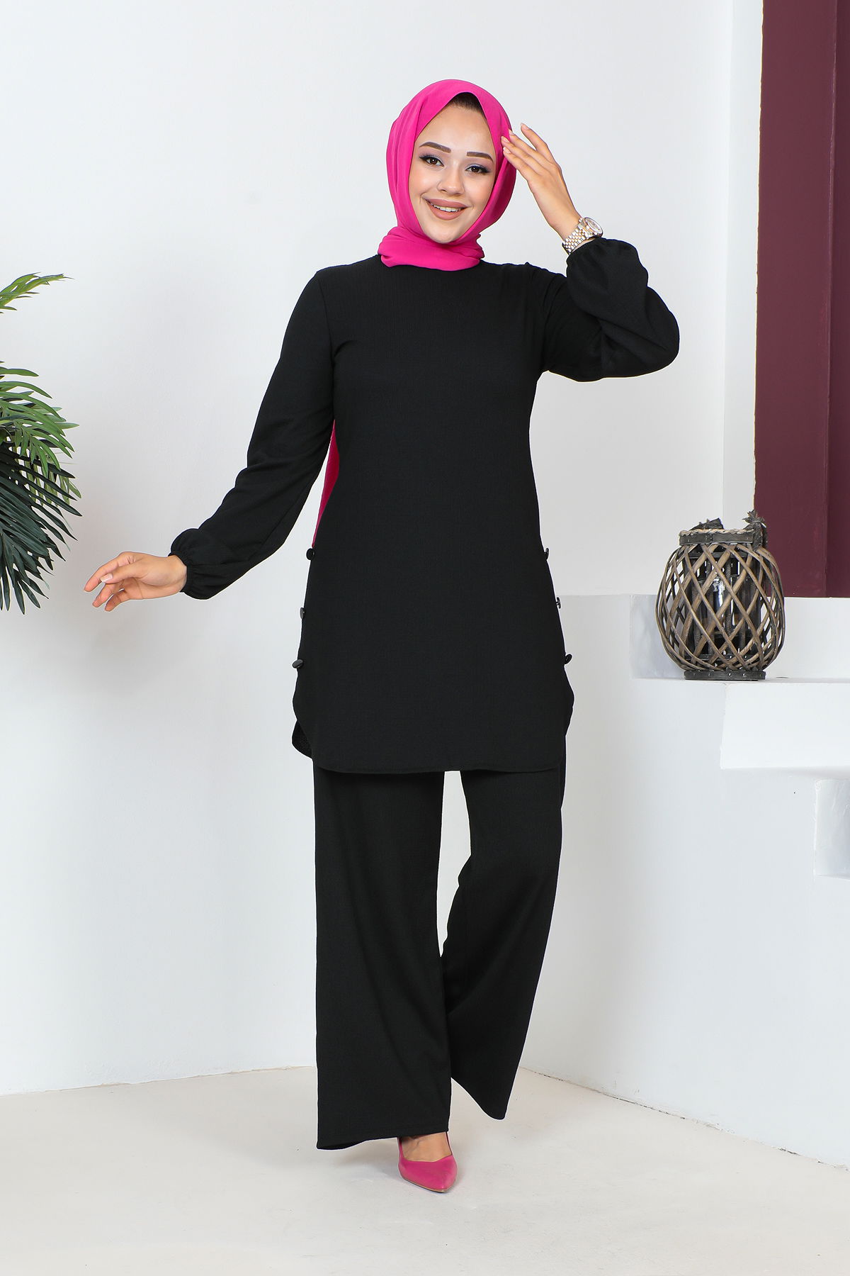 Düğme Detaylı Bürümcük Kumaş Tesettür Takım-3153 Siyah