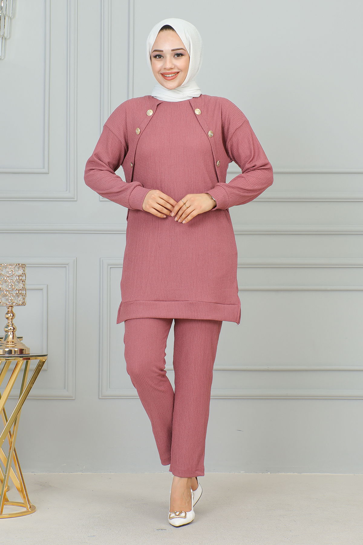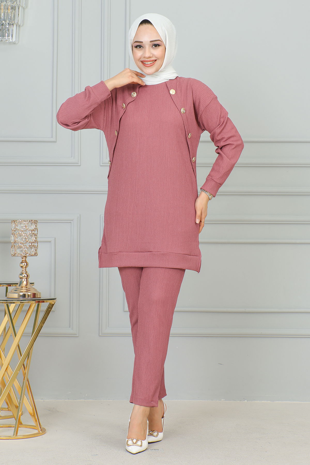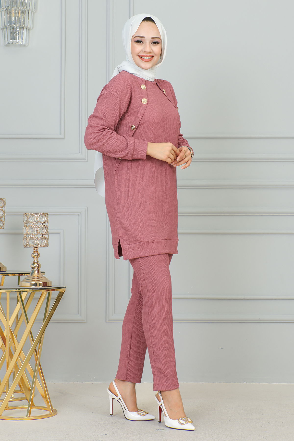 Düğme Detaylı İkili Bürümcük Takım-4008 Gülkurusu
