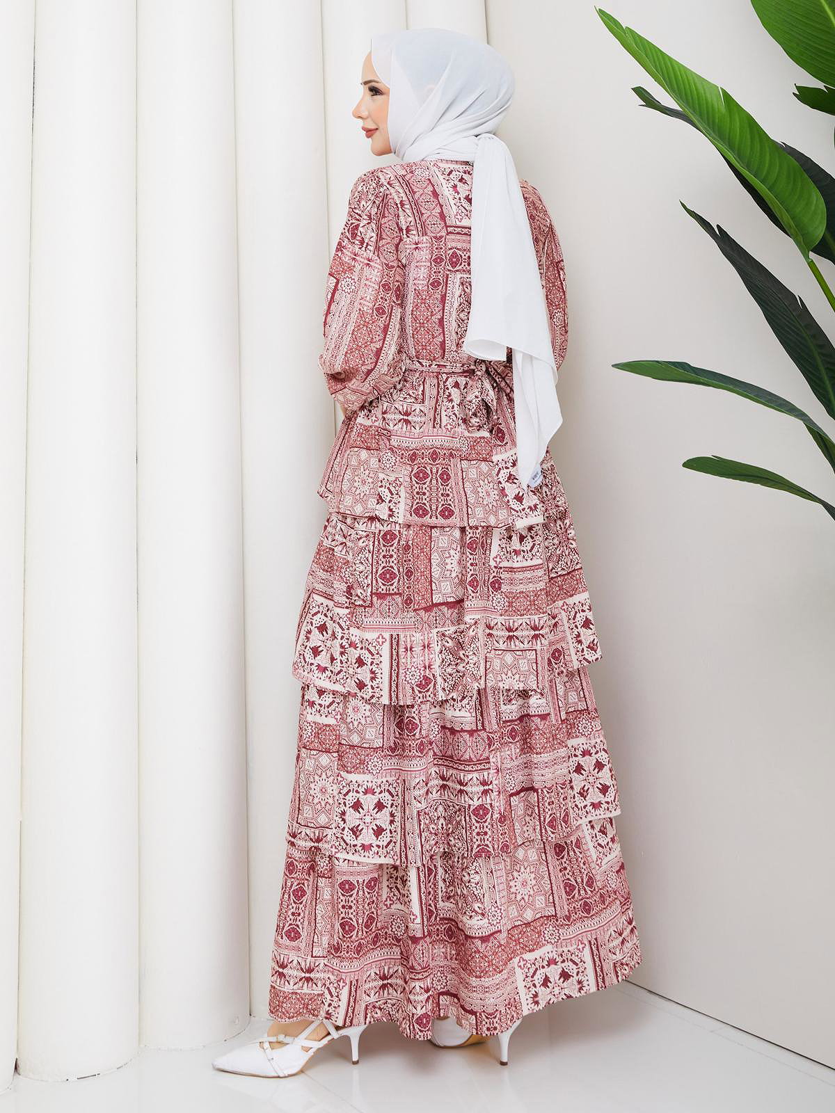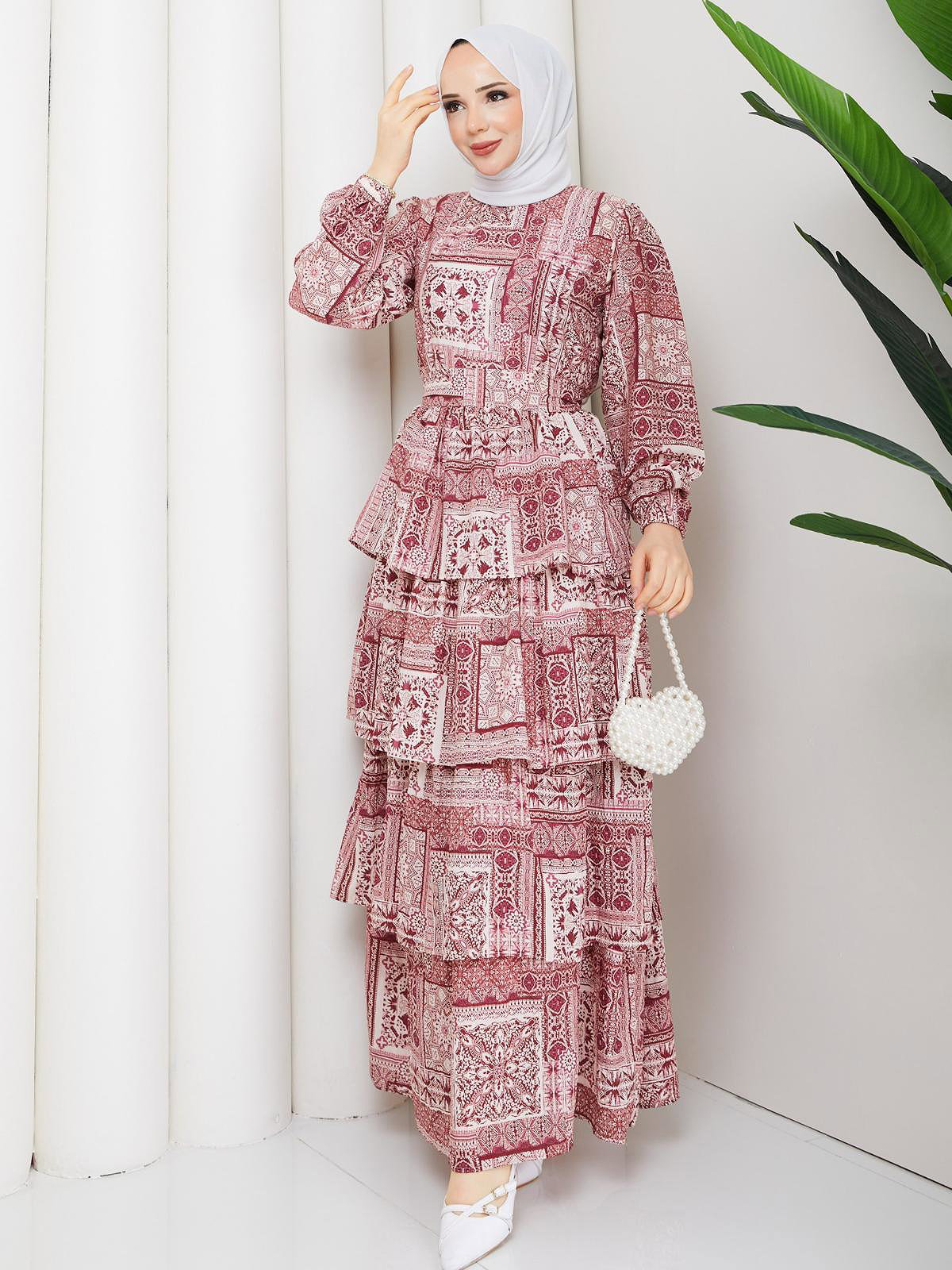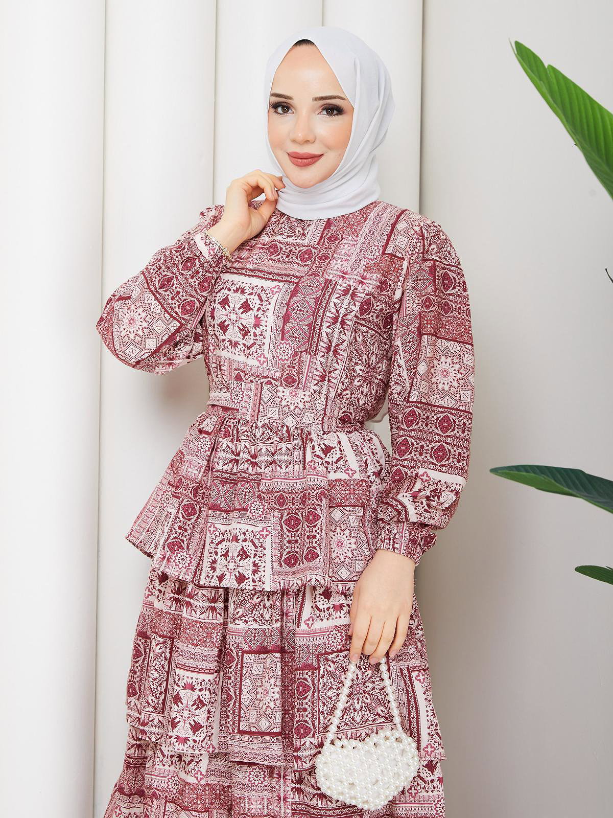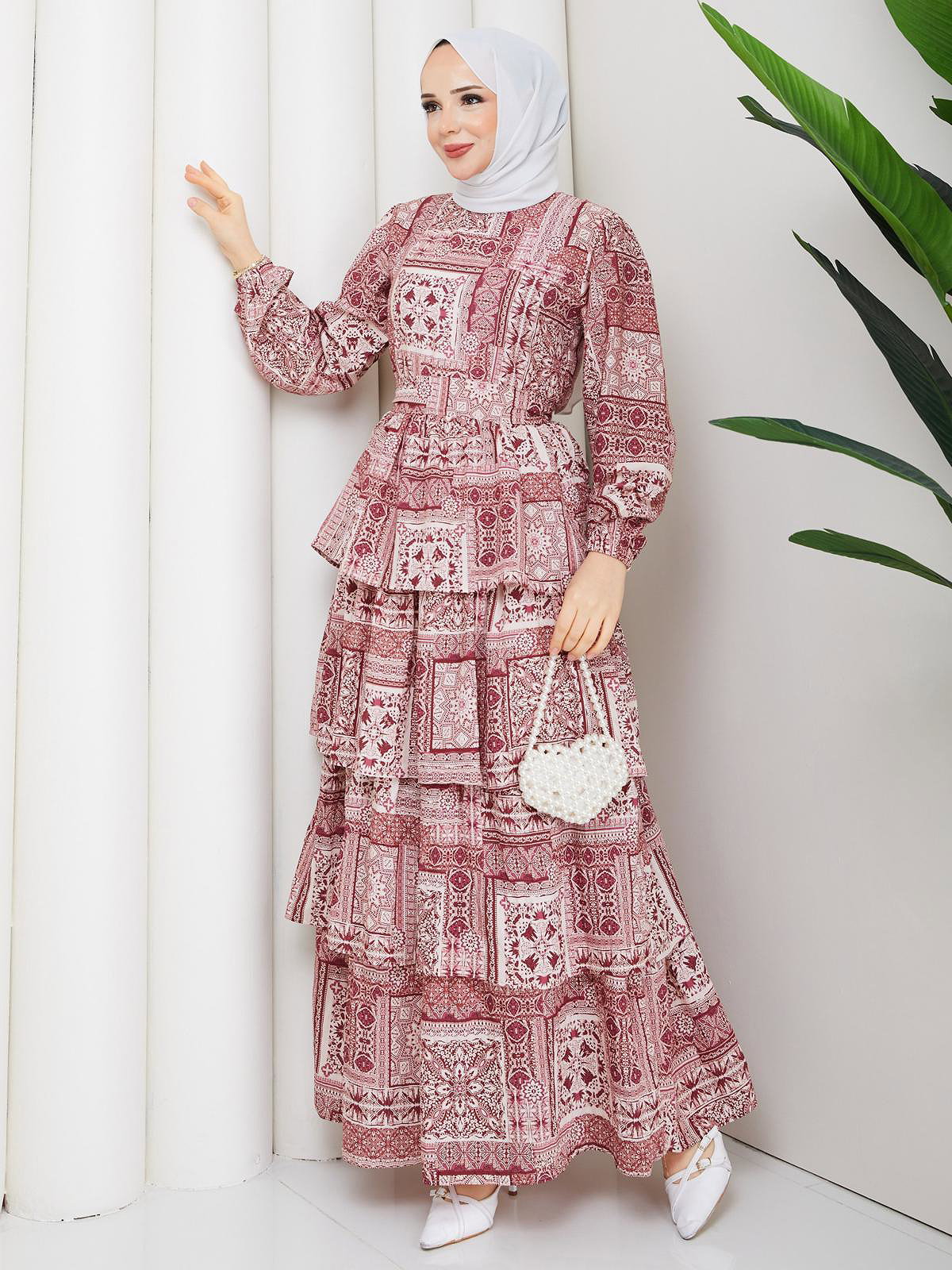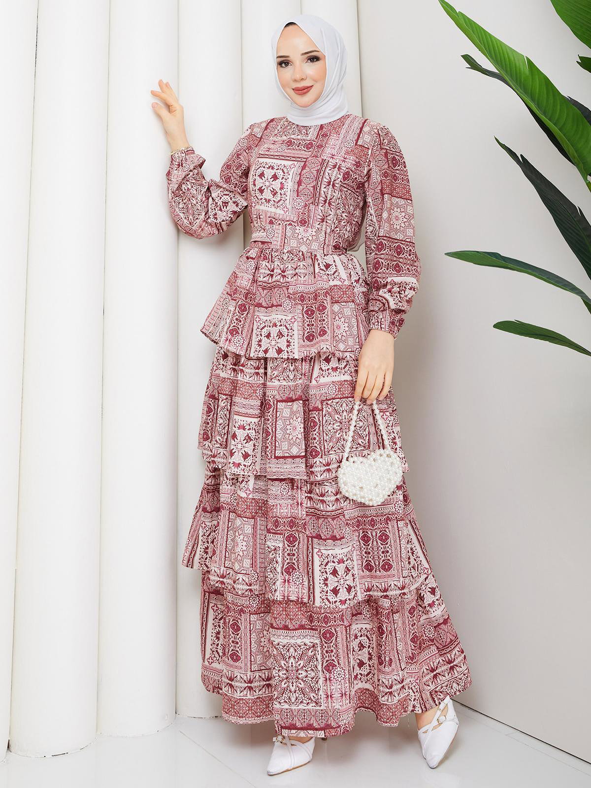 Eteği Katlı Desenli Elbise-5165 Bordo