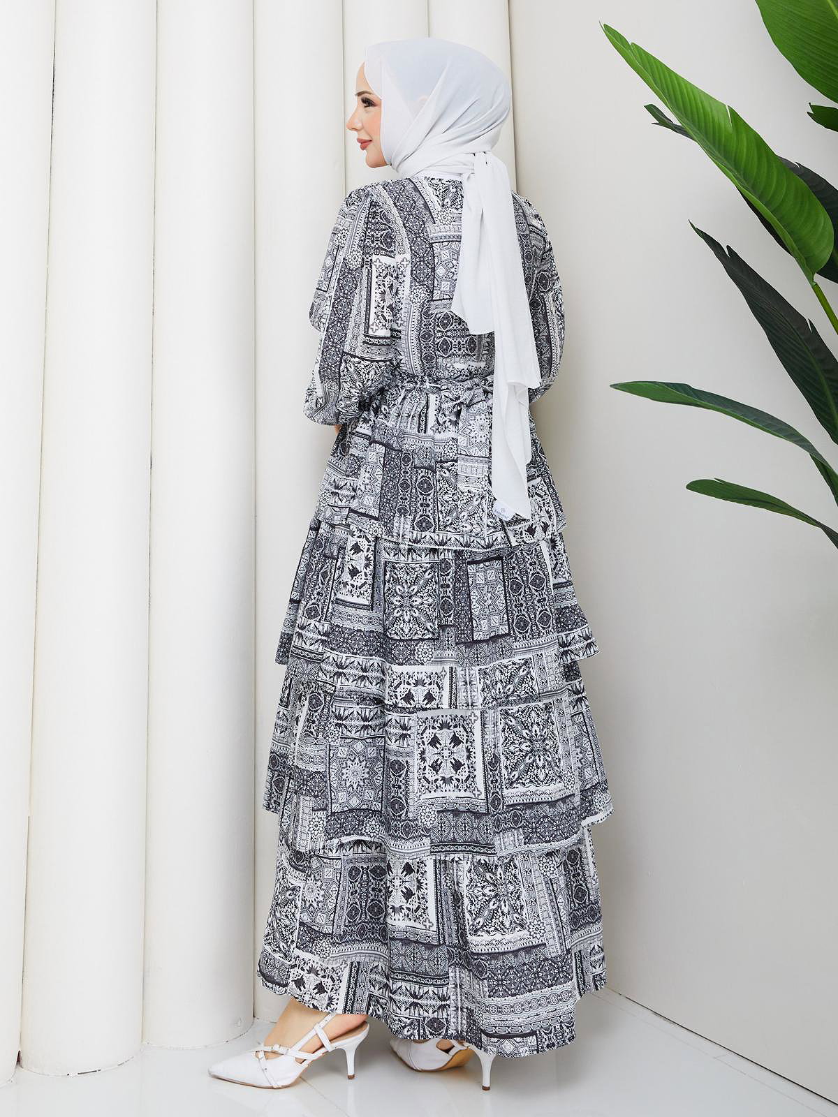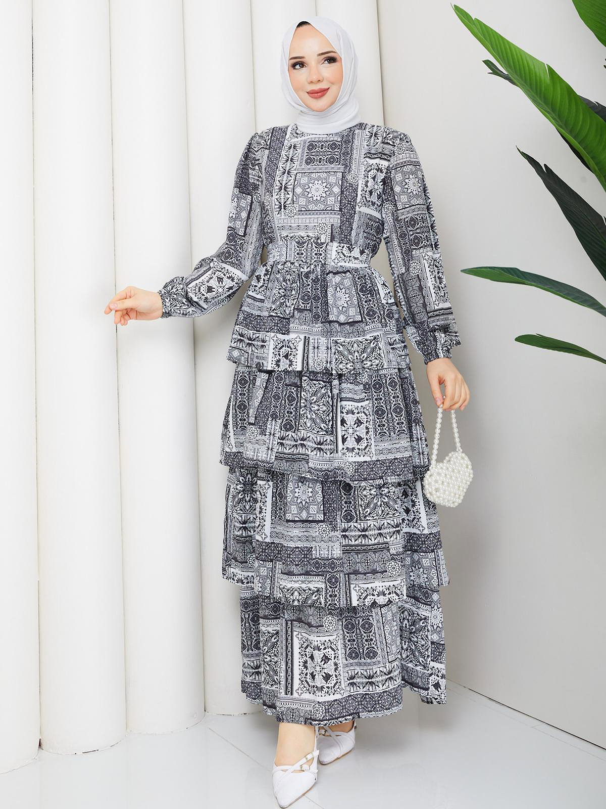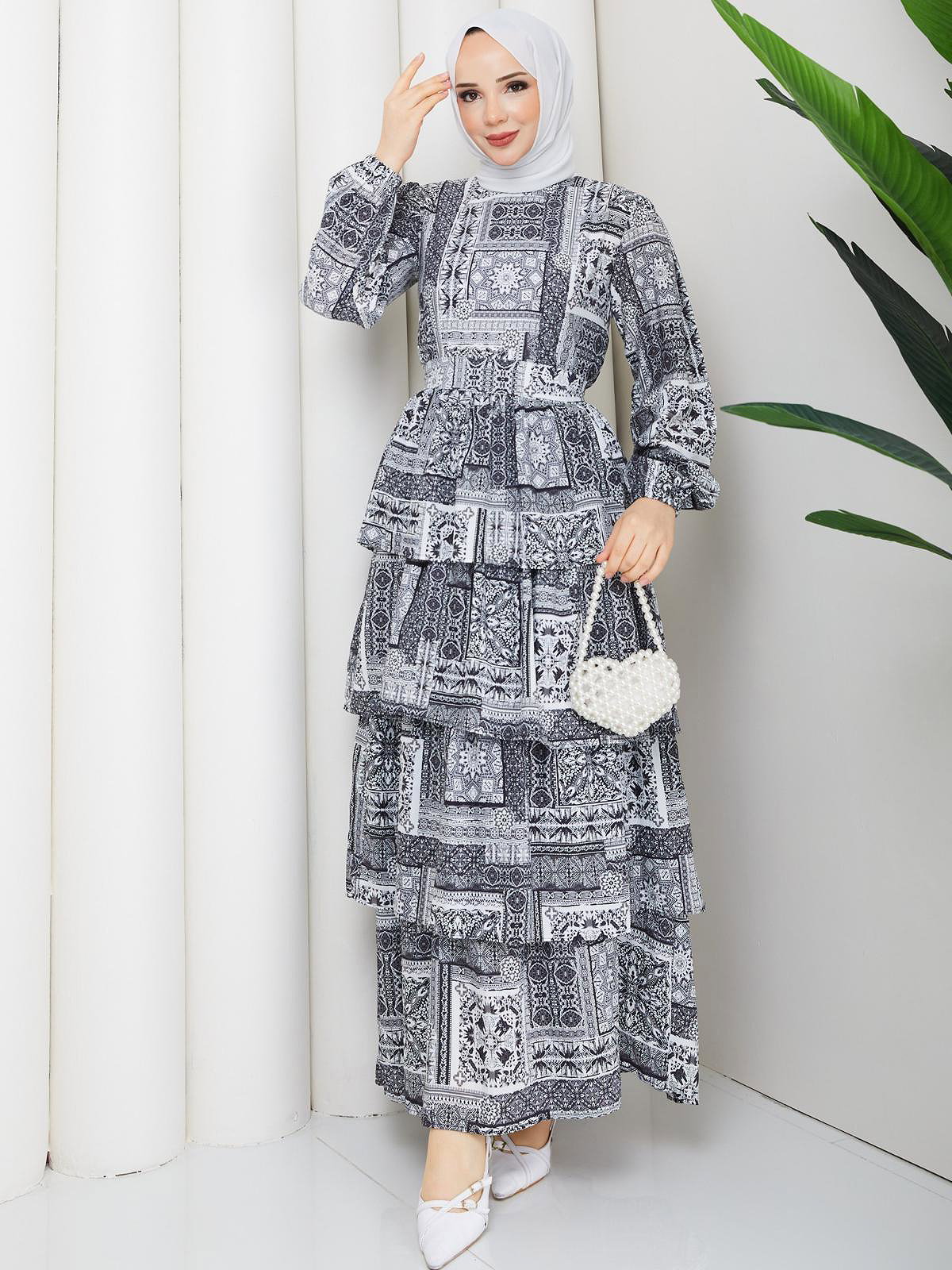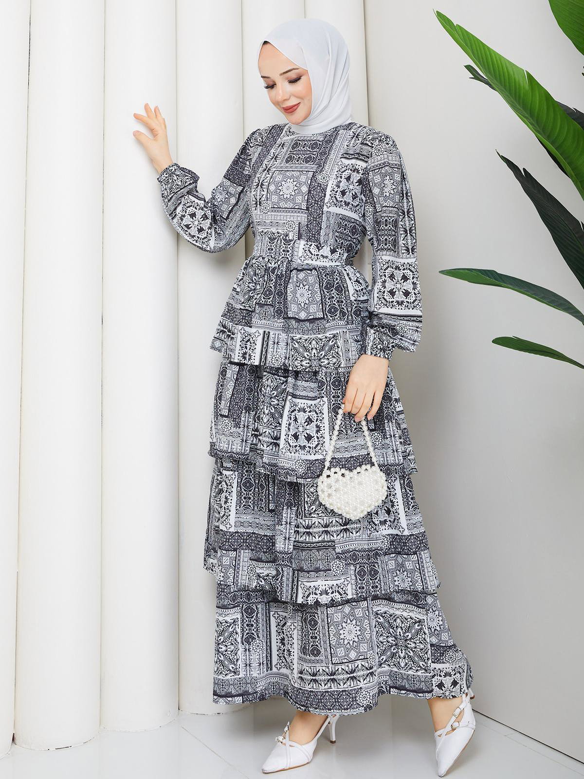 Eteği Katlı Desenli Elbise-5165 Siyah