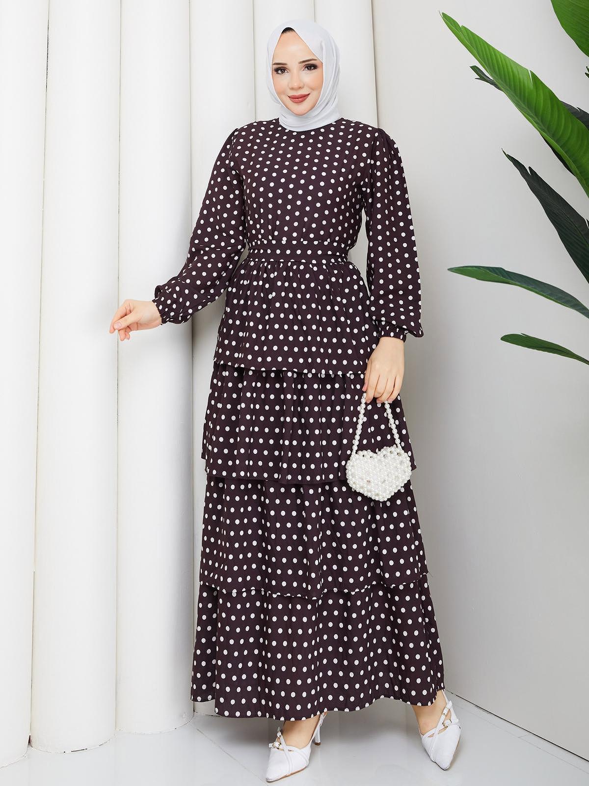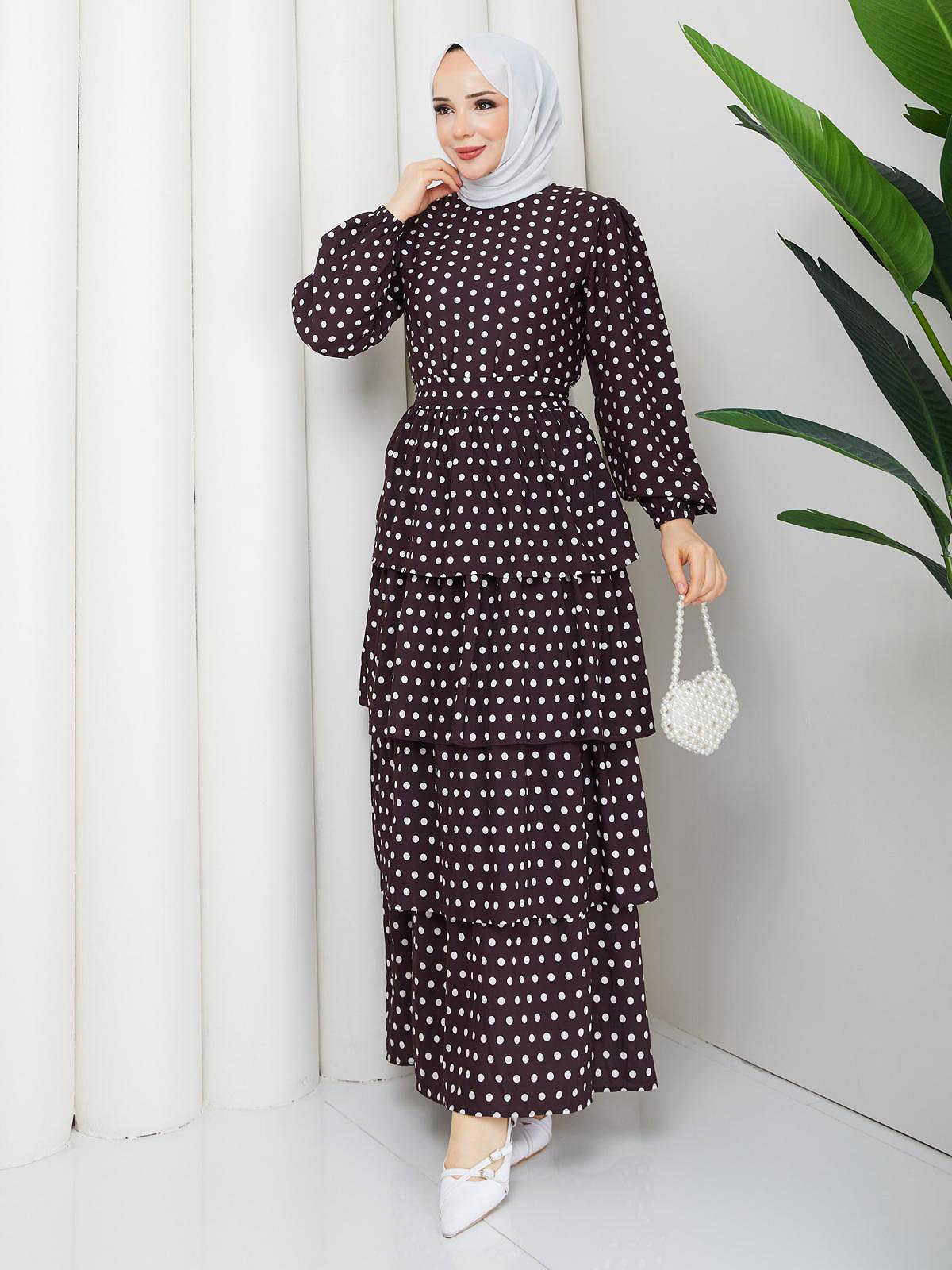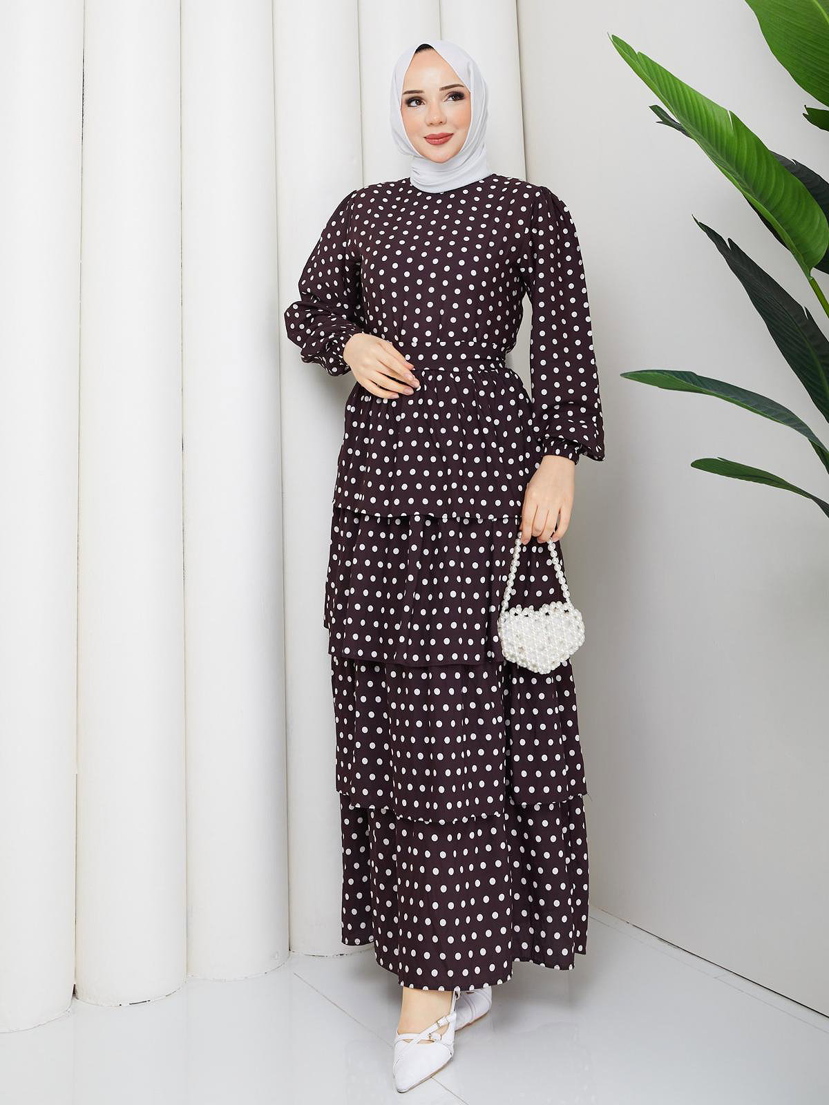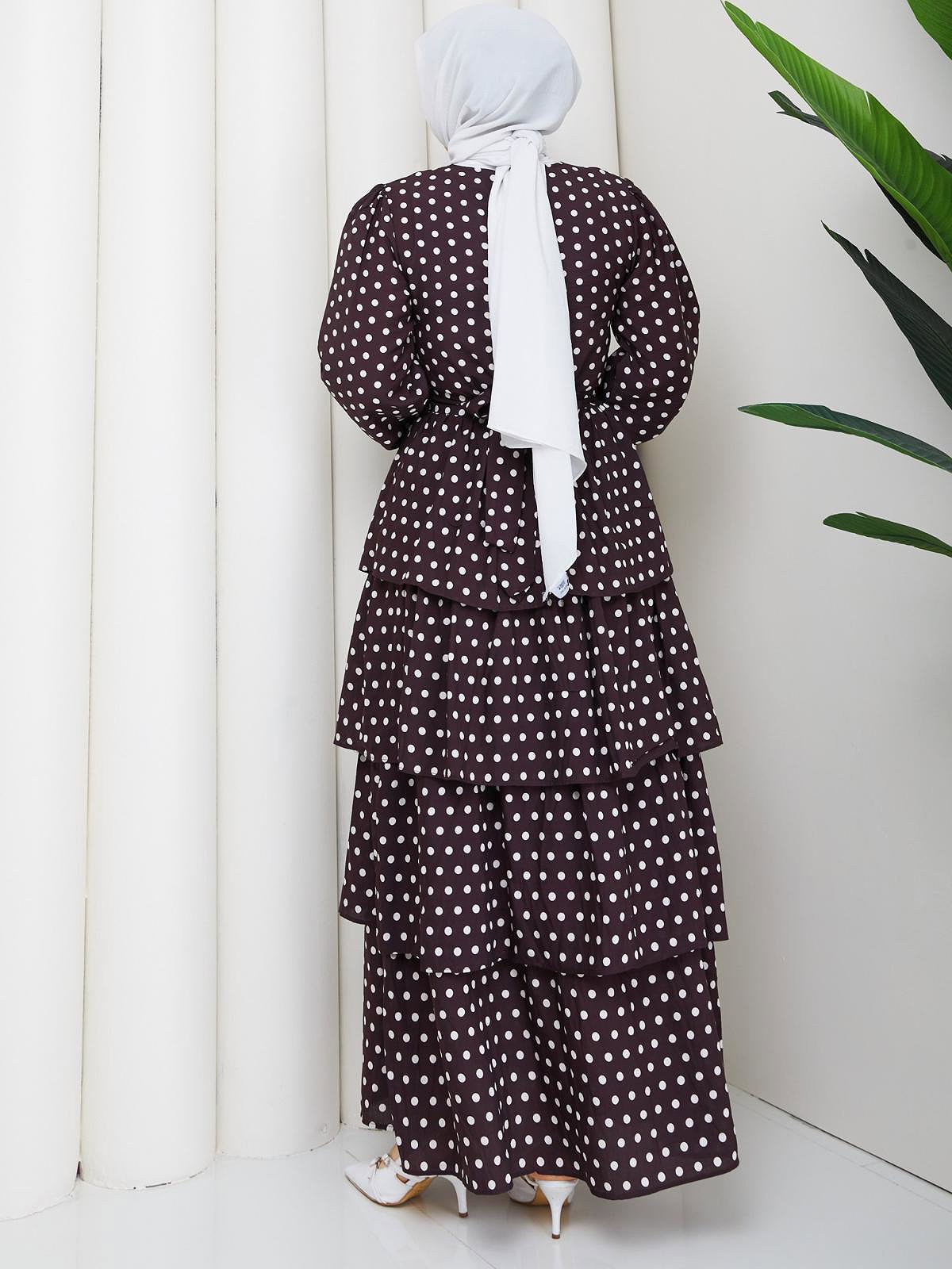 Eteği Katlı Puantiyeli Elbise-5162 Kahverengi