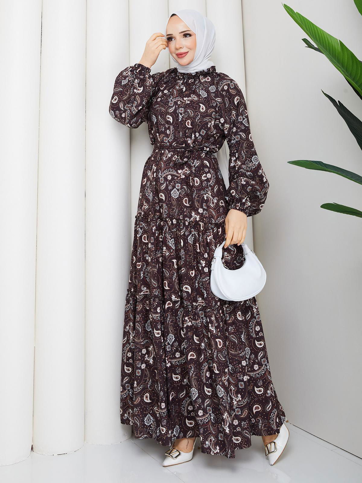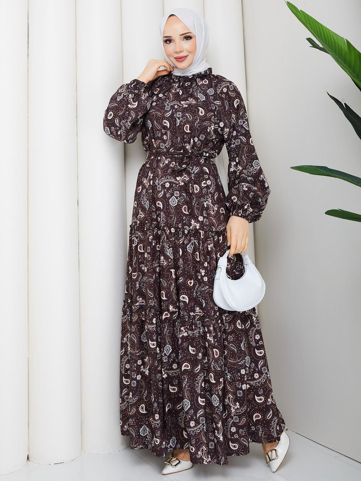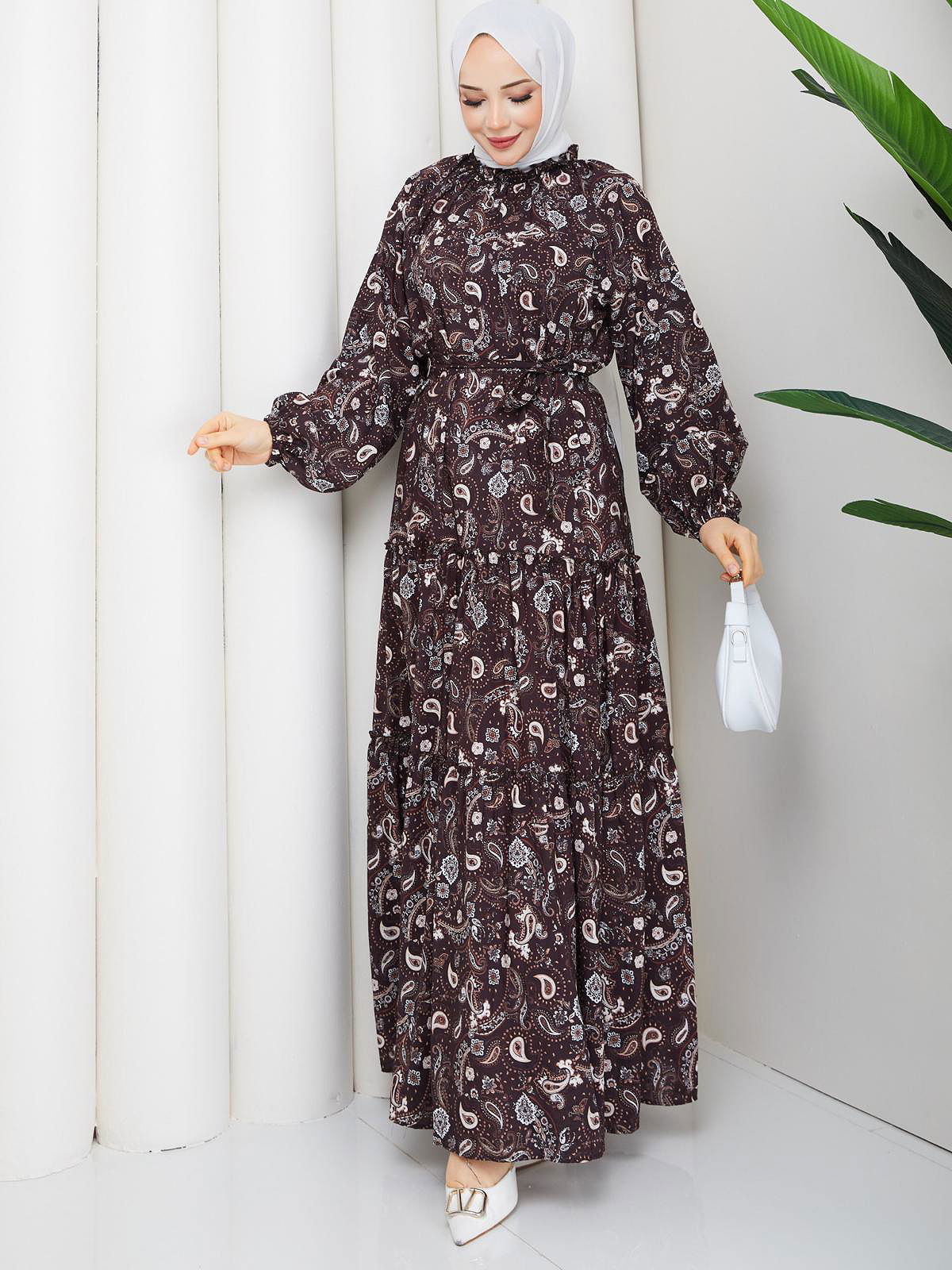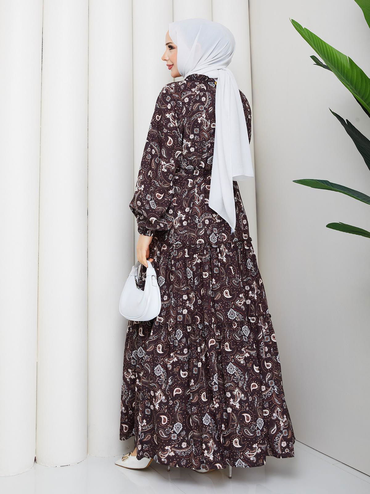Etnik Desen Kloş Kat Kat Elbise-5155 Kahverengi