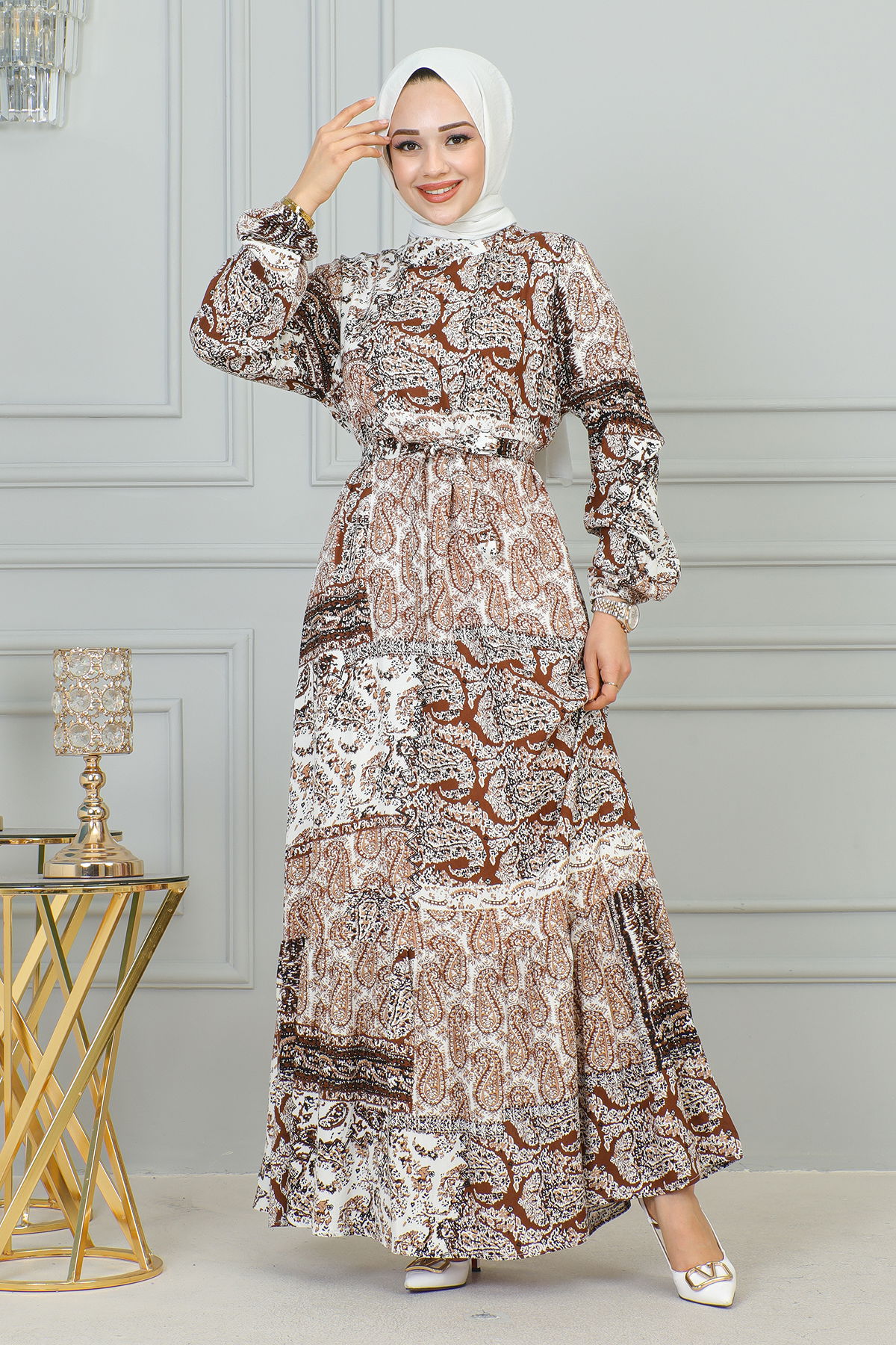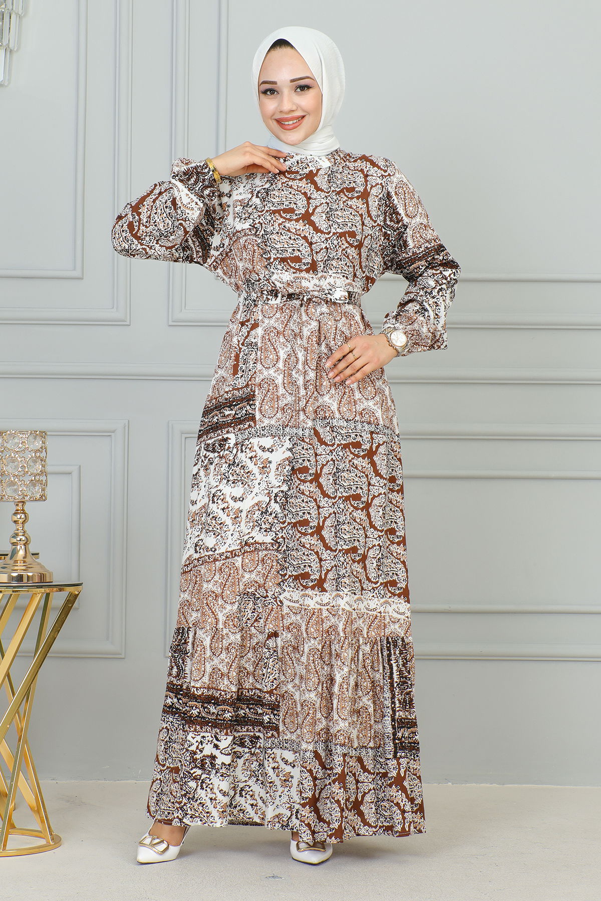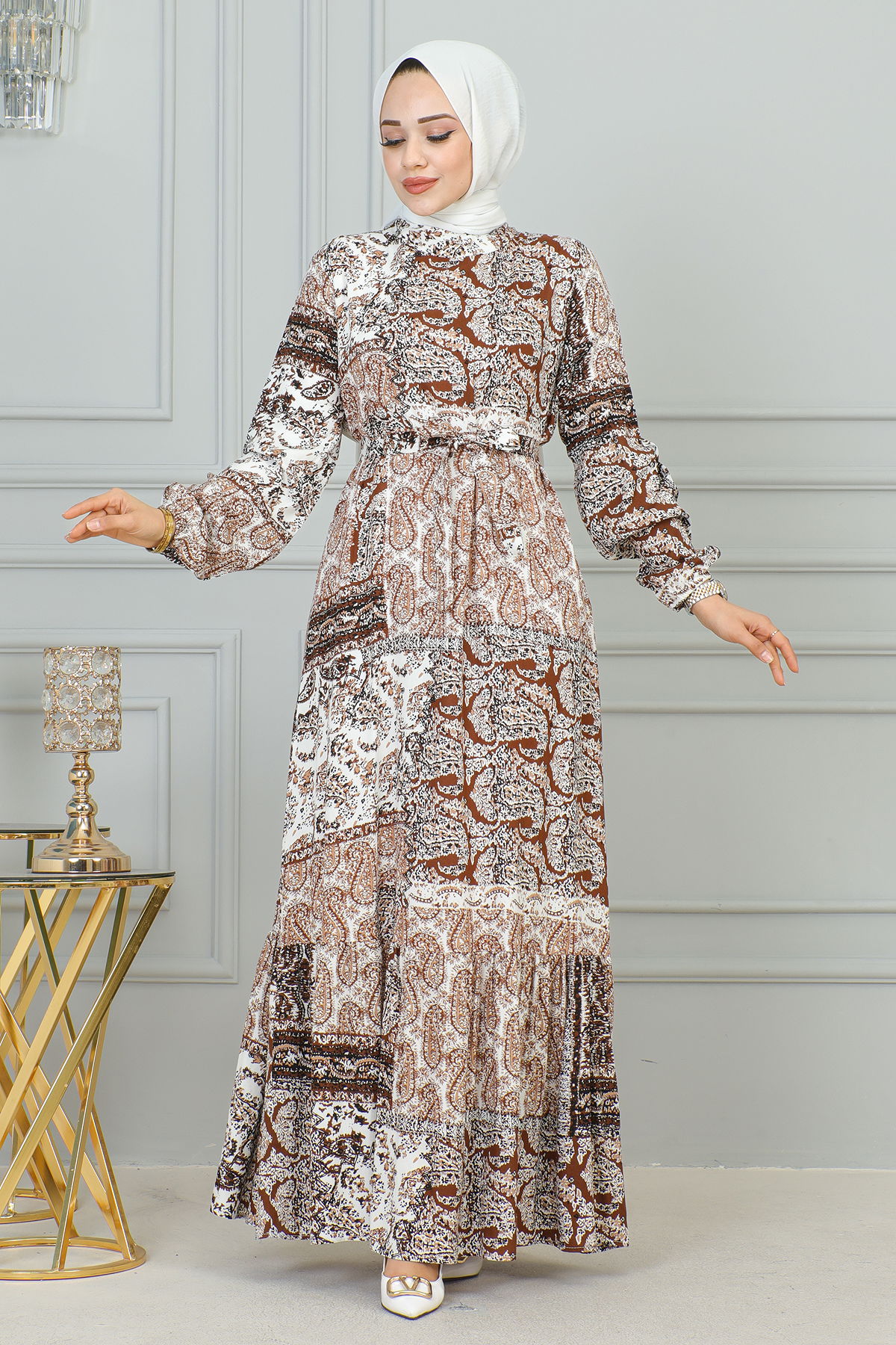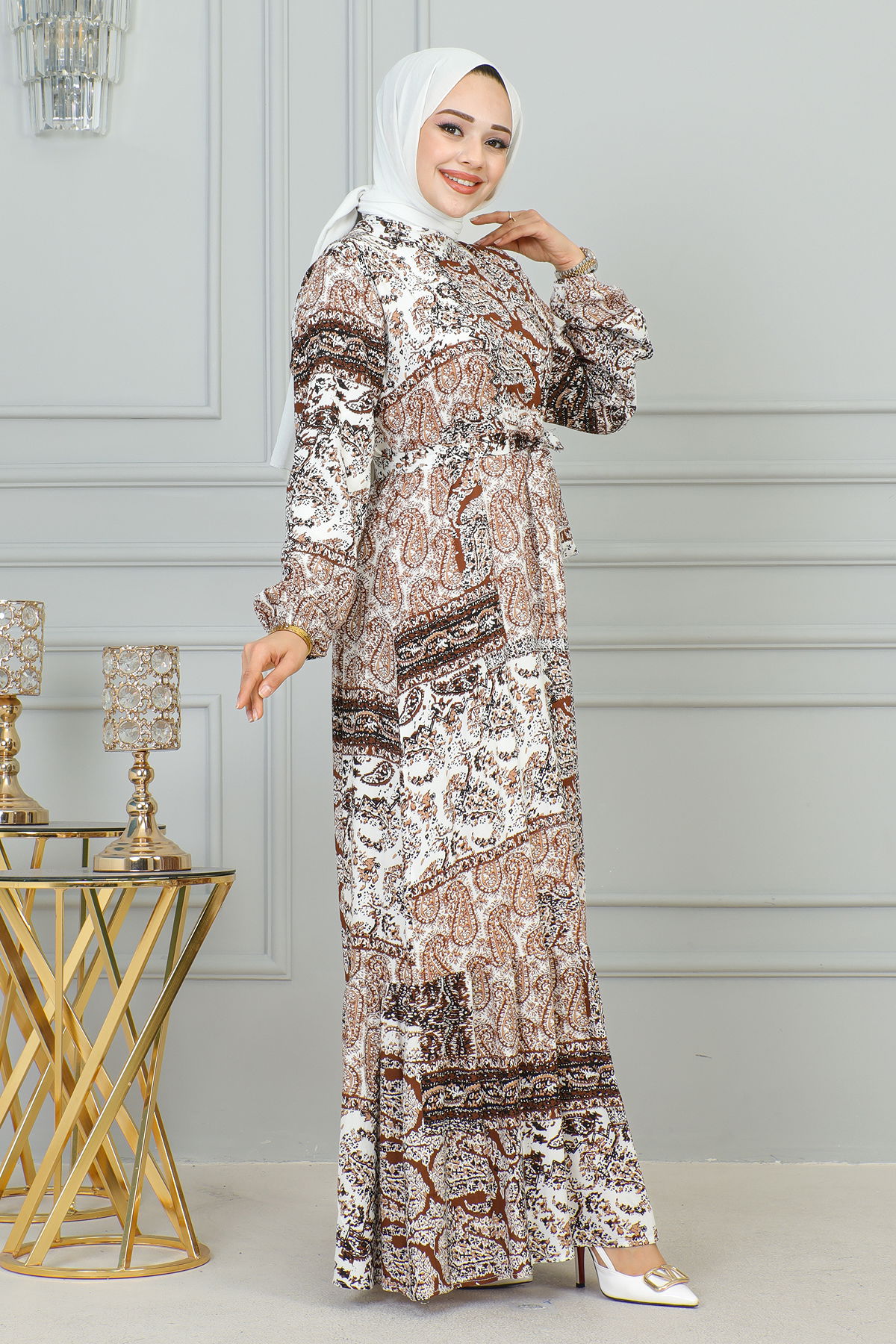 Etnik Desenli Eteği Fırfırlı Elbise-3164 Kahve