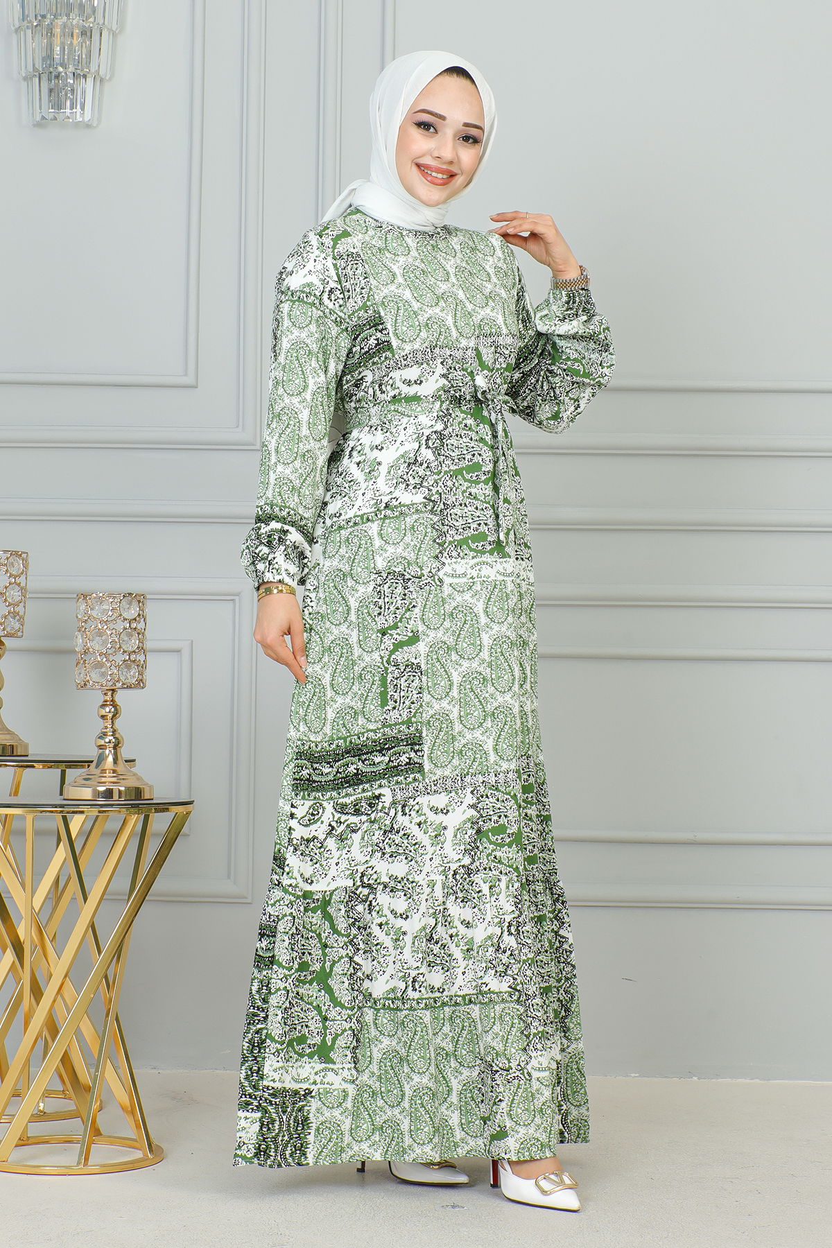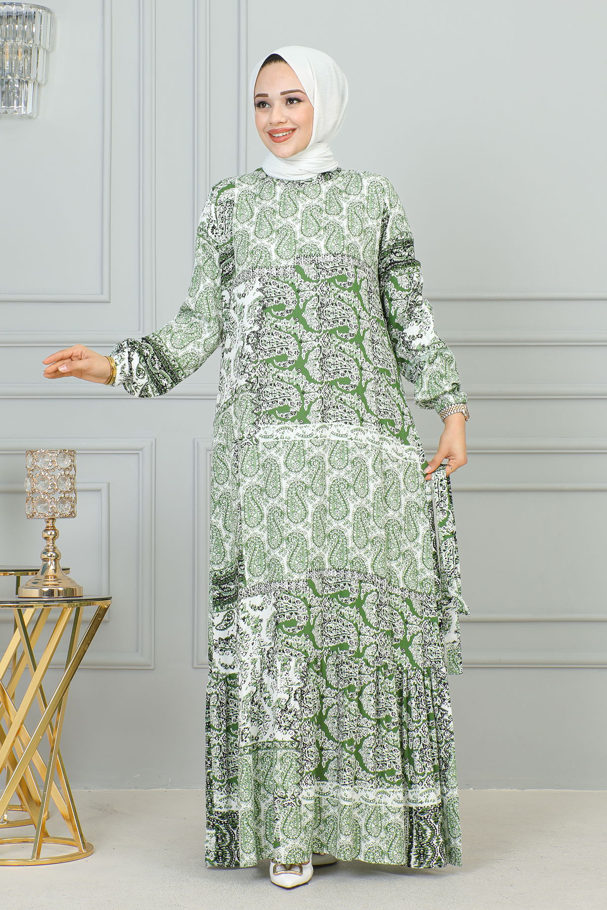 Etnik Desenli Eteği Fırfırlı Elbise-3164 Yeşil
