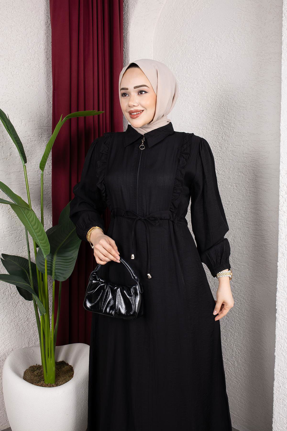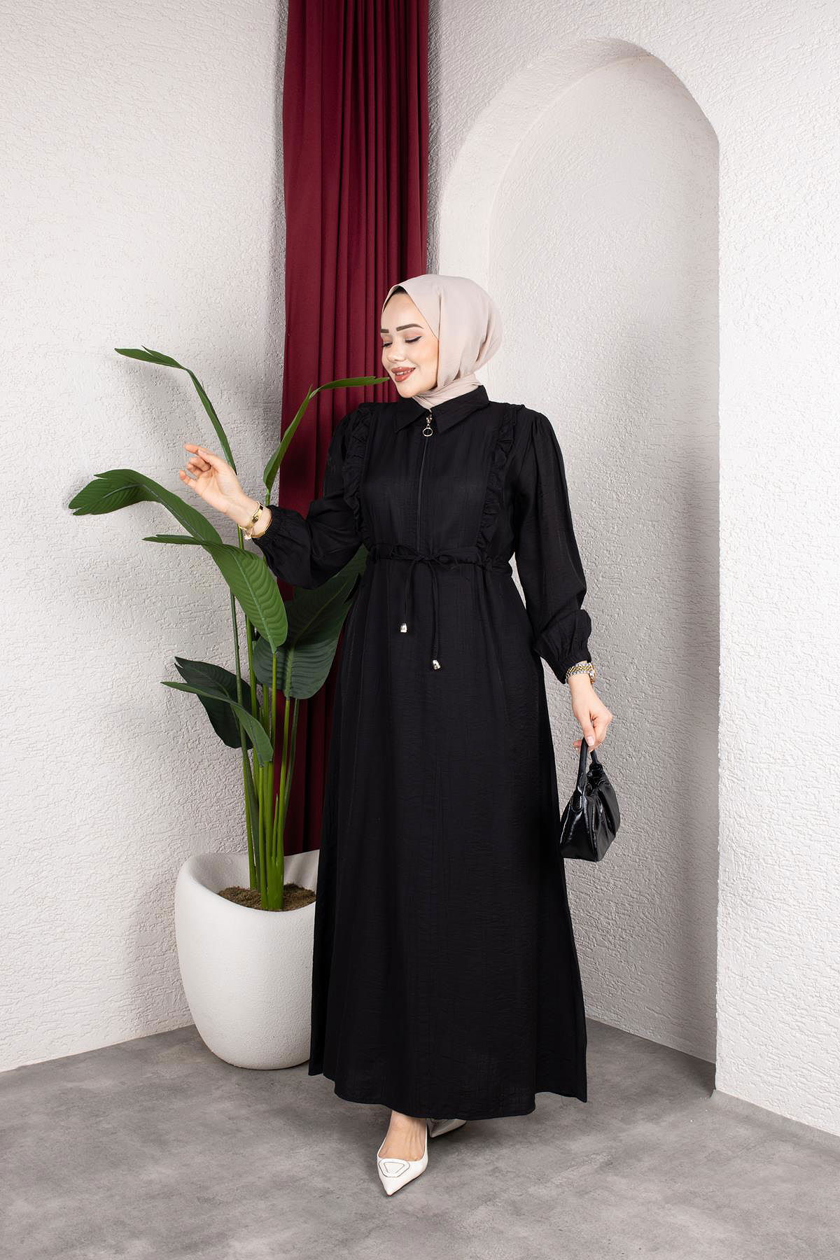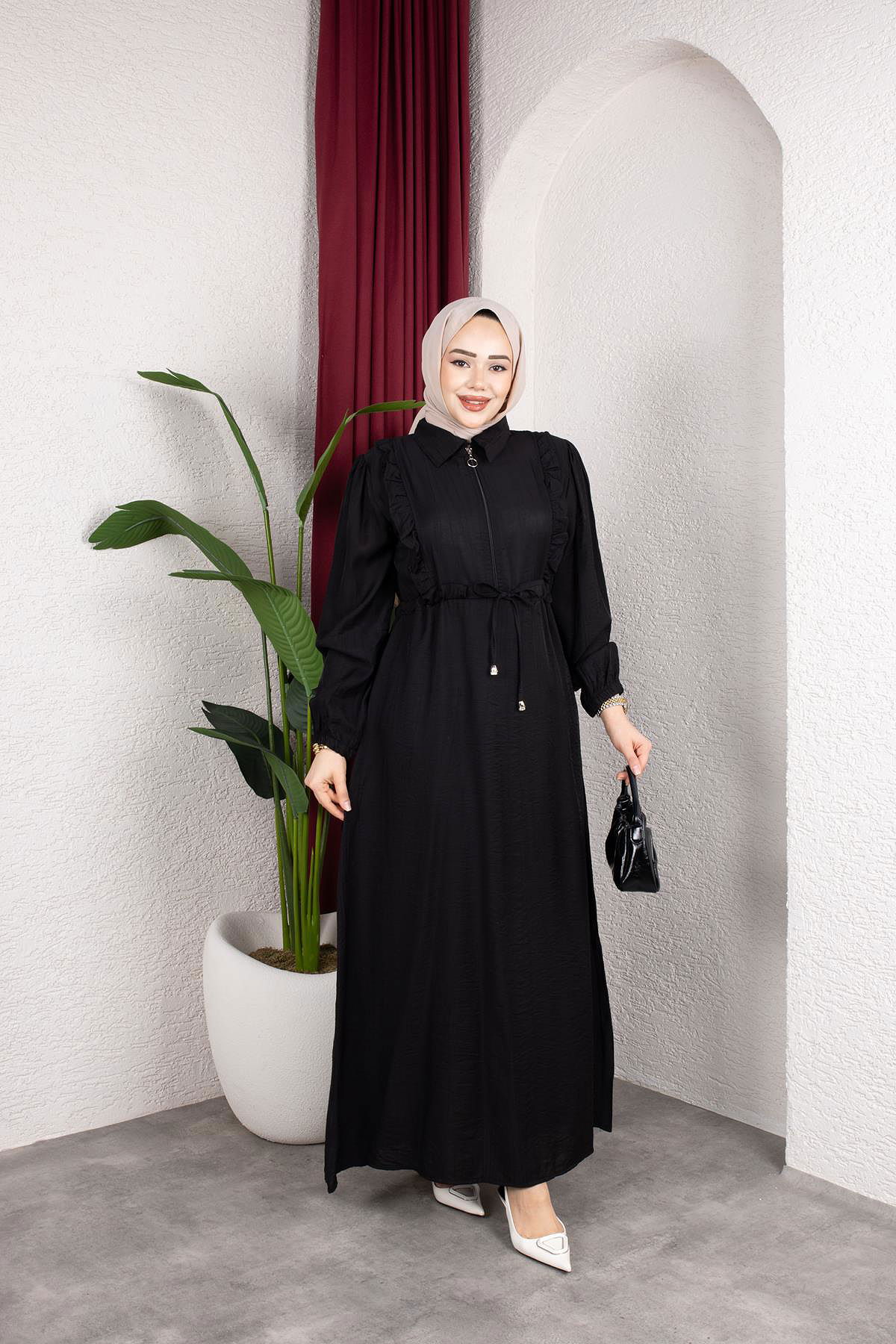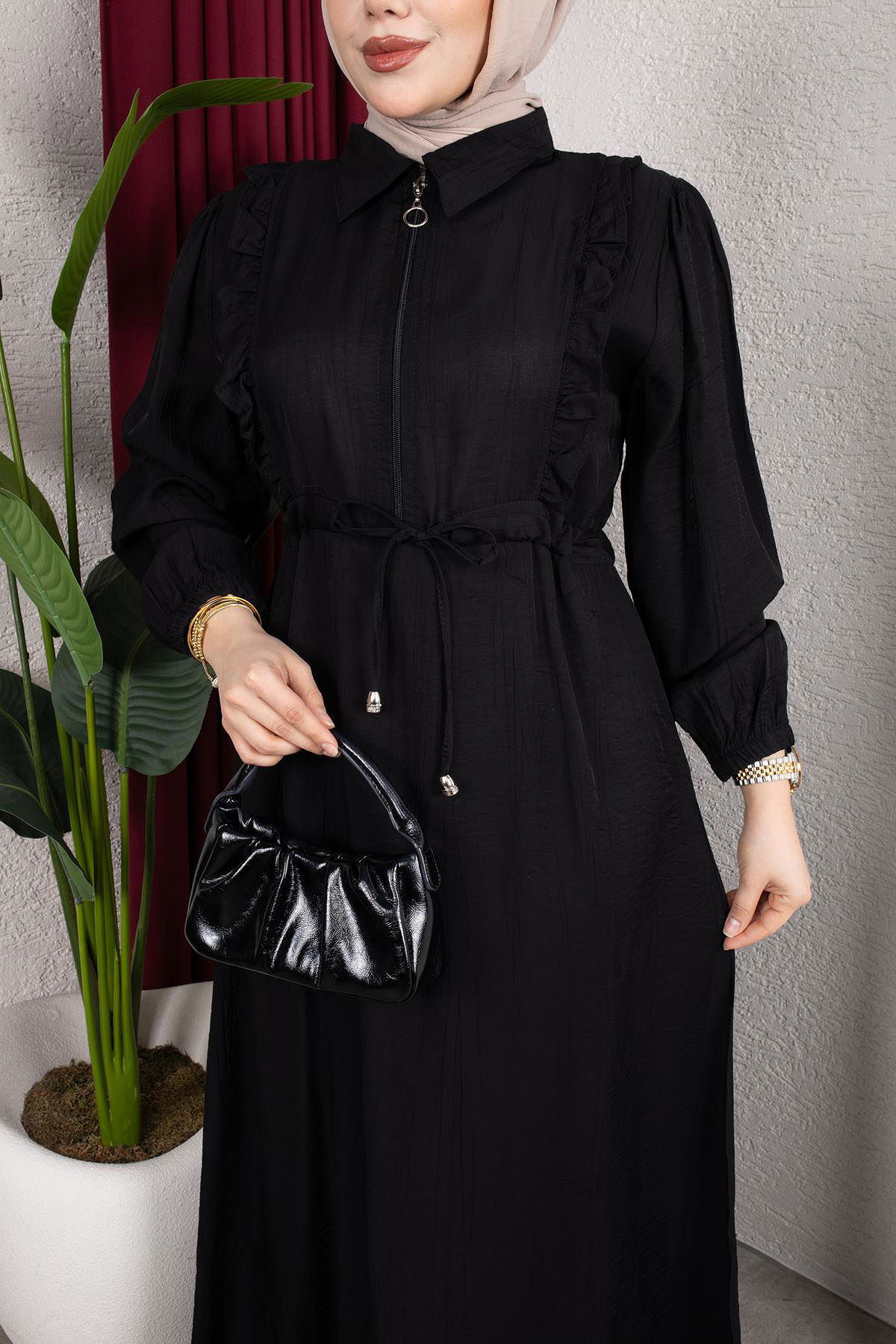 Fırfır Detay Fermuarlı Tesettür Elbise-7882 Siyah