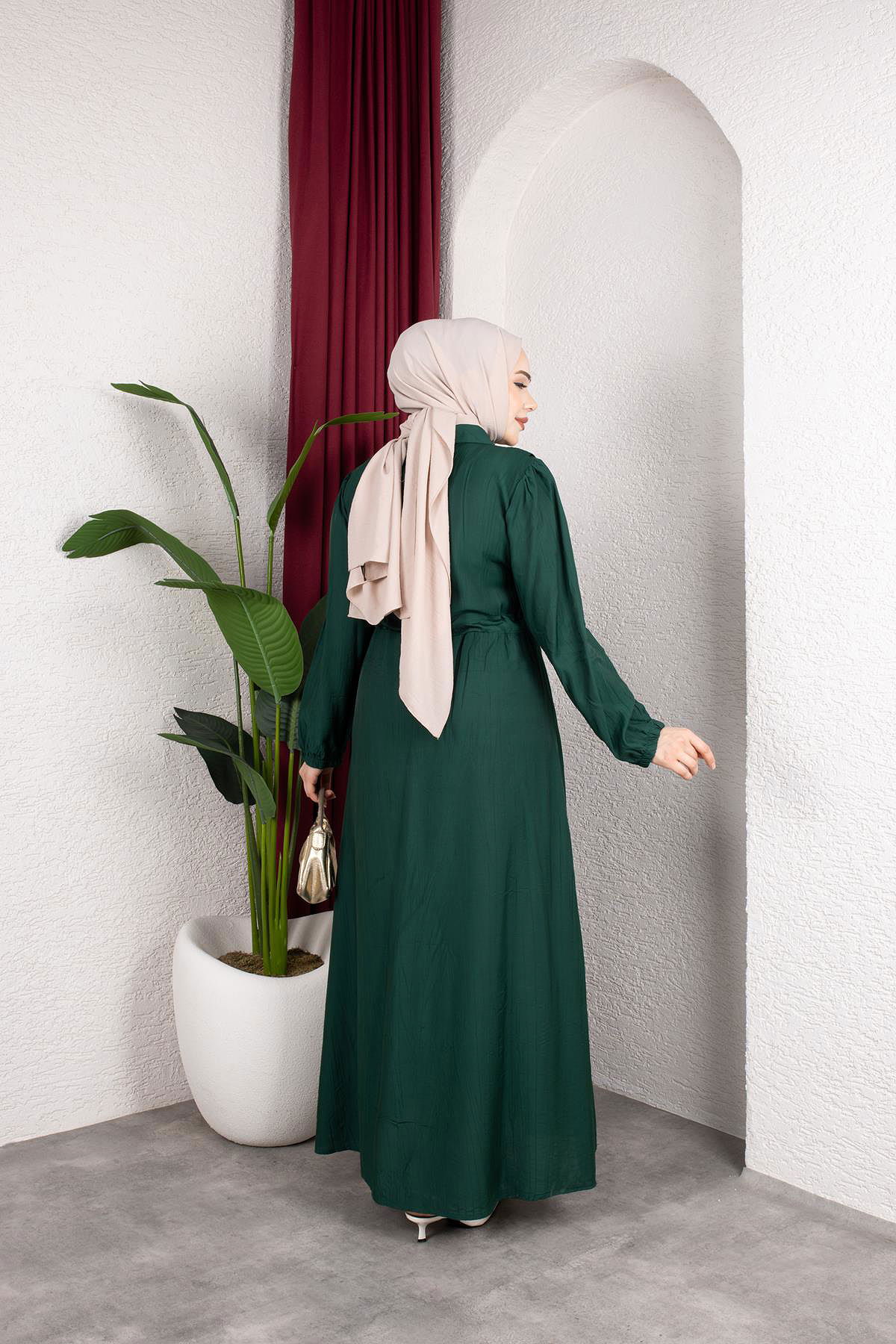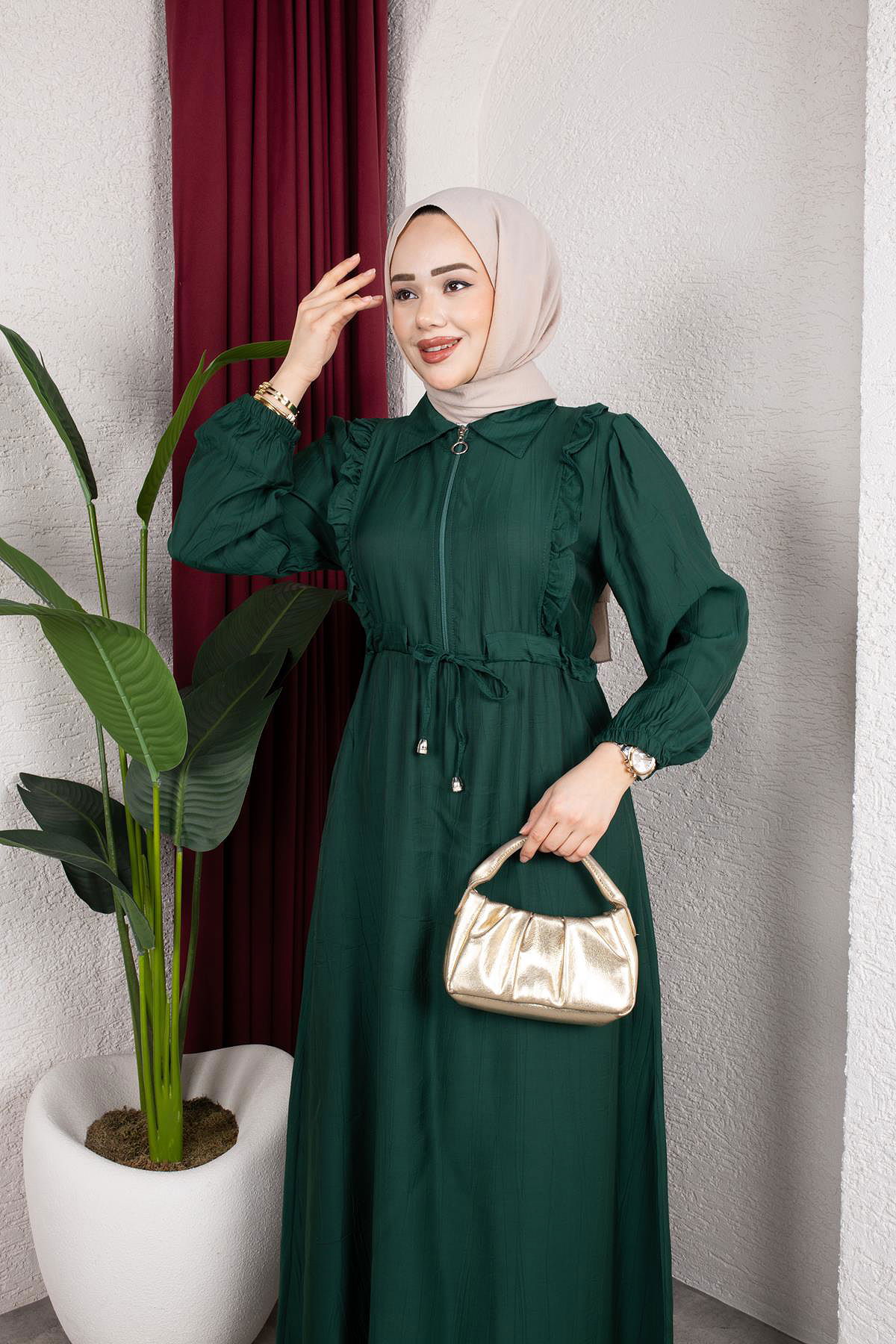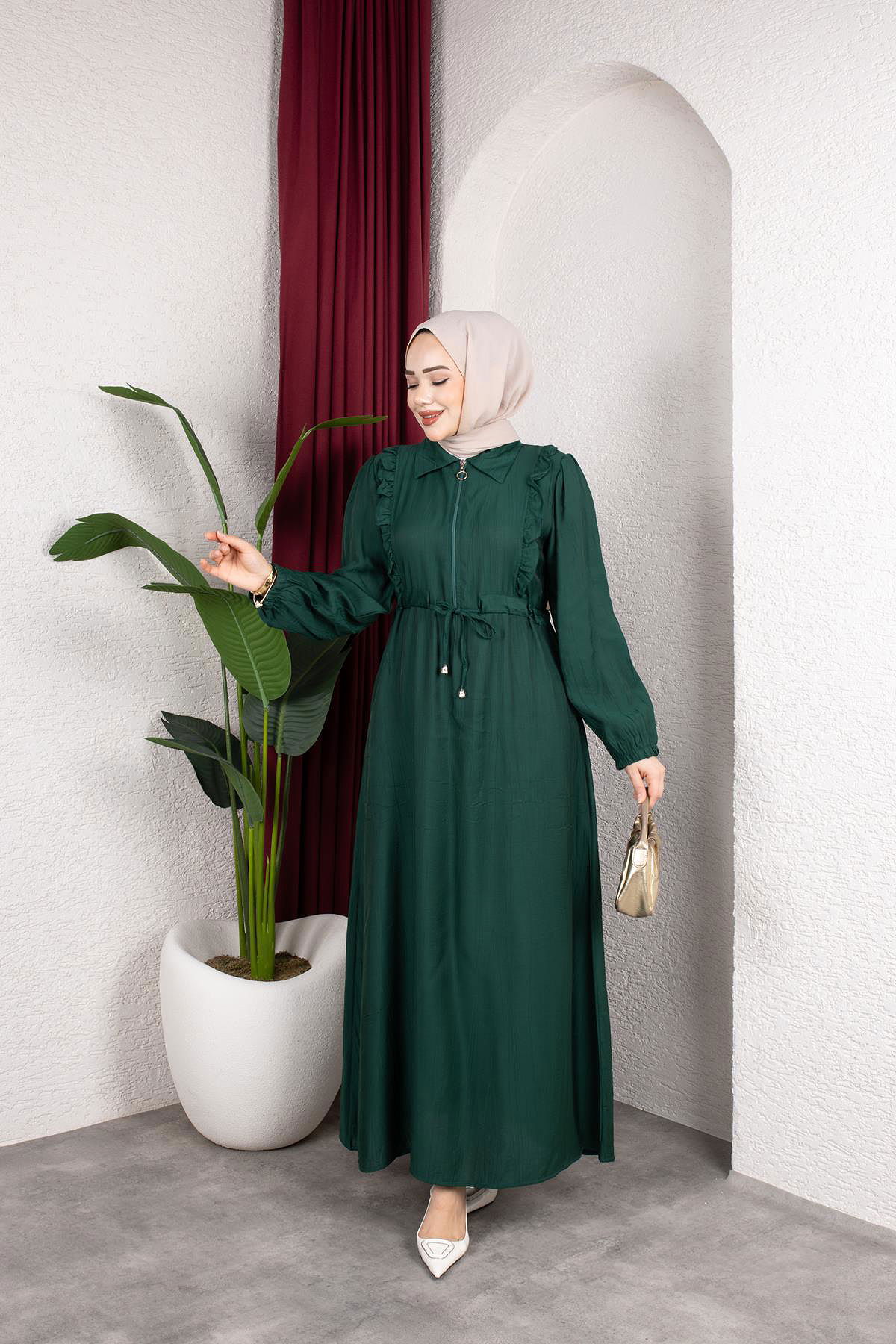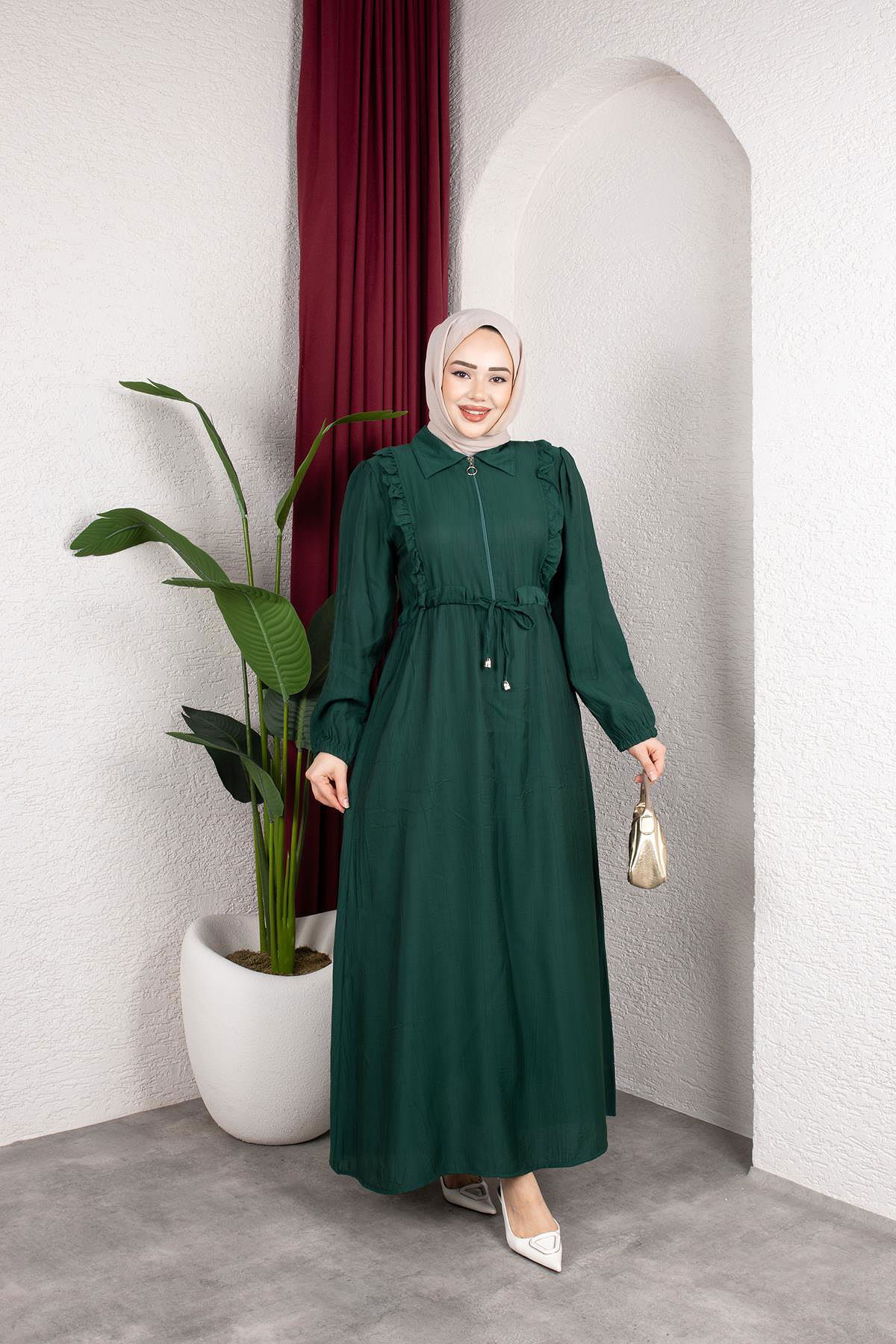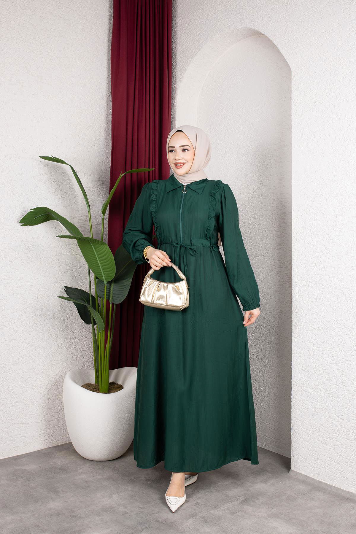 Fırfır Detay Fermuarlı Tesettür Elbise-7882 Yeşil