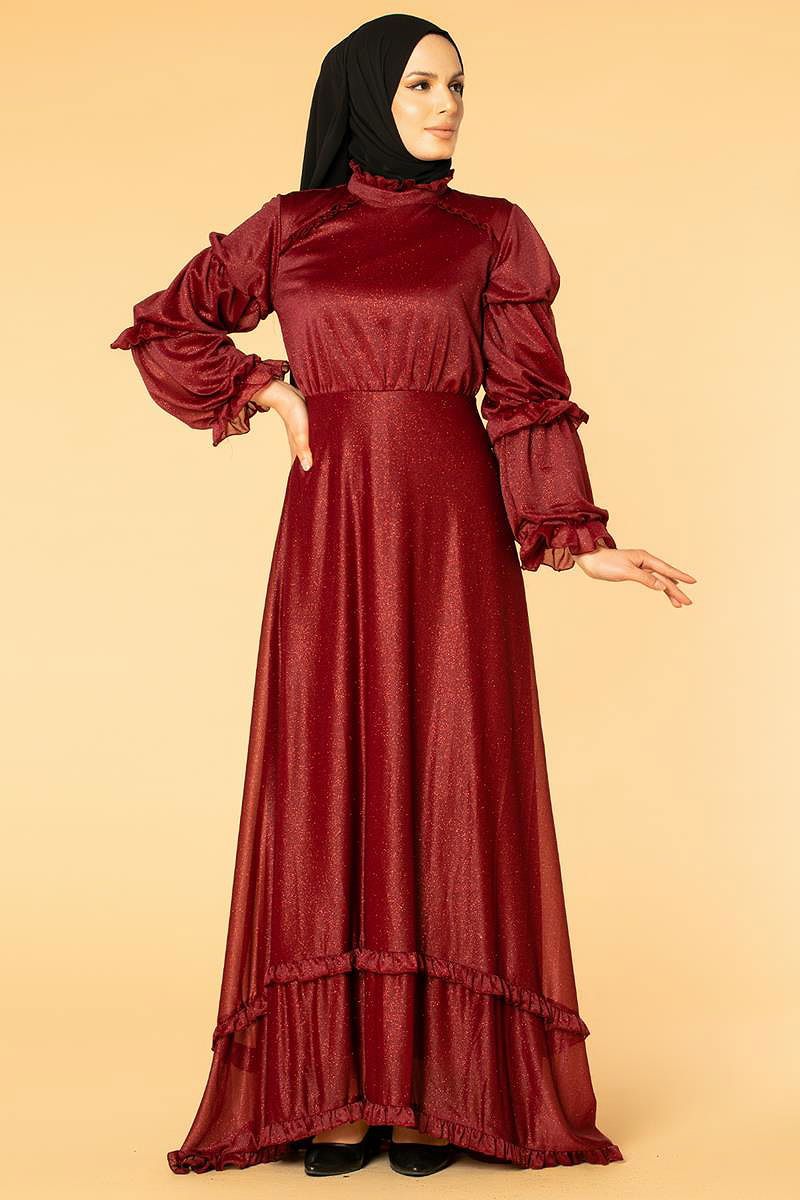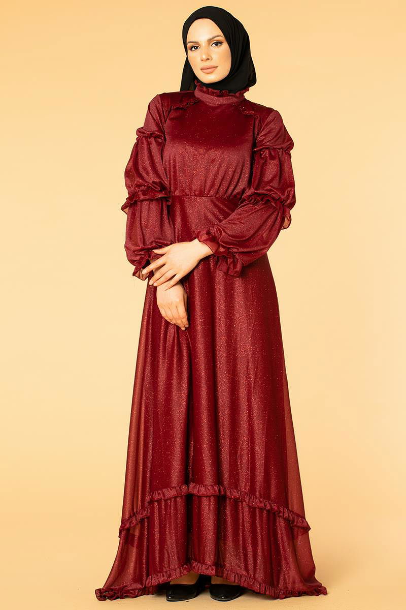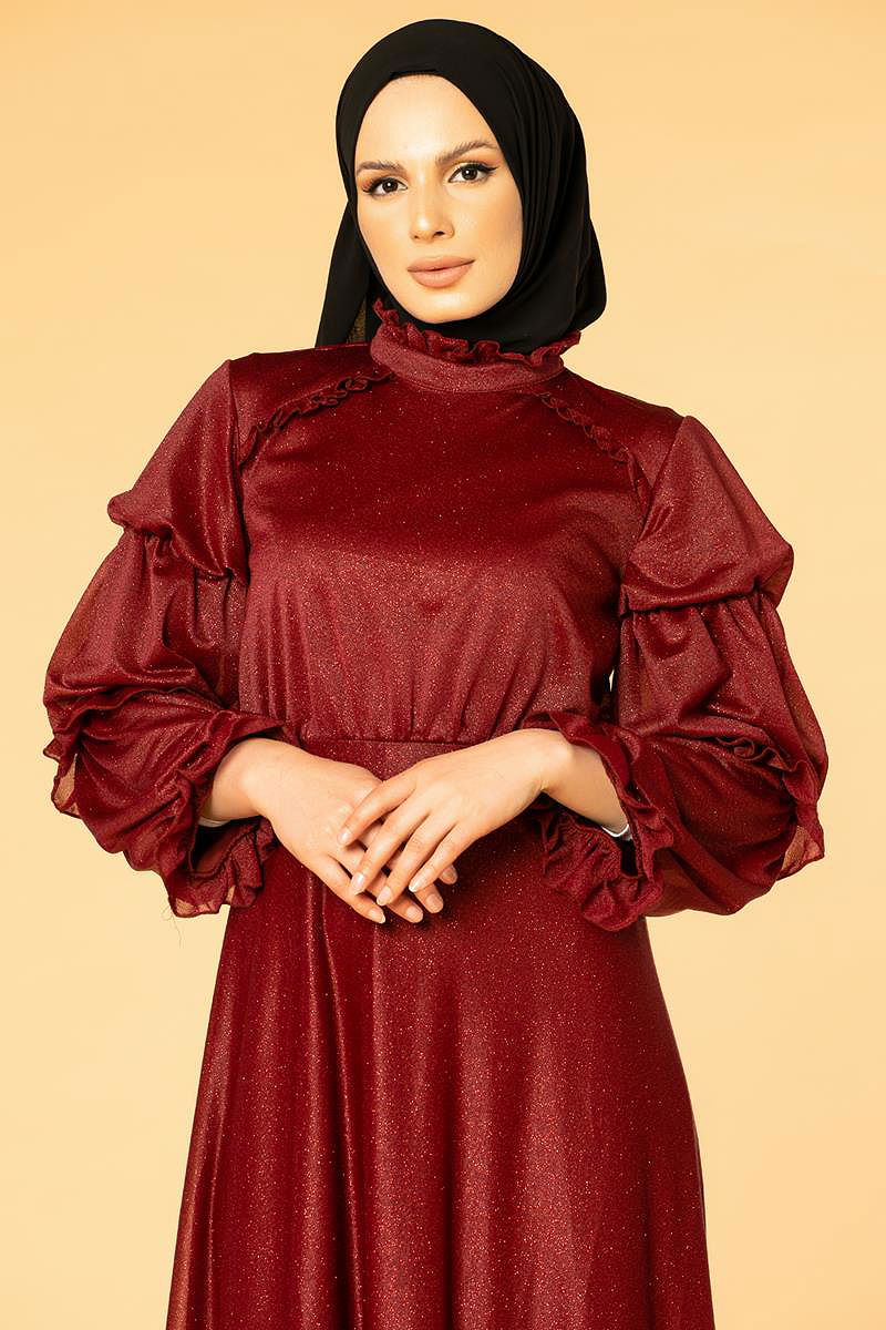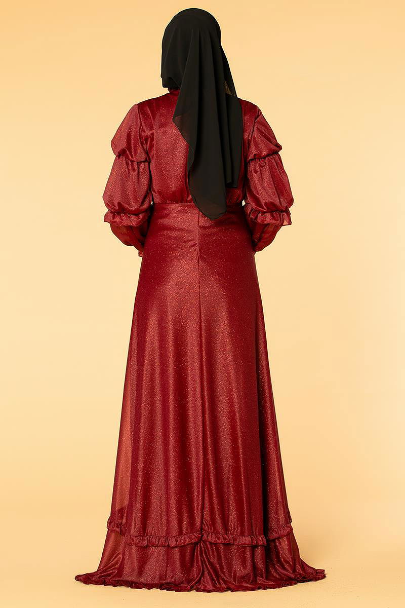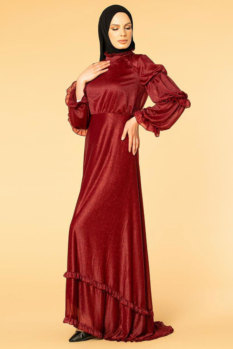 Fırfır Detay Kuyruklu Tesettür Abiye-0620 Bordo