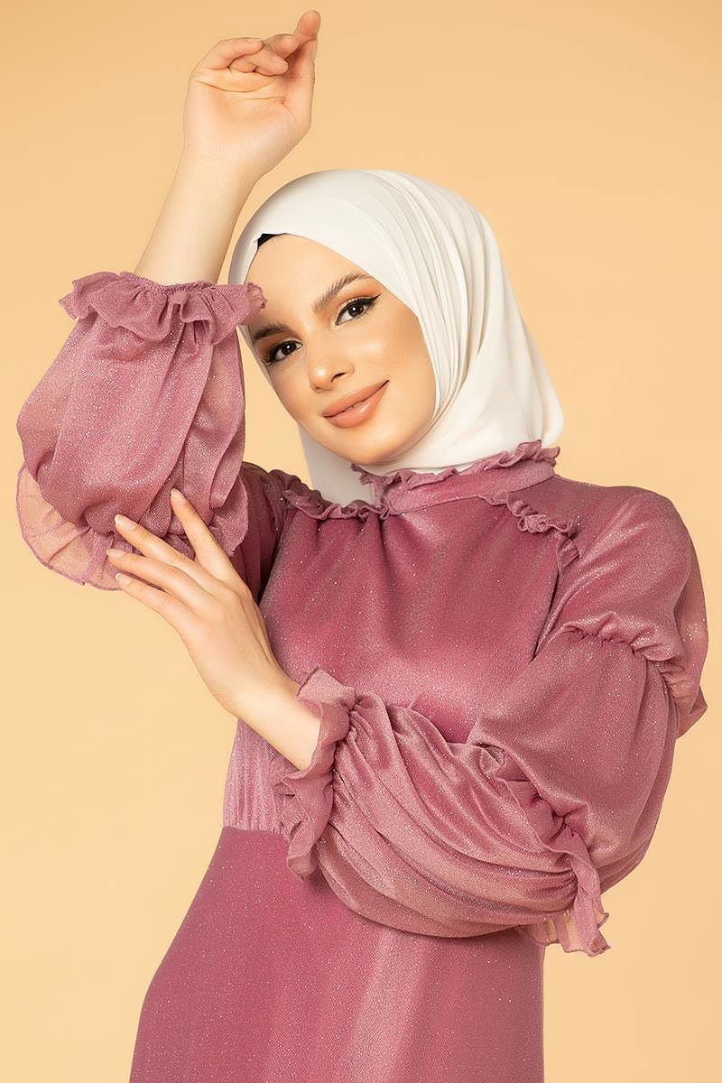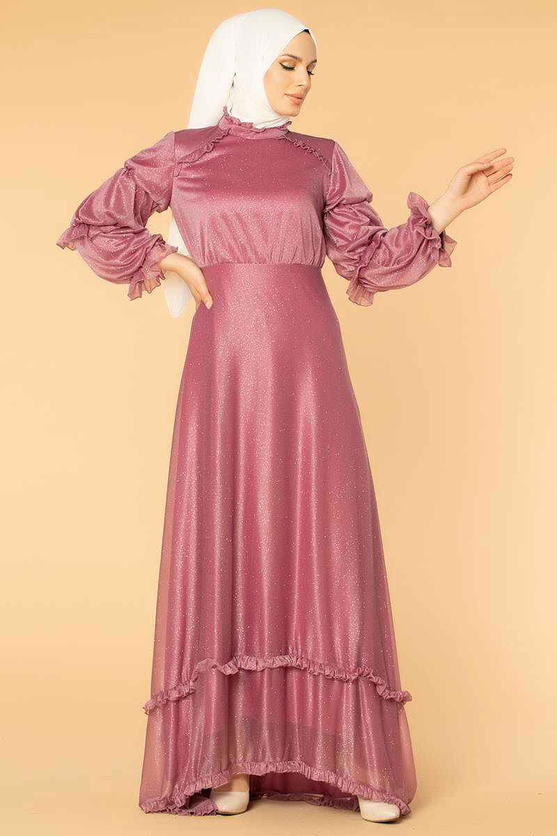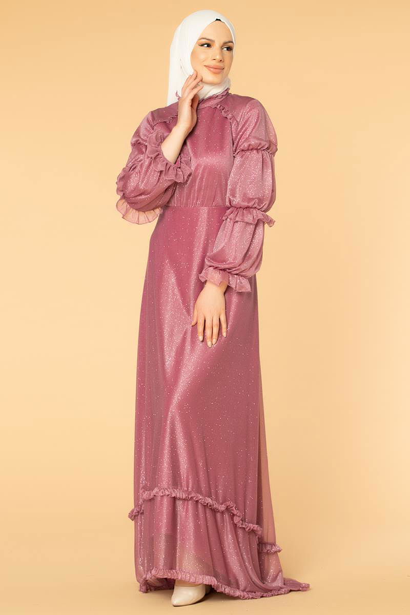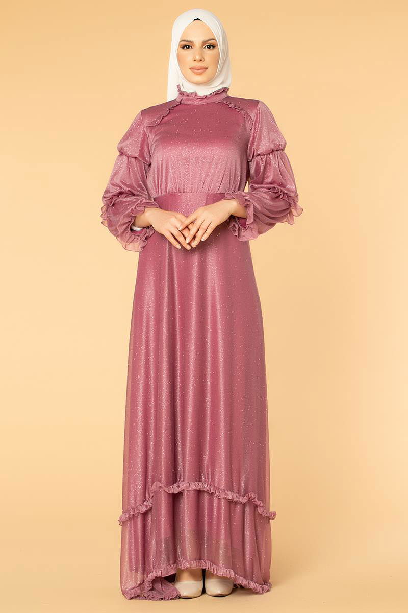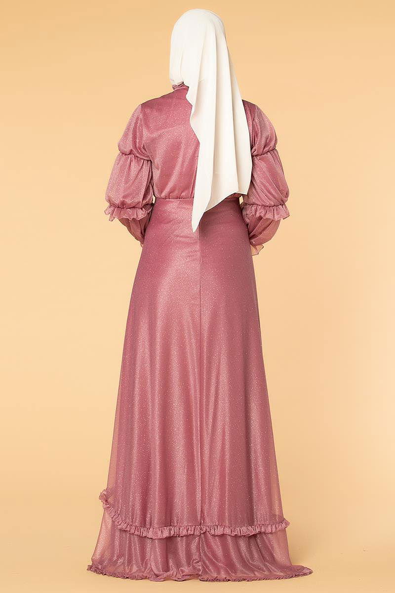 Fırfır Detay Kuyruklu Tesettür Abiye-0620 Gülkurusu