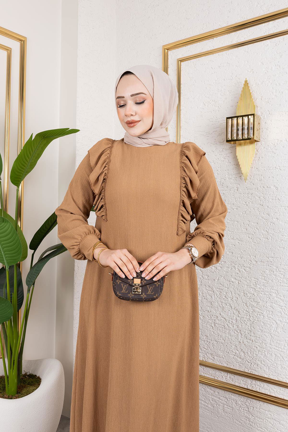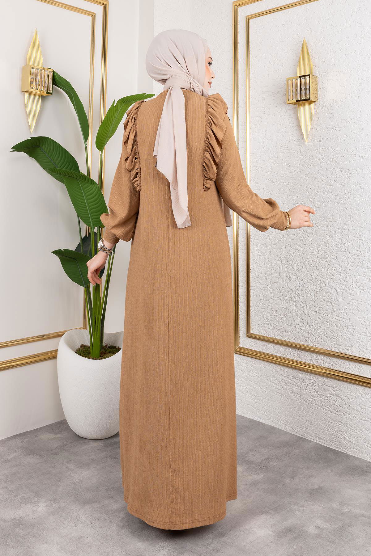 Fırfır Detaylı Tesettür Elbise-5025 Latte