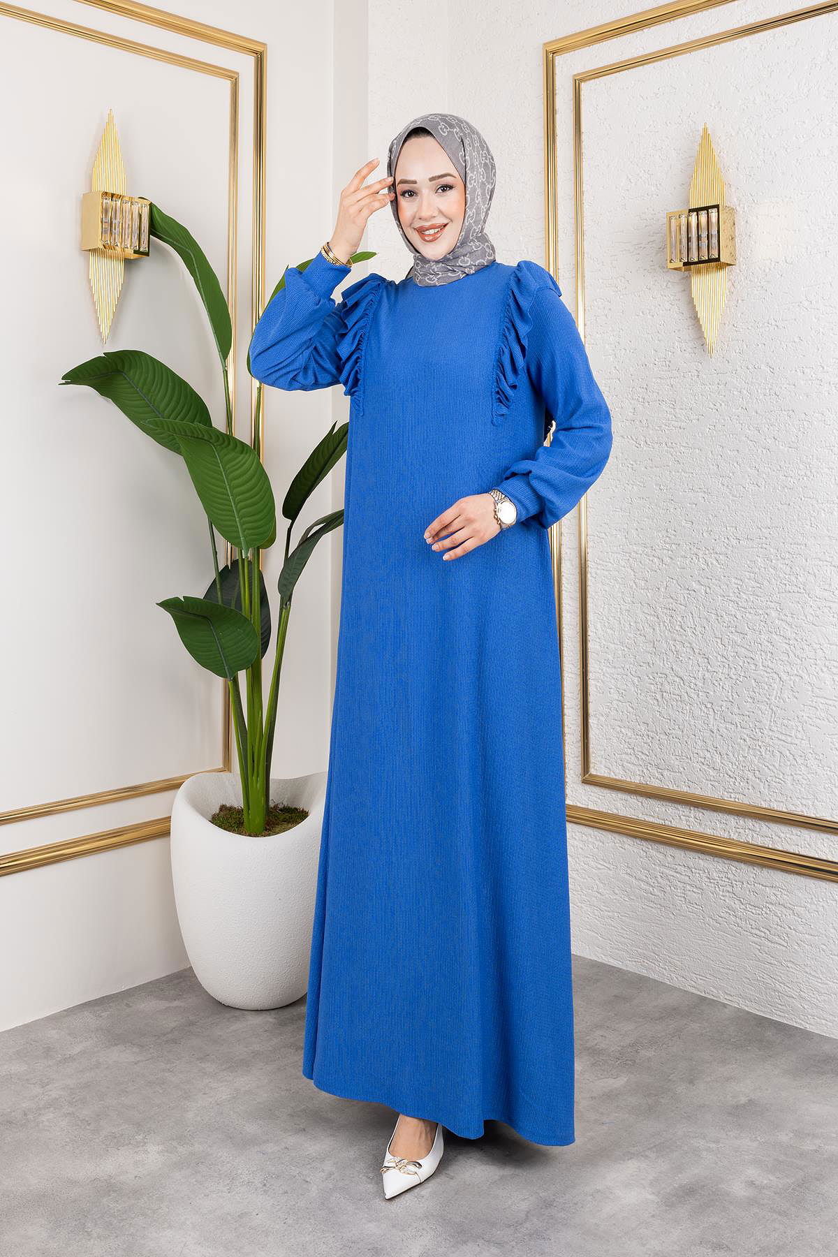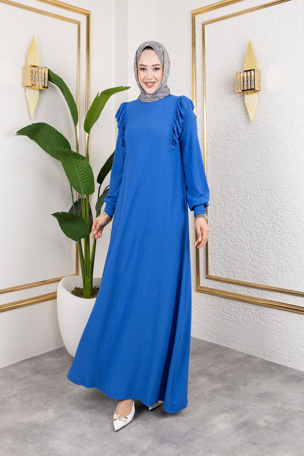 Fırfır Detaylı Tesettür Elbise-5025 Saks mavisi