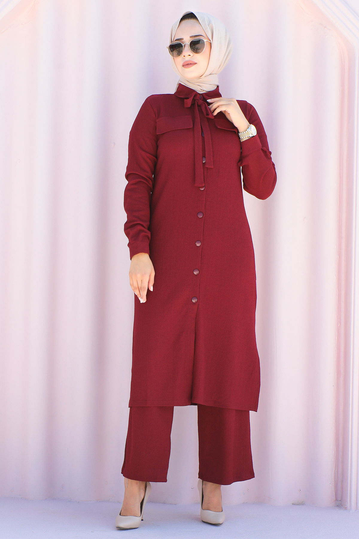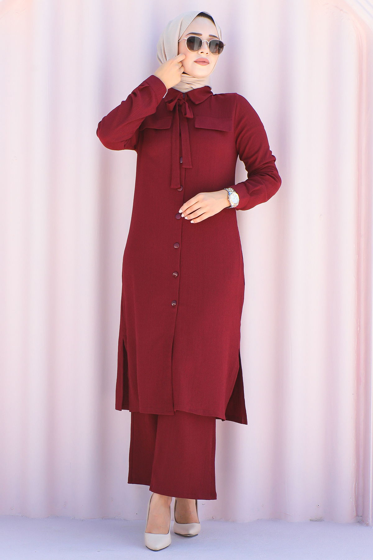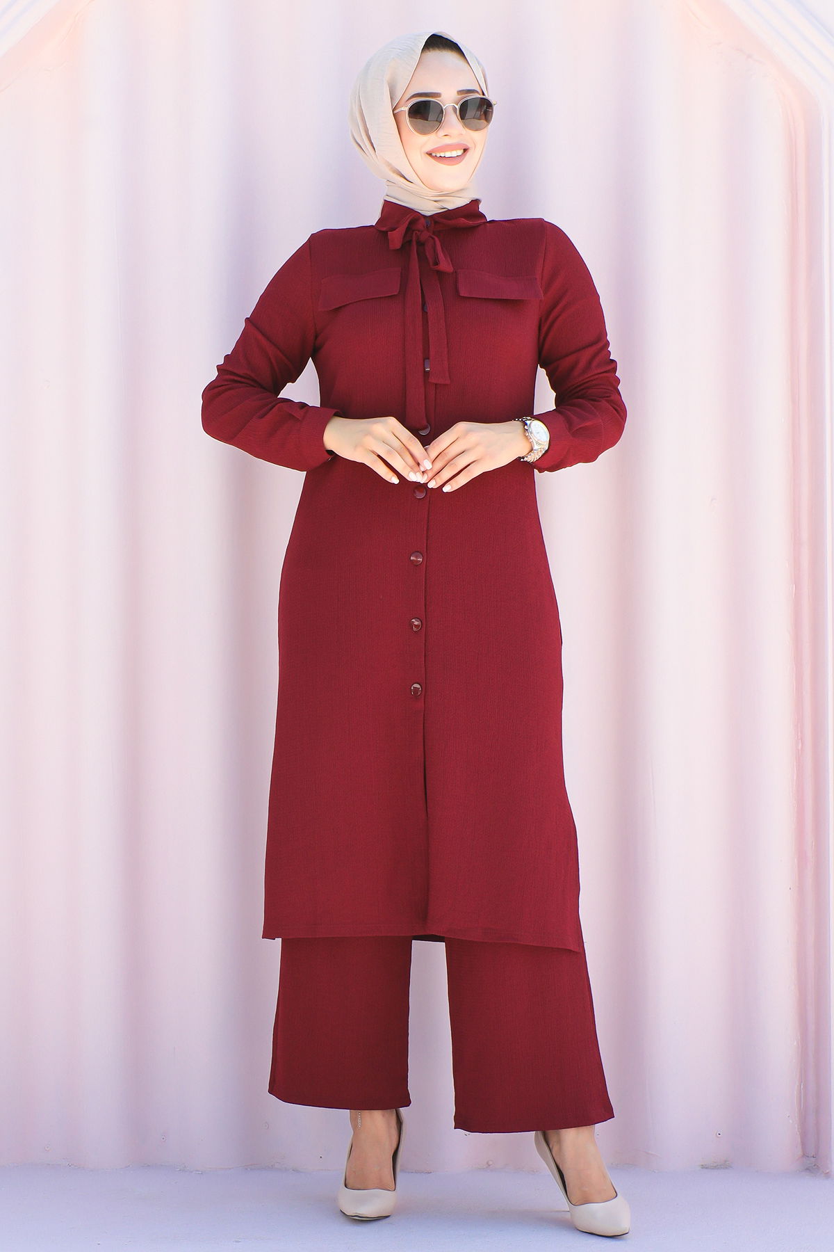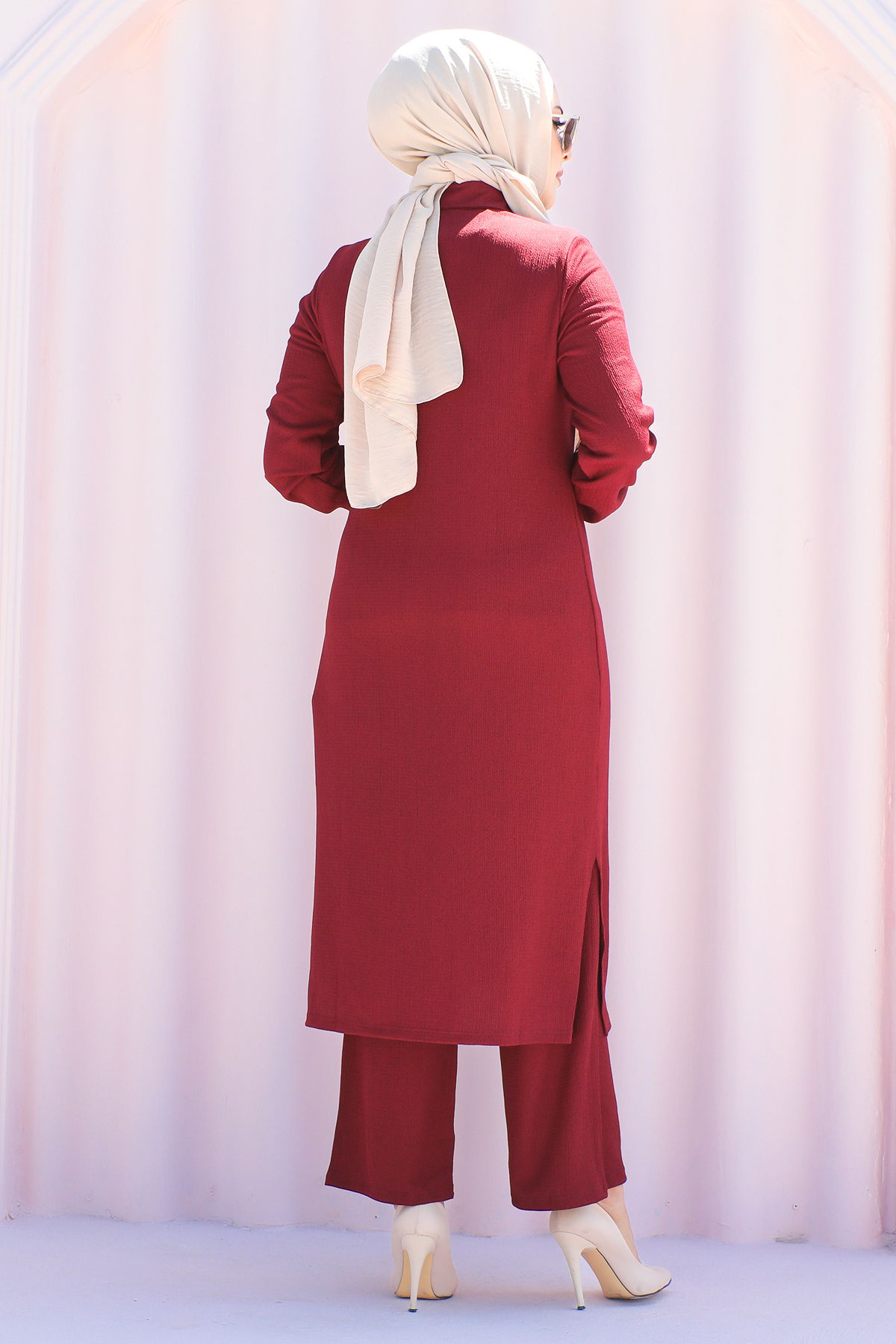 Flar Detaylı İkili Tesettür Takım-3151 Bordo