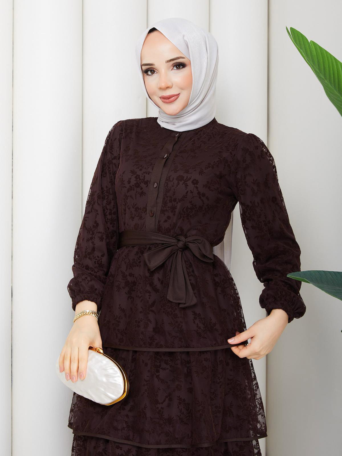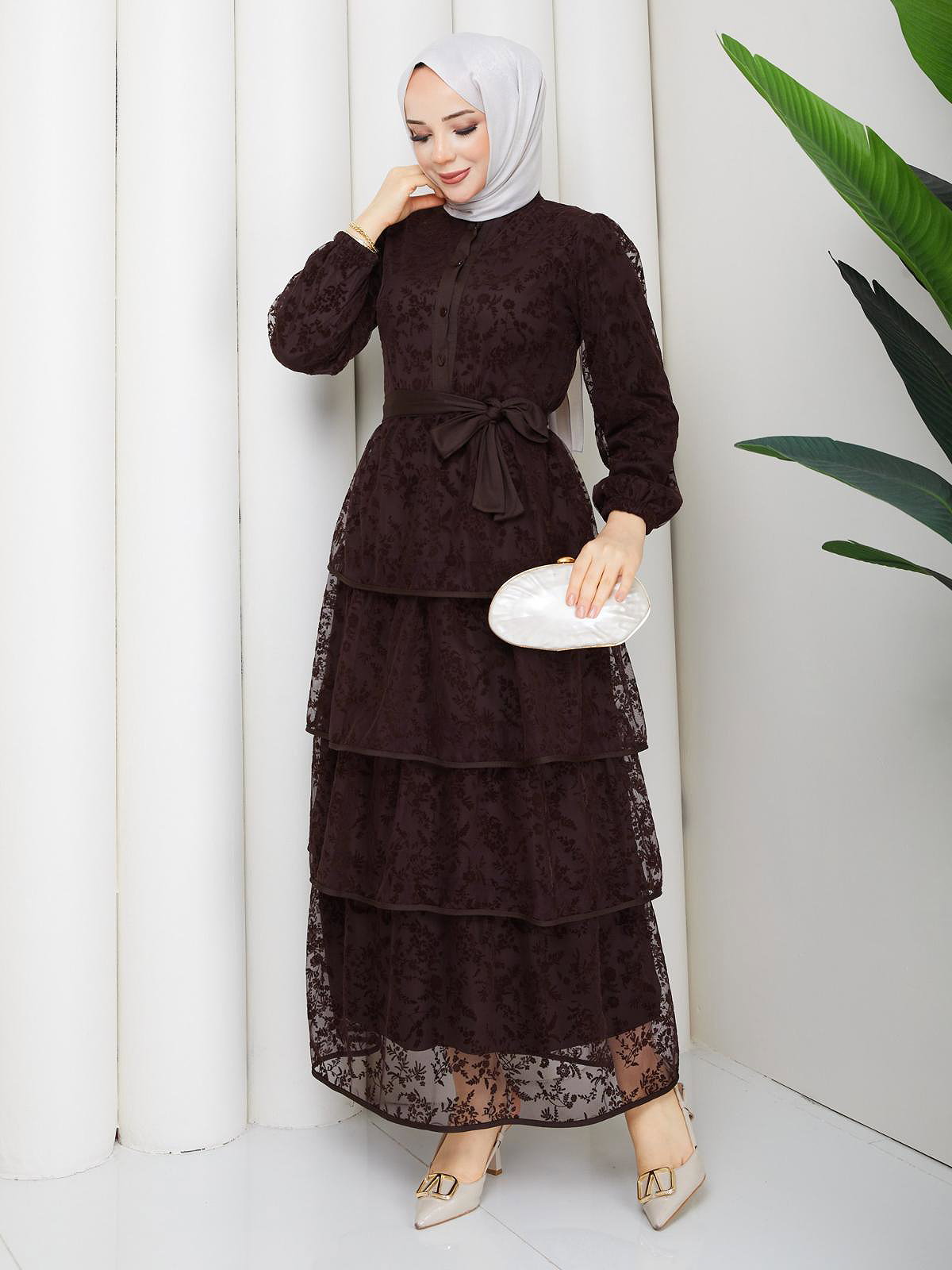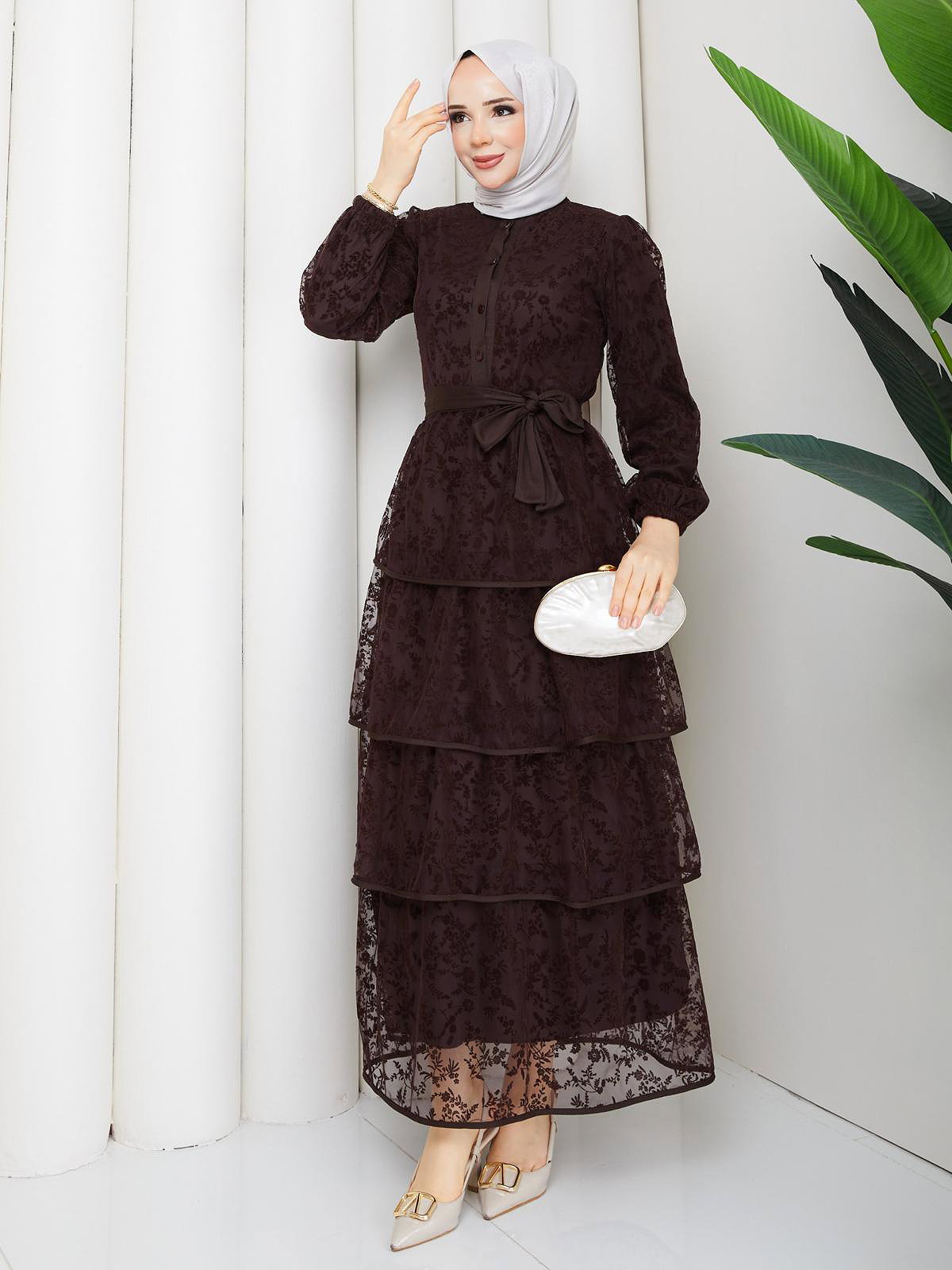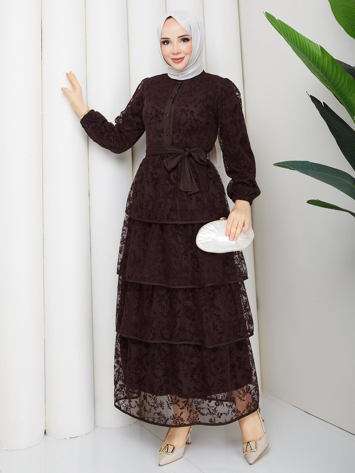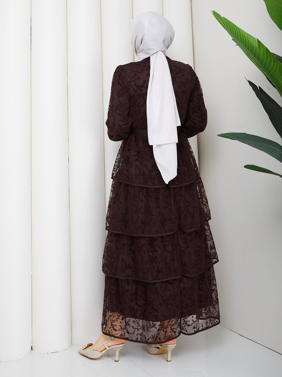 Flog Baskı Eteği Katlı Elbise- 5180 Kahve rengi